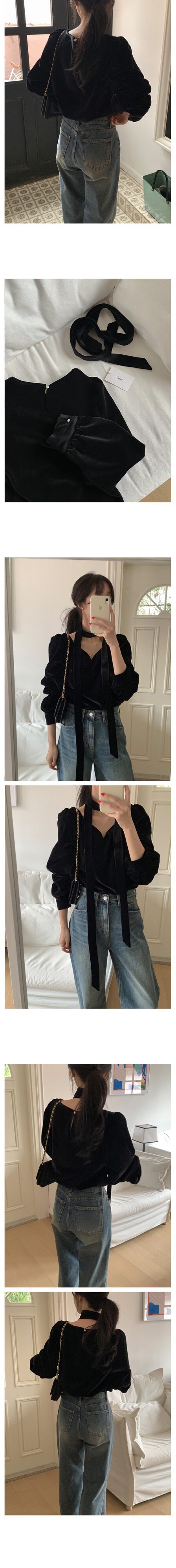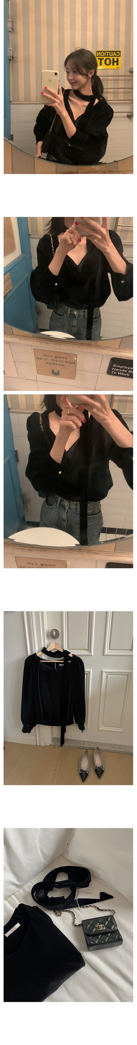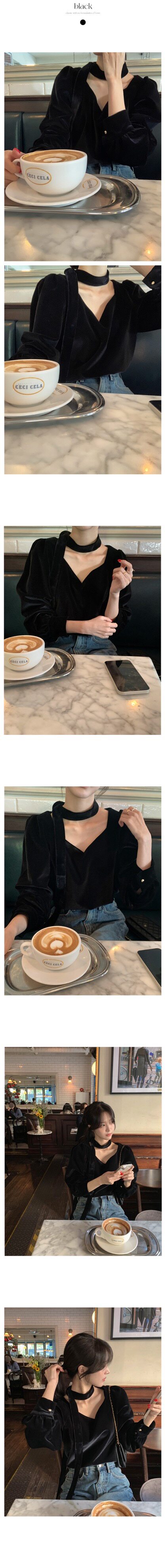 法式高級感洋氣氣質百搭長袖掛脖V領別致獨特黑色絲絨襯衫上衣女