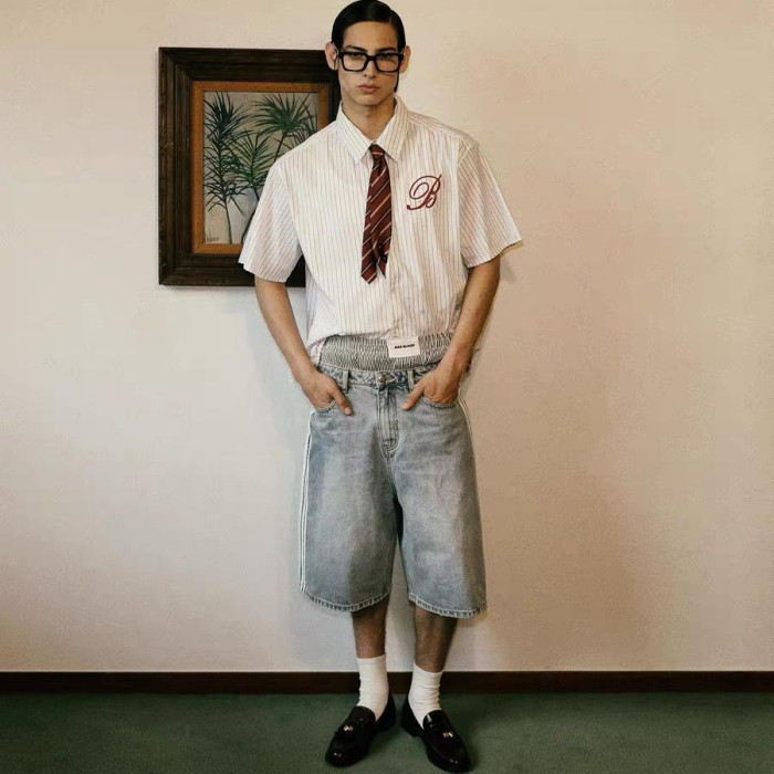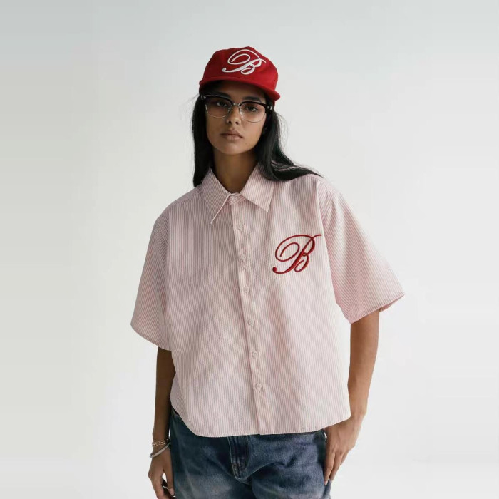 韓國badblood美式復古繙領條紋短袖襯衫寬鬆刺綉短褲休閒套裝