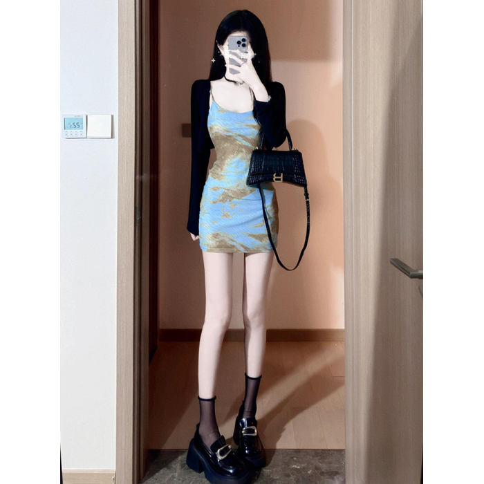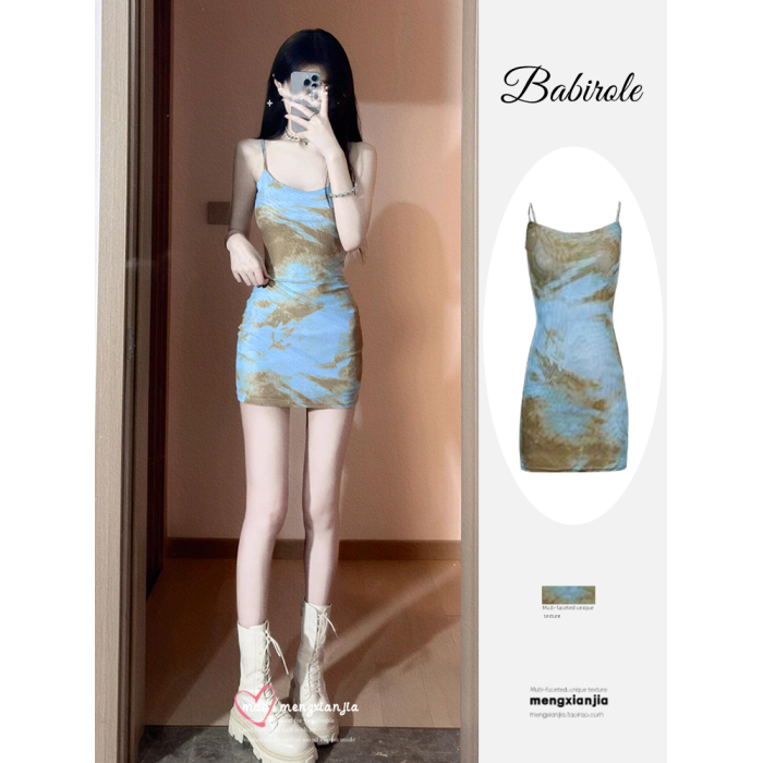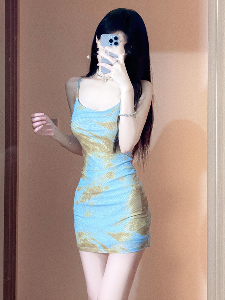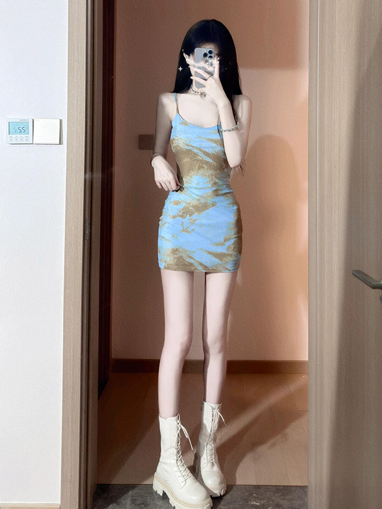 小個子顯高吊帶連衣裙夏裝2025新款女裝收腰修身紥染印花包臀短裙