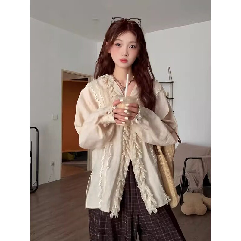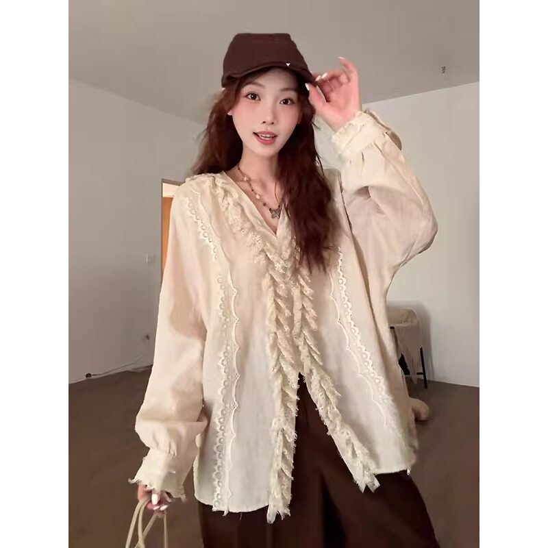 大碼設計感蕾絲拼接開叉v領長袖襯衫女秋季新款胖mm寬鬆顯瘦上衣