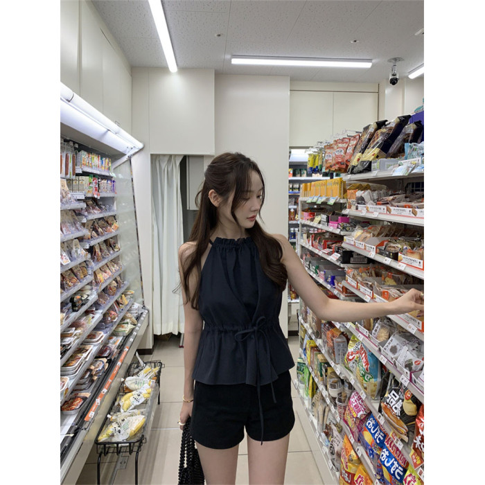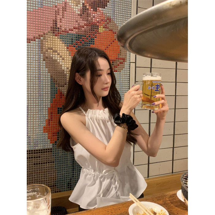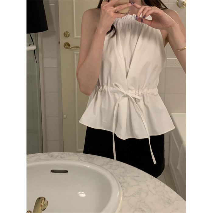 韓版洋氣氣質甜美百搭抽繩掛脖系帶露肩短款吊帶背心襯衫上衣女夏