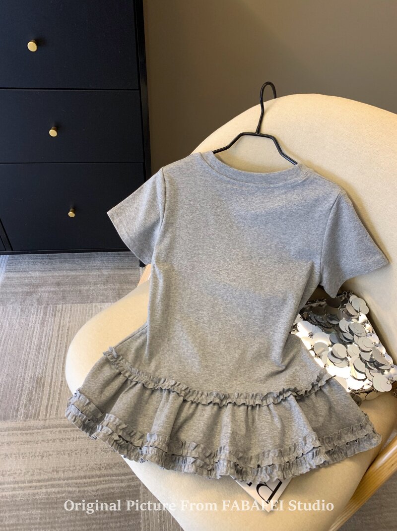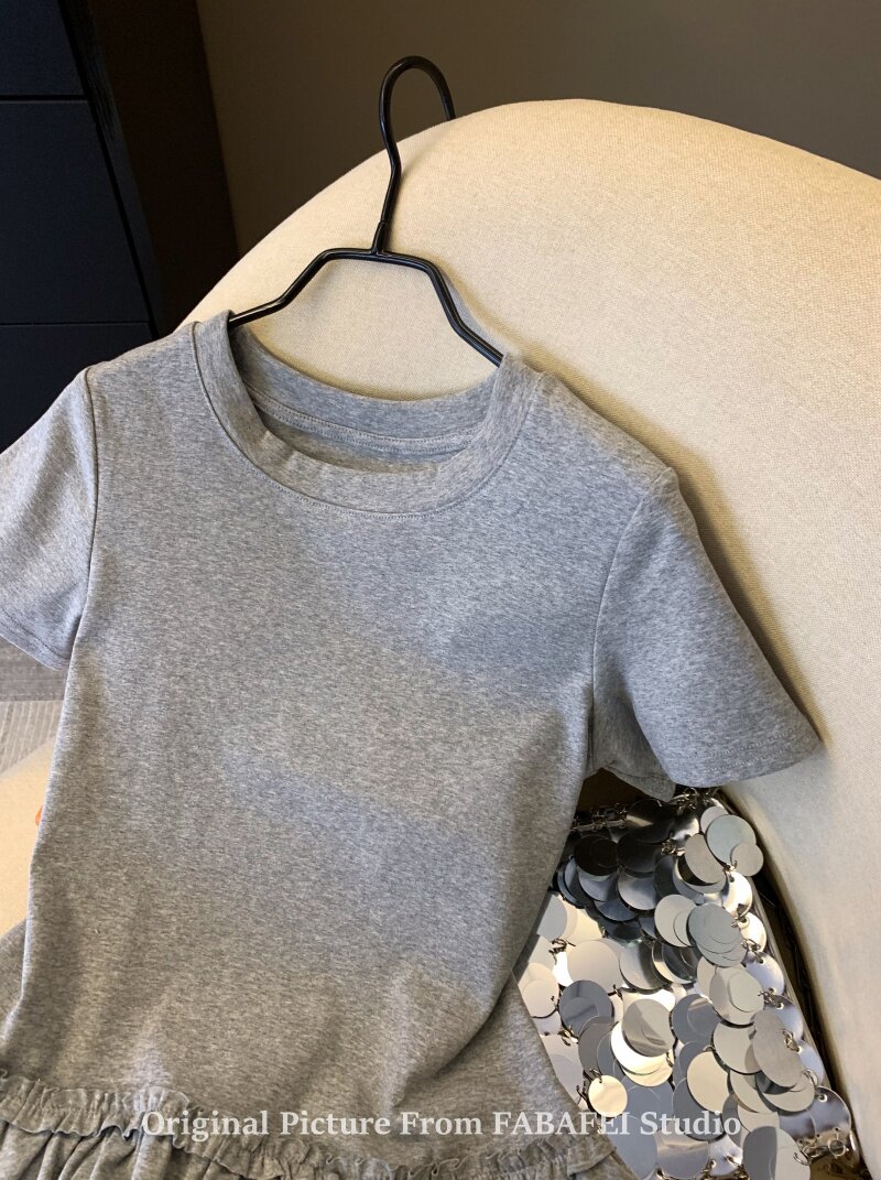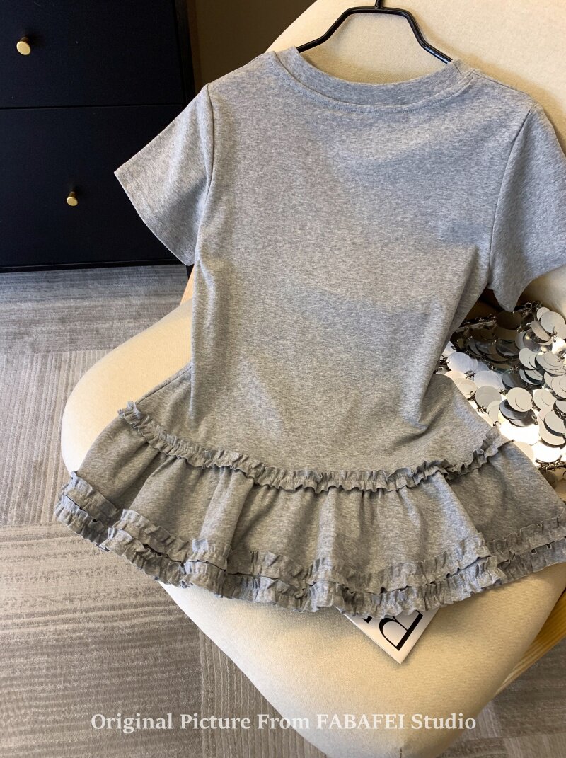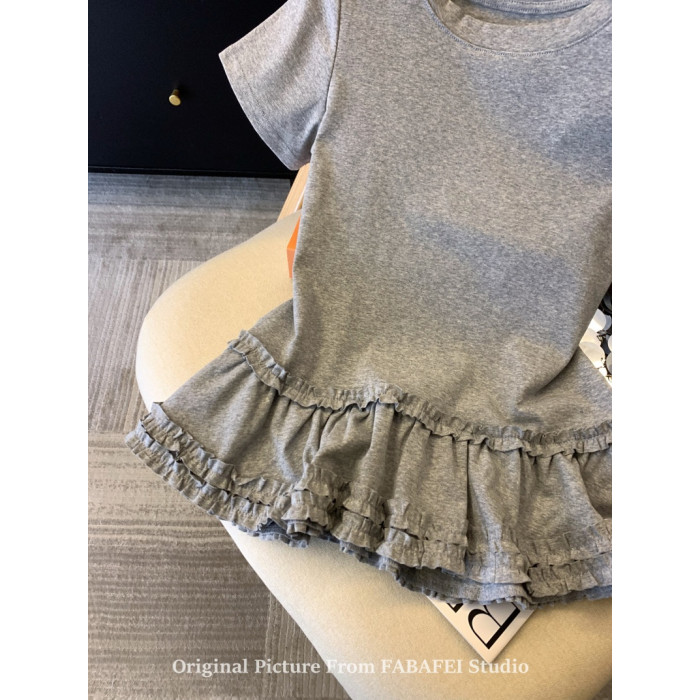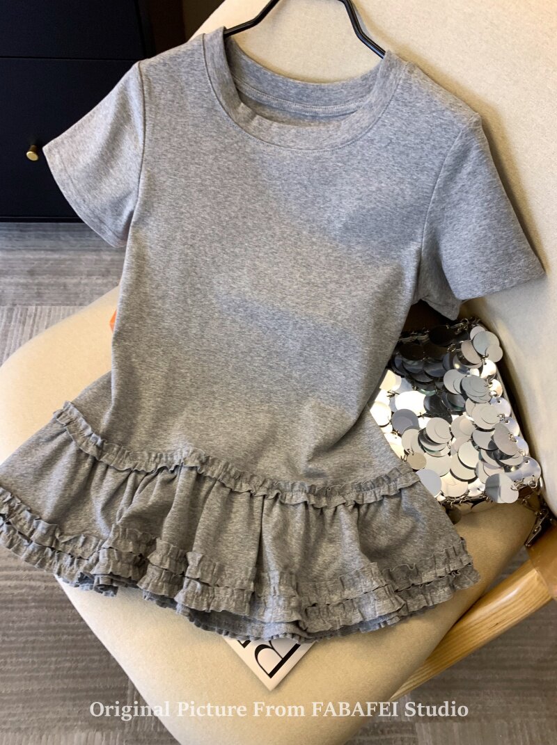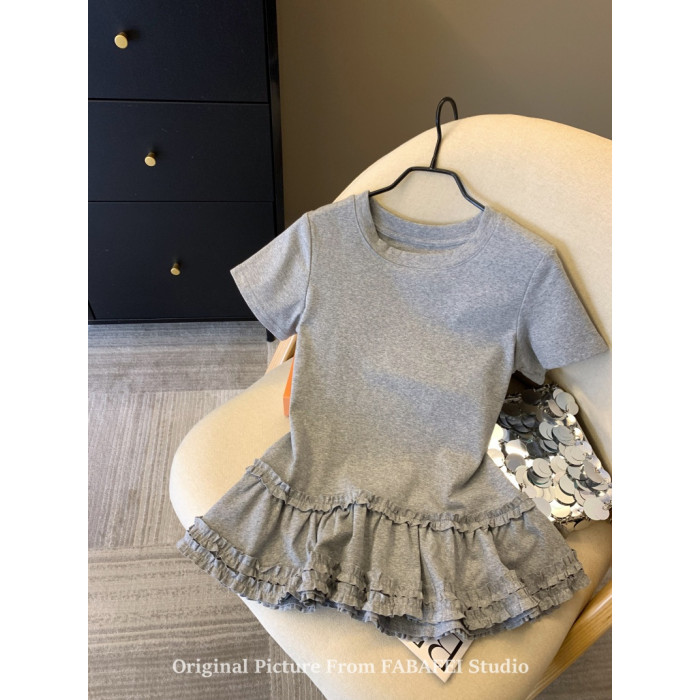 自畱爆款推薦~灰色下擺木耳邊短袖t恤女夏2026韓版遮肚子裙擺上衣