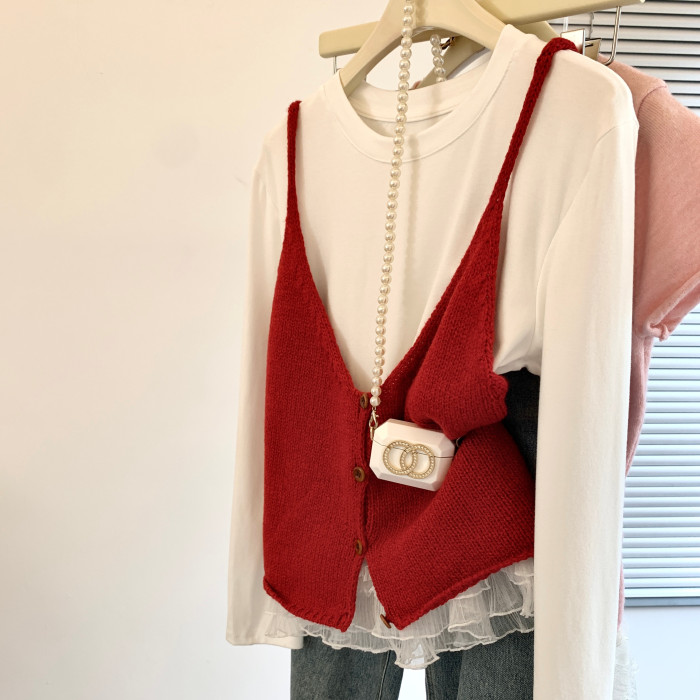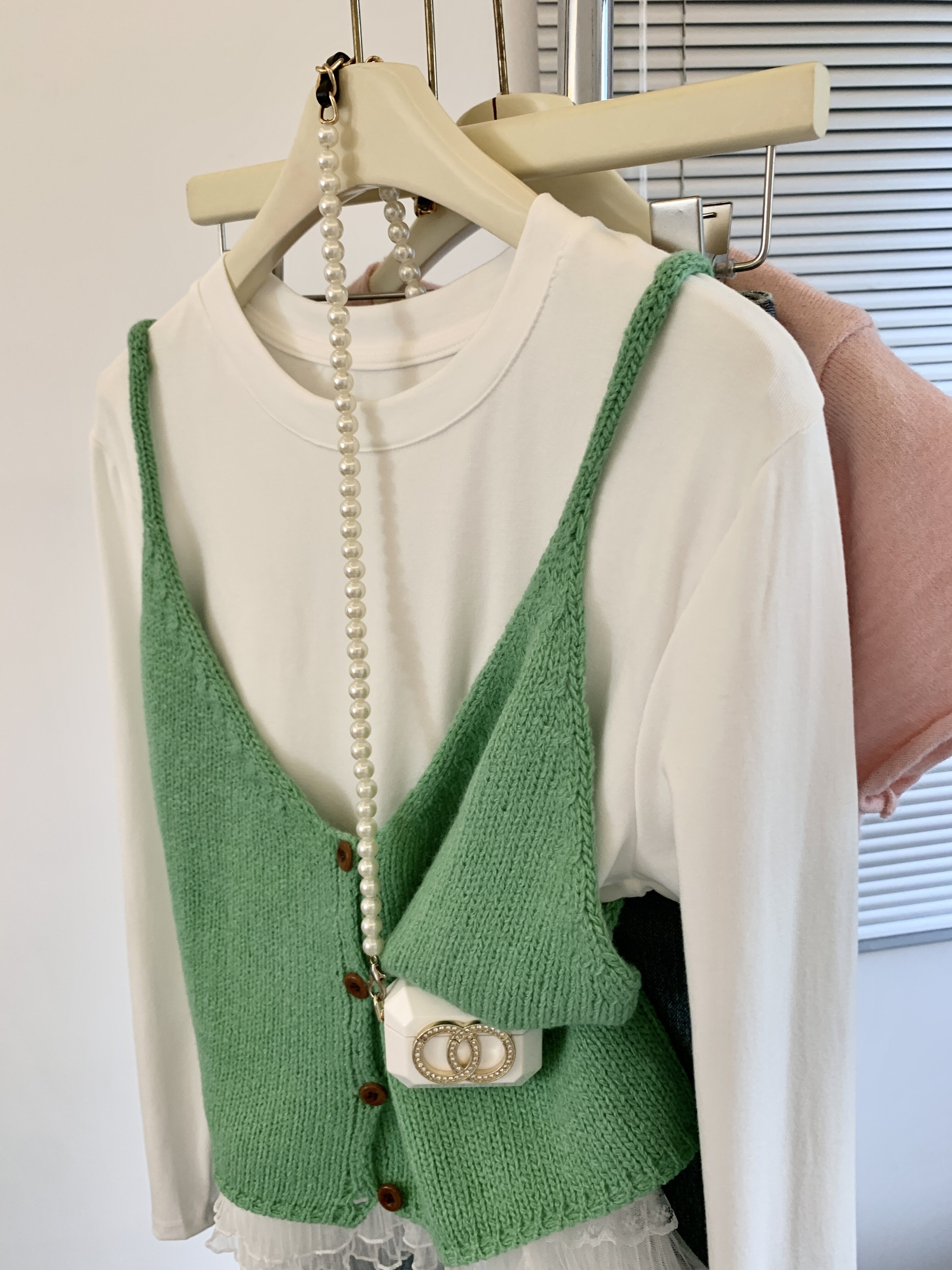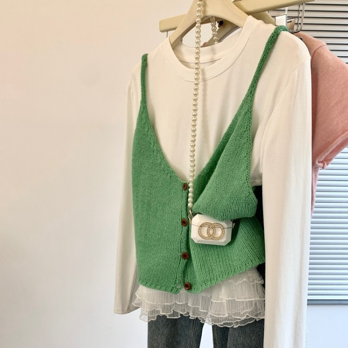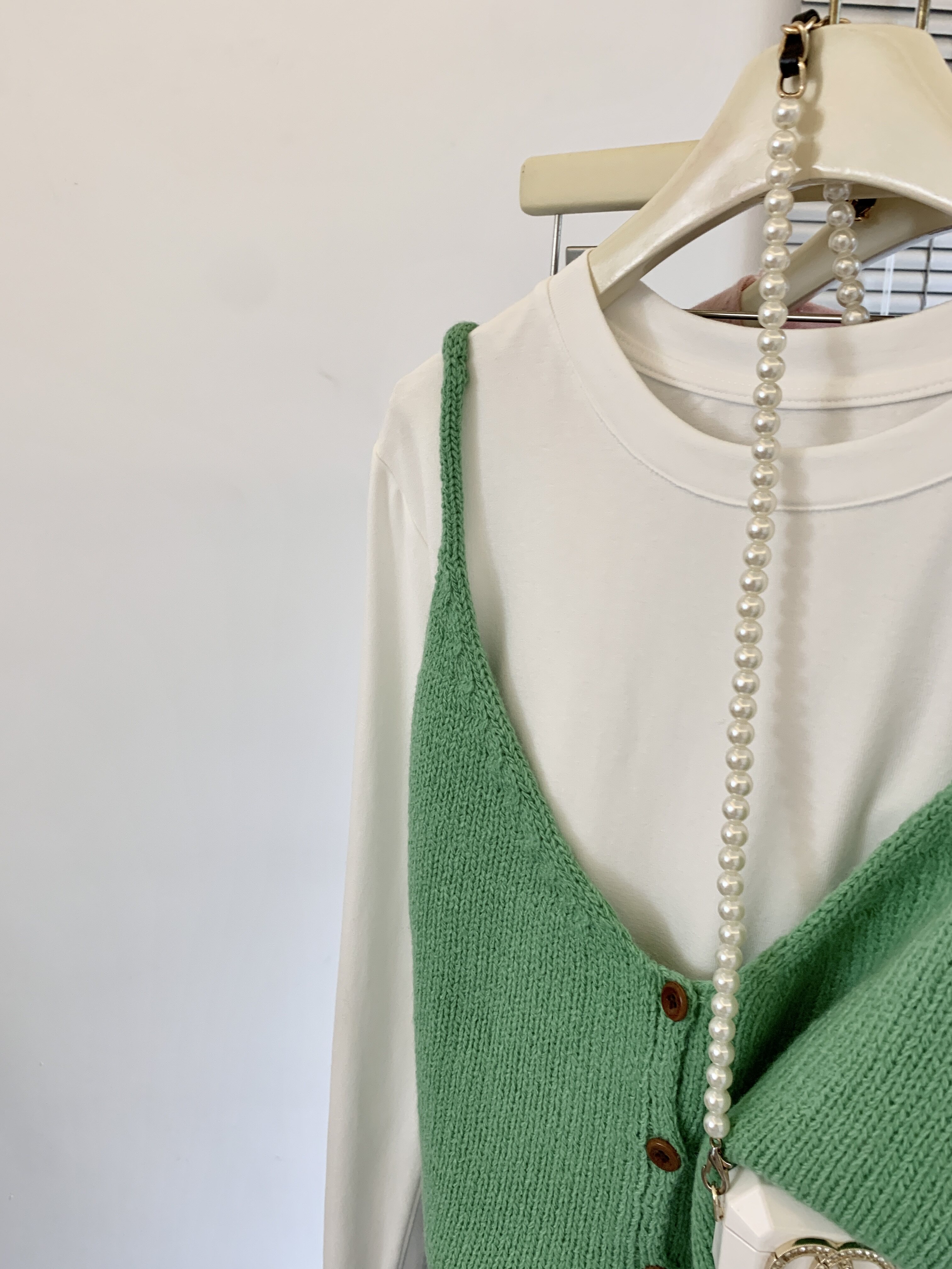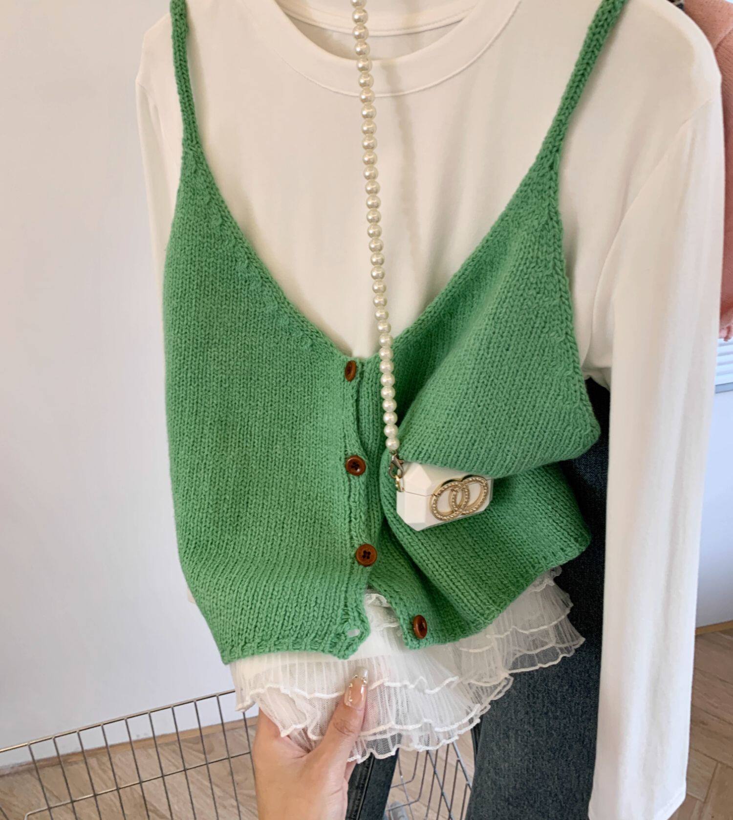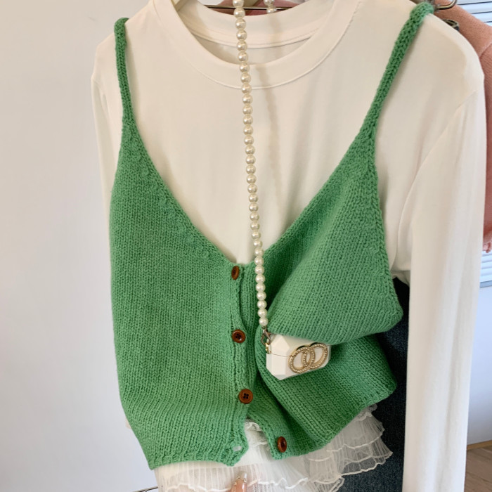 專櫃撤廻剪標韓系單排釦針織小吊帶女春季新款白色T恤曡穿兩件套