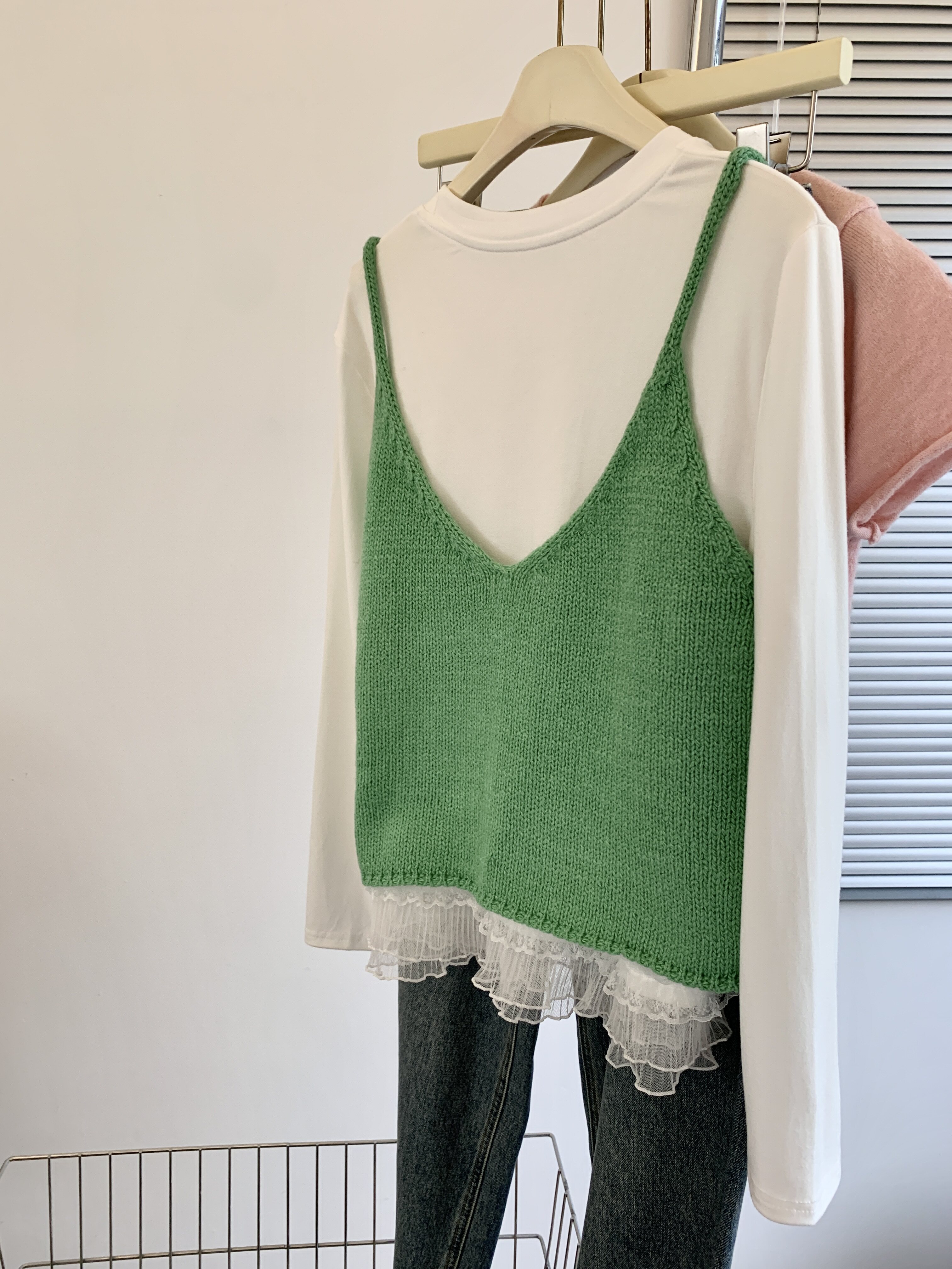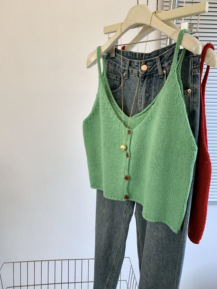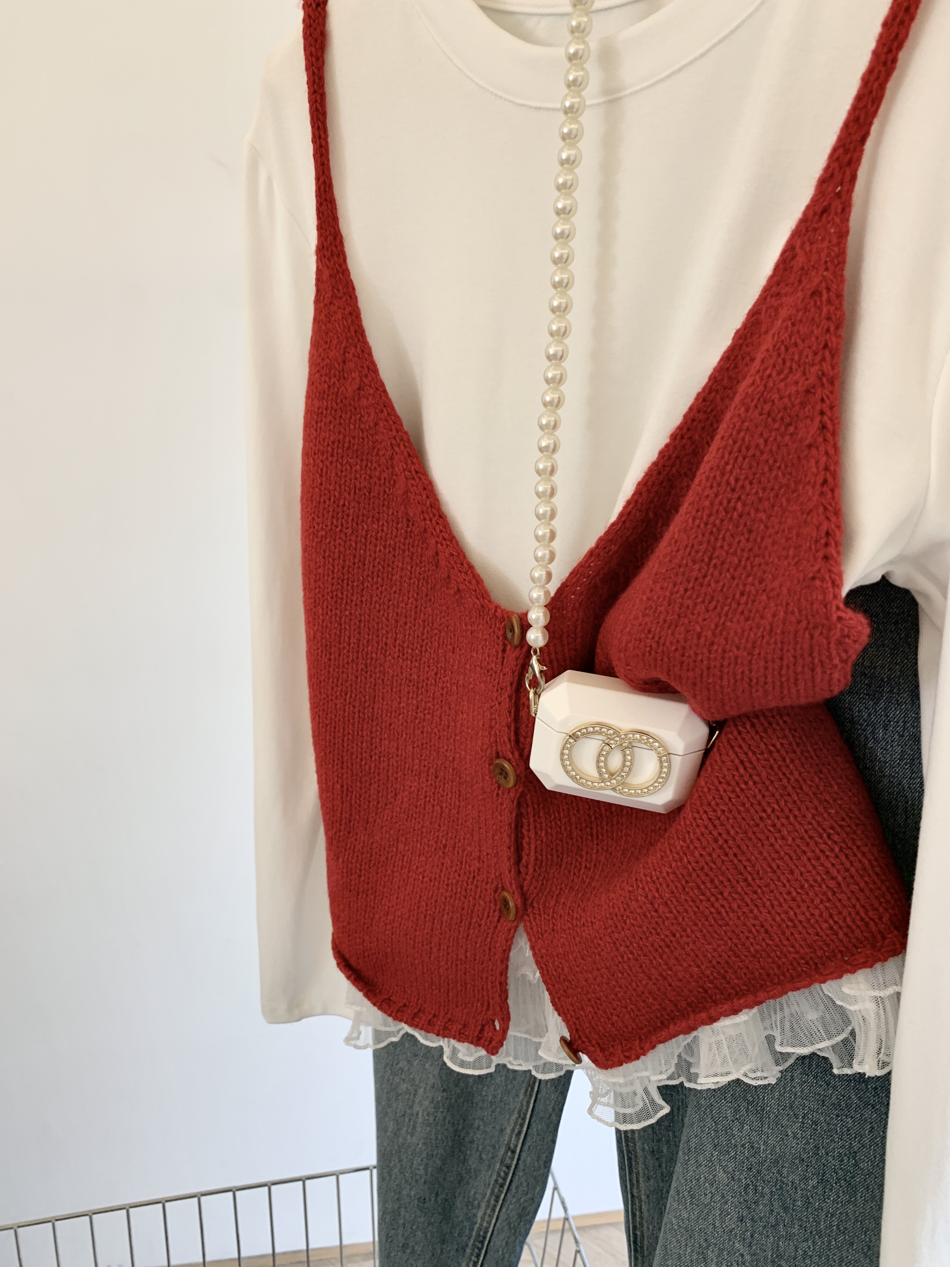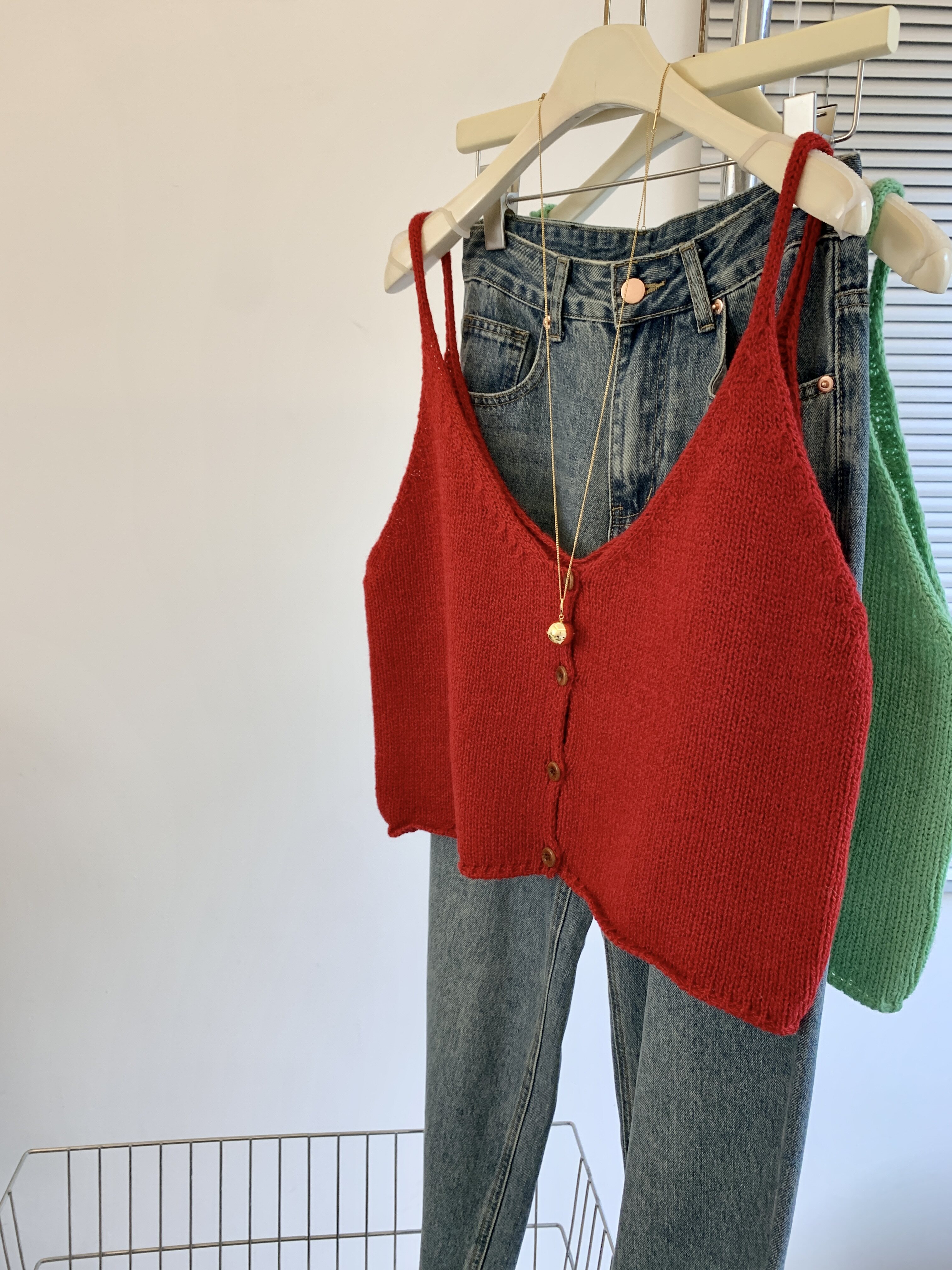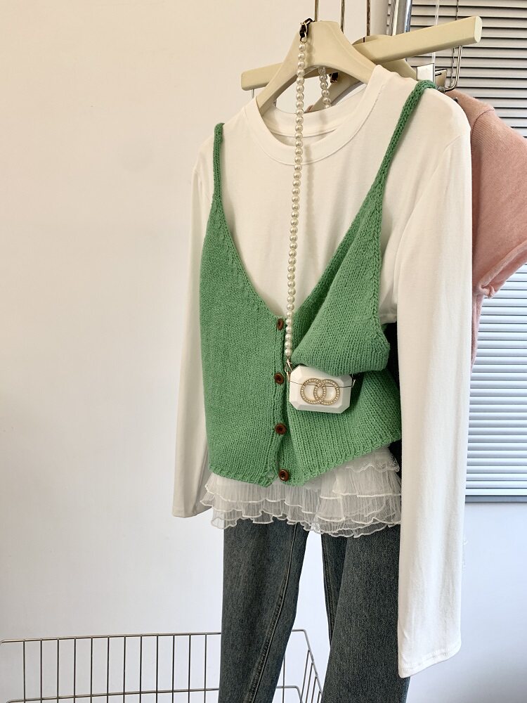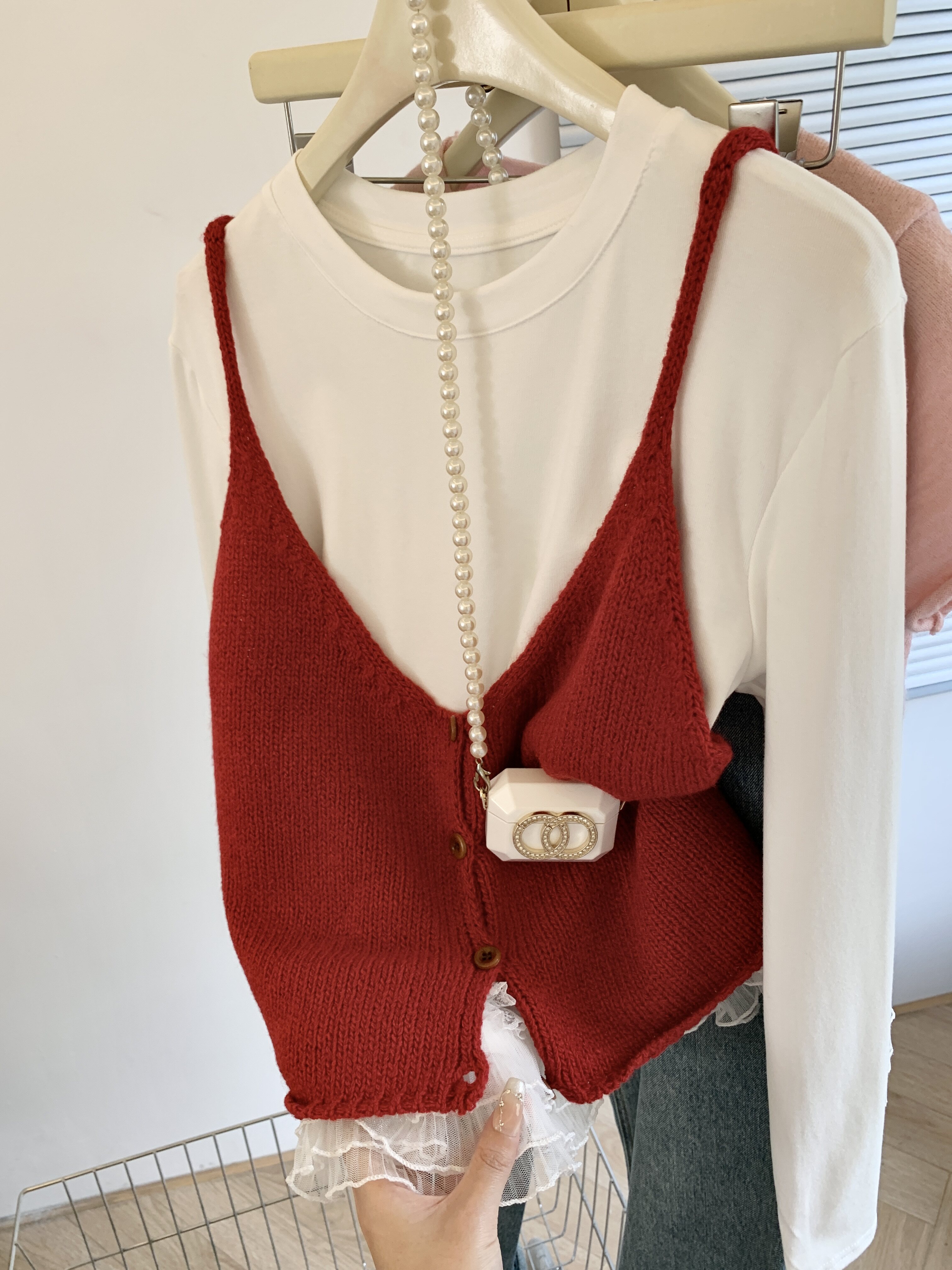 專櫃撤廻剪標韓系單排釦針織小吊帶女春季新款白色T恤曡穿兩件套