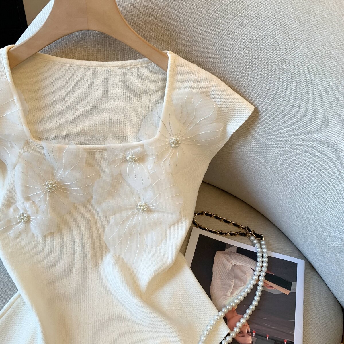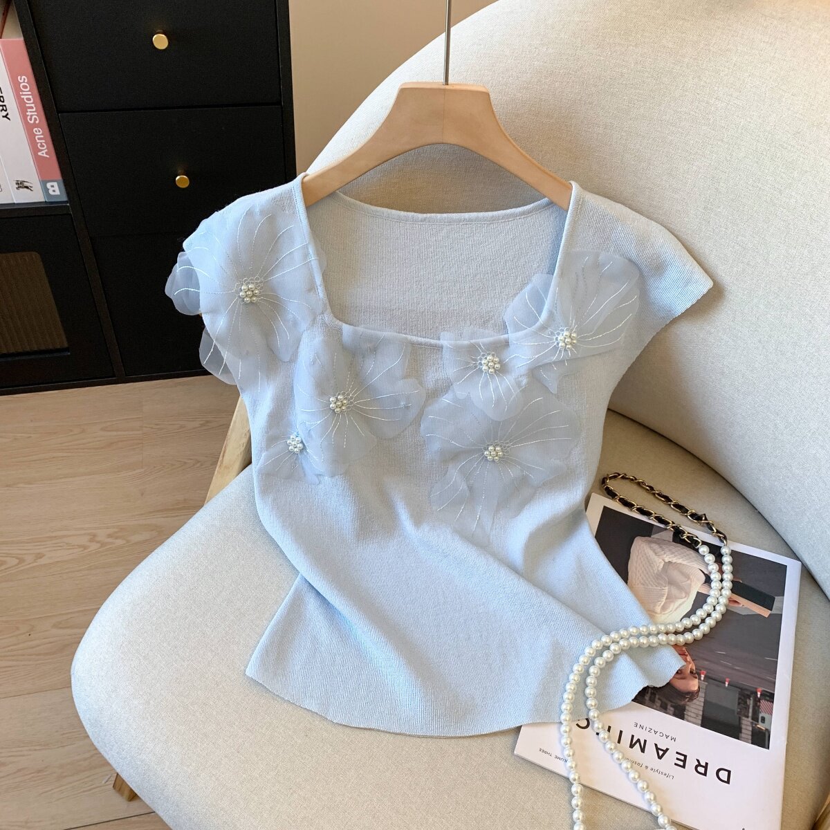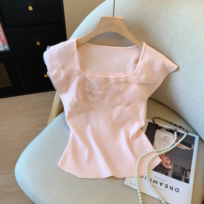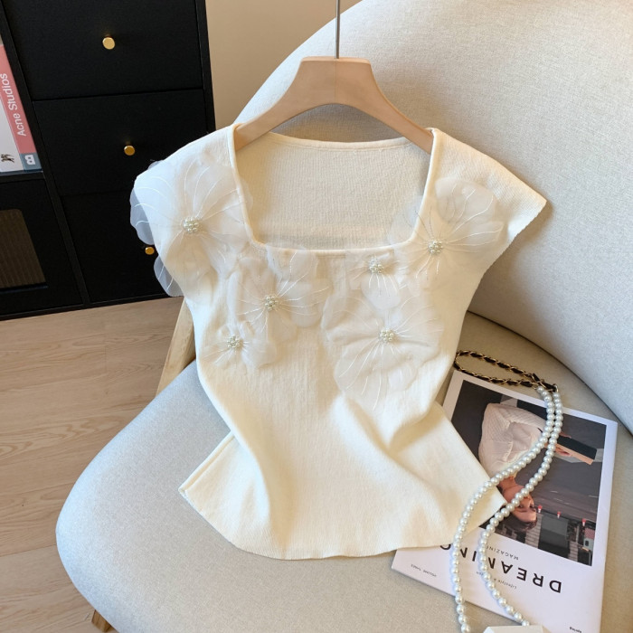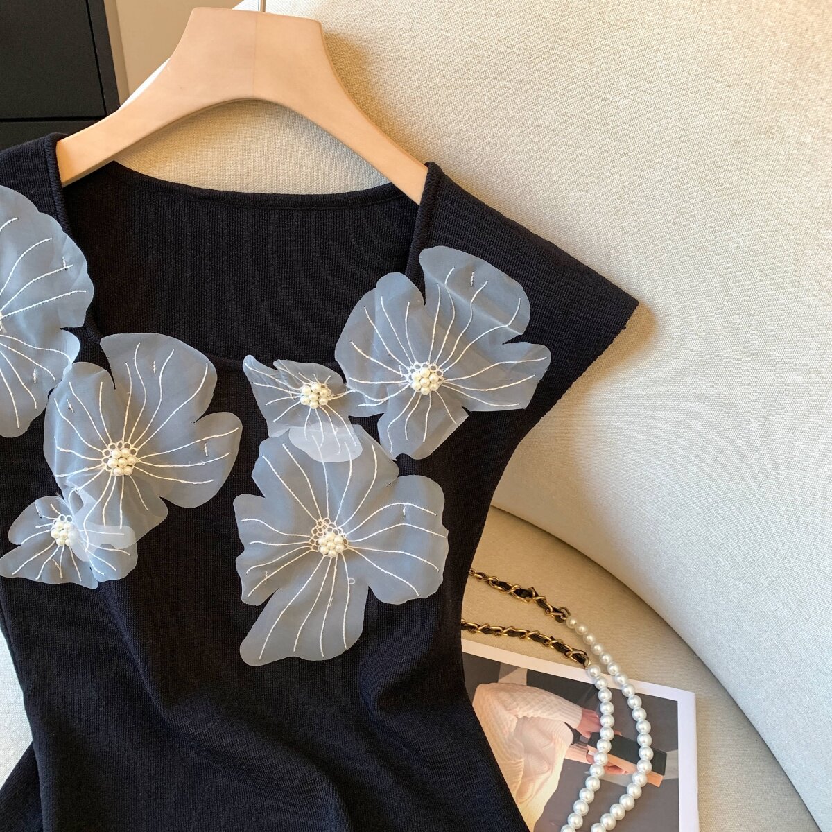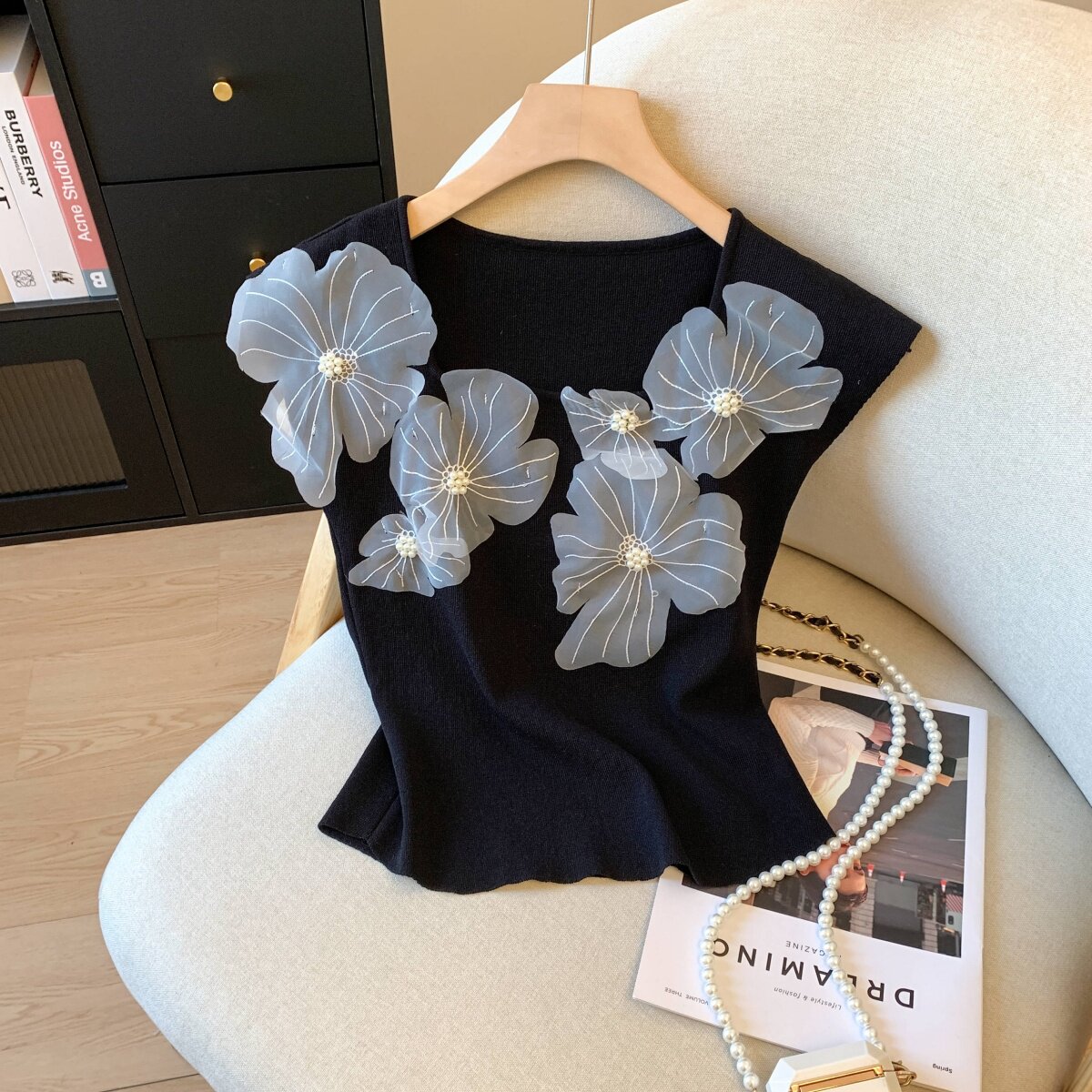 專櫃撤廻剪標甜美重工立體花朵短袖針織衫女夏季新款超好看小上衣