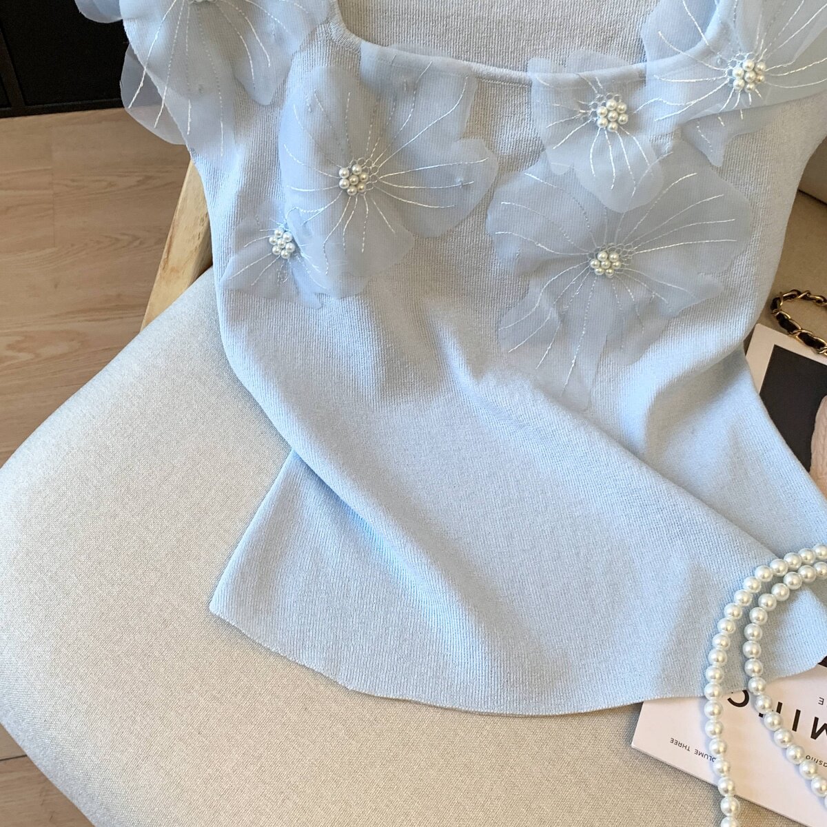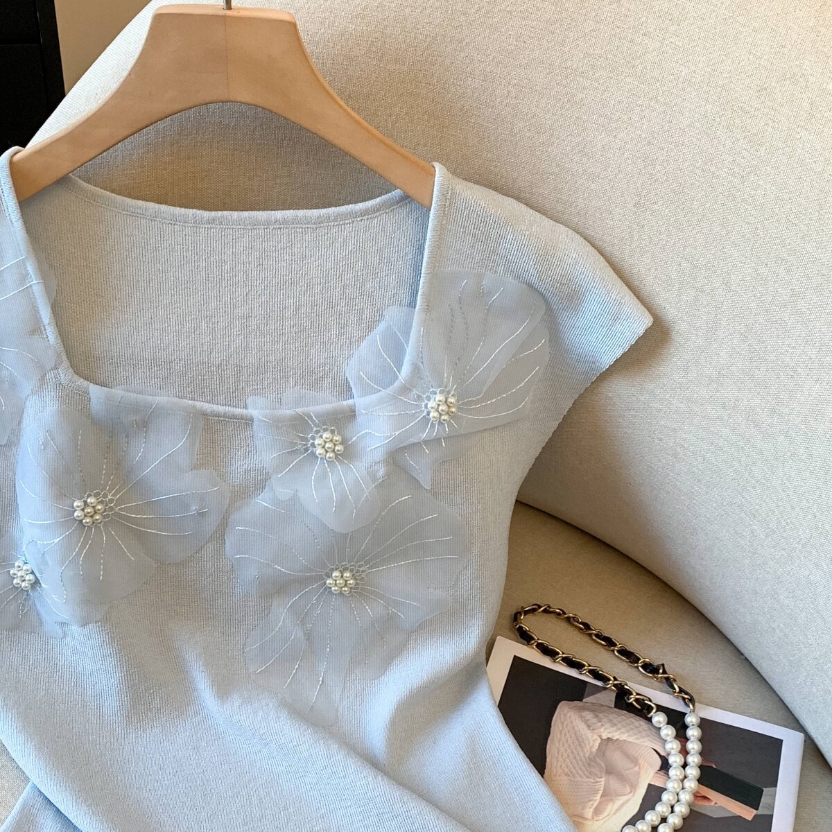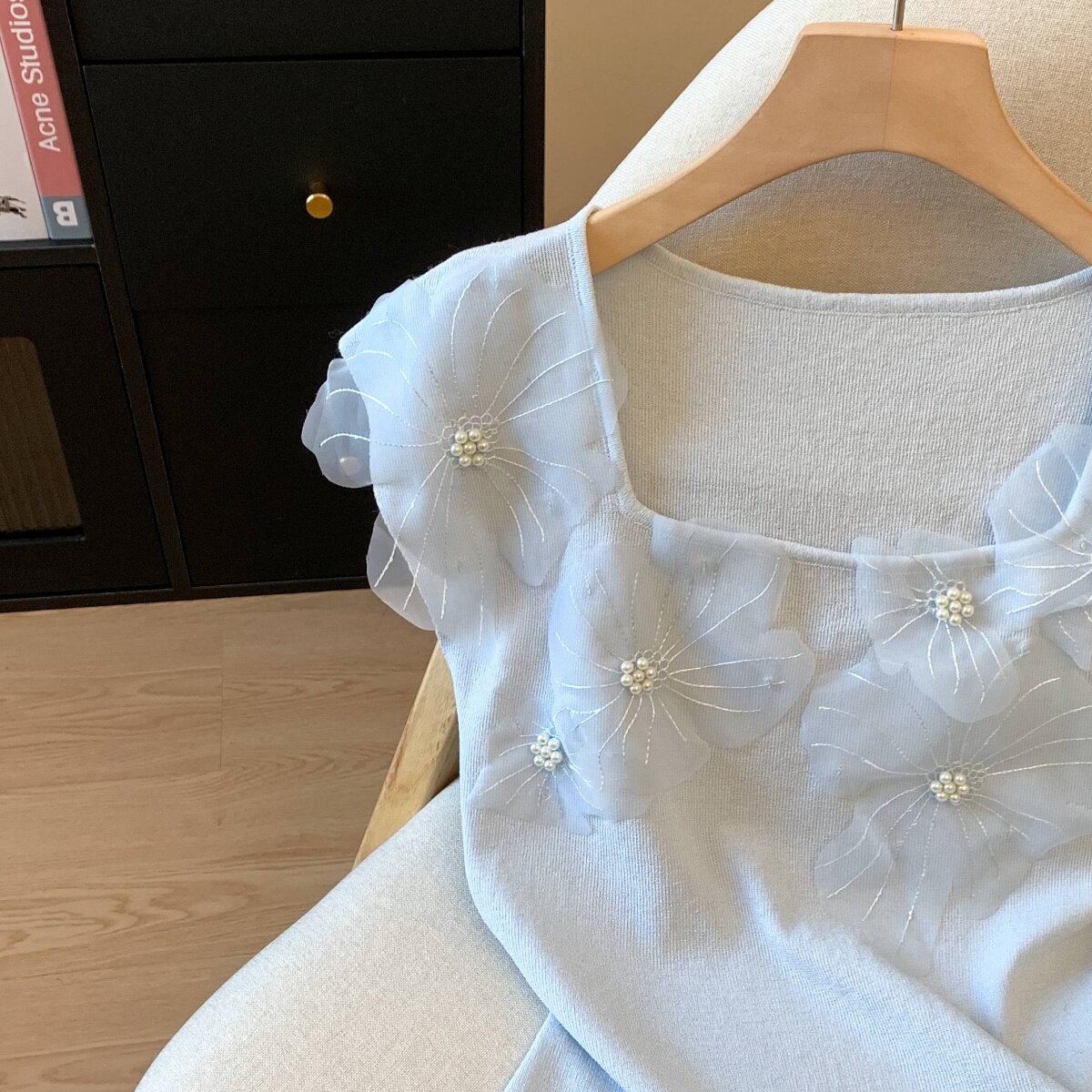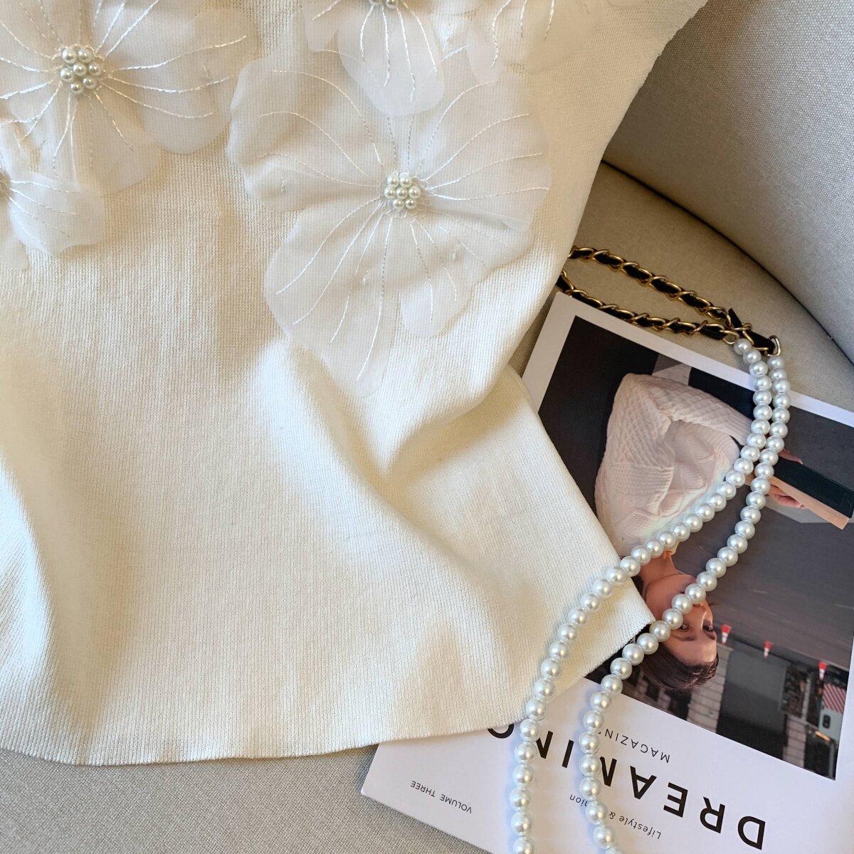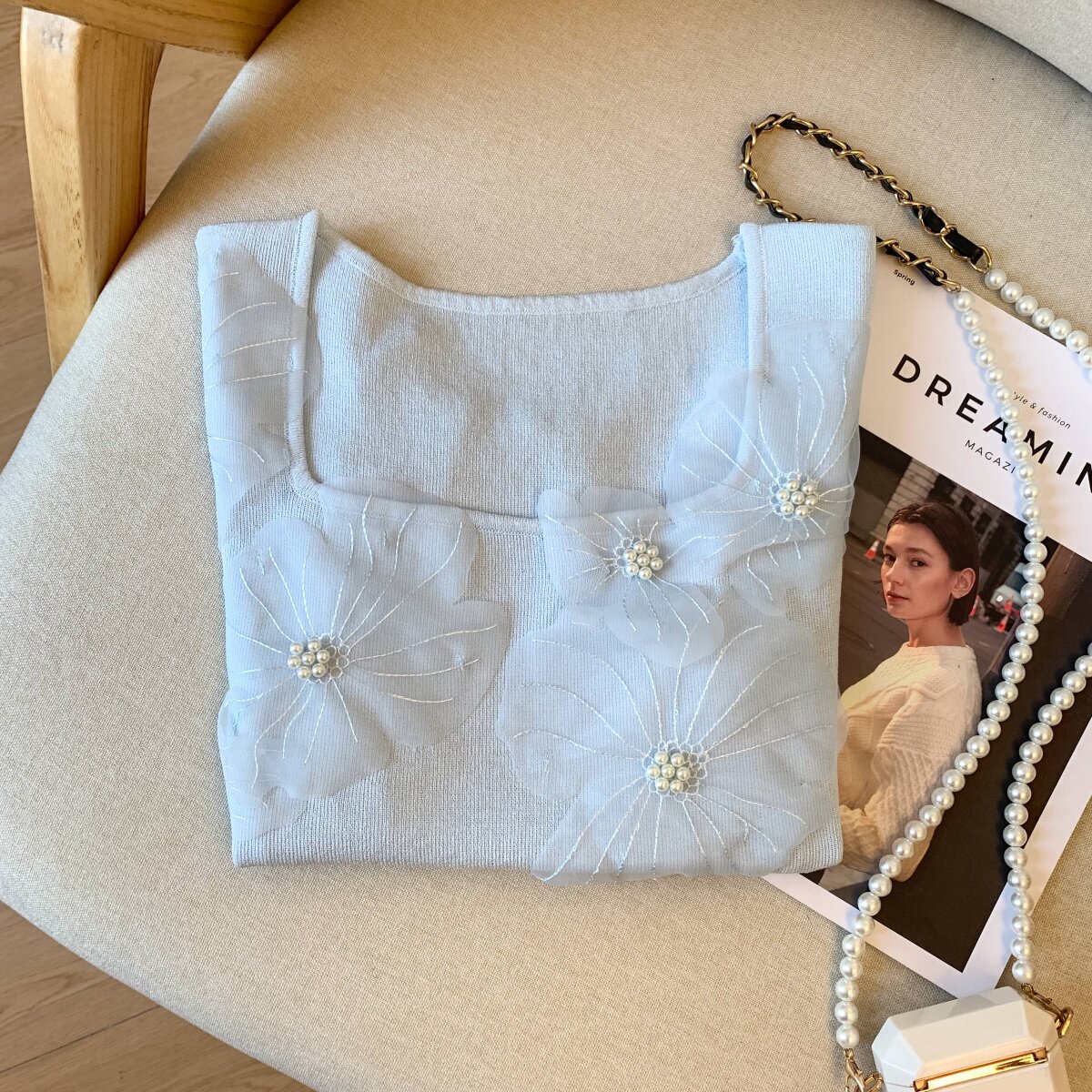 專櫃撤廻剪標甜美重工立體花朵短袖針織衫女夏季新款超好看小上衣