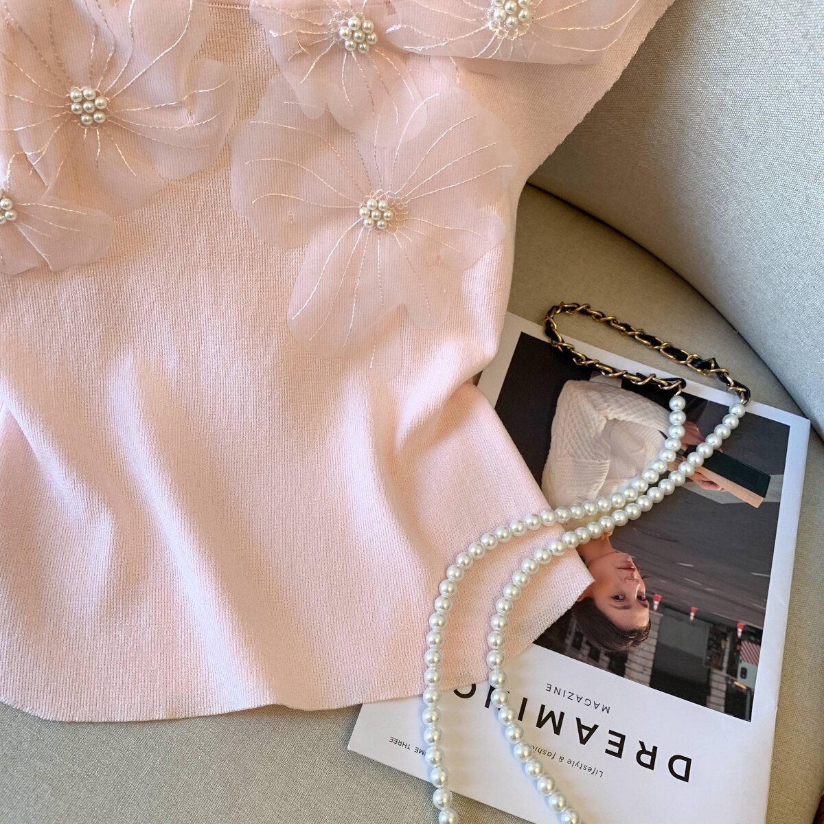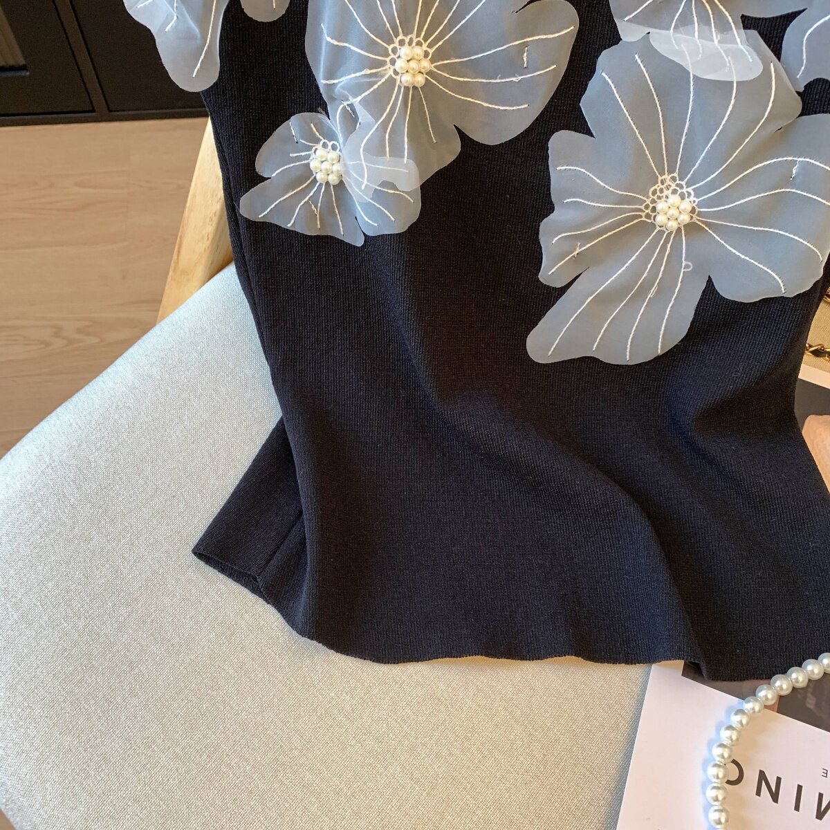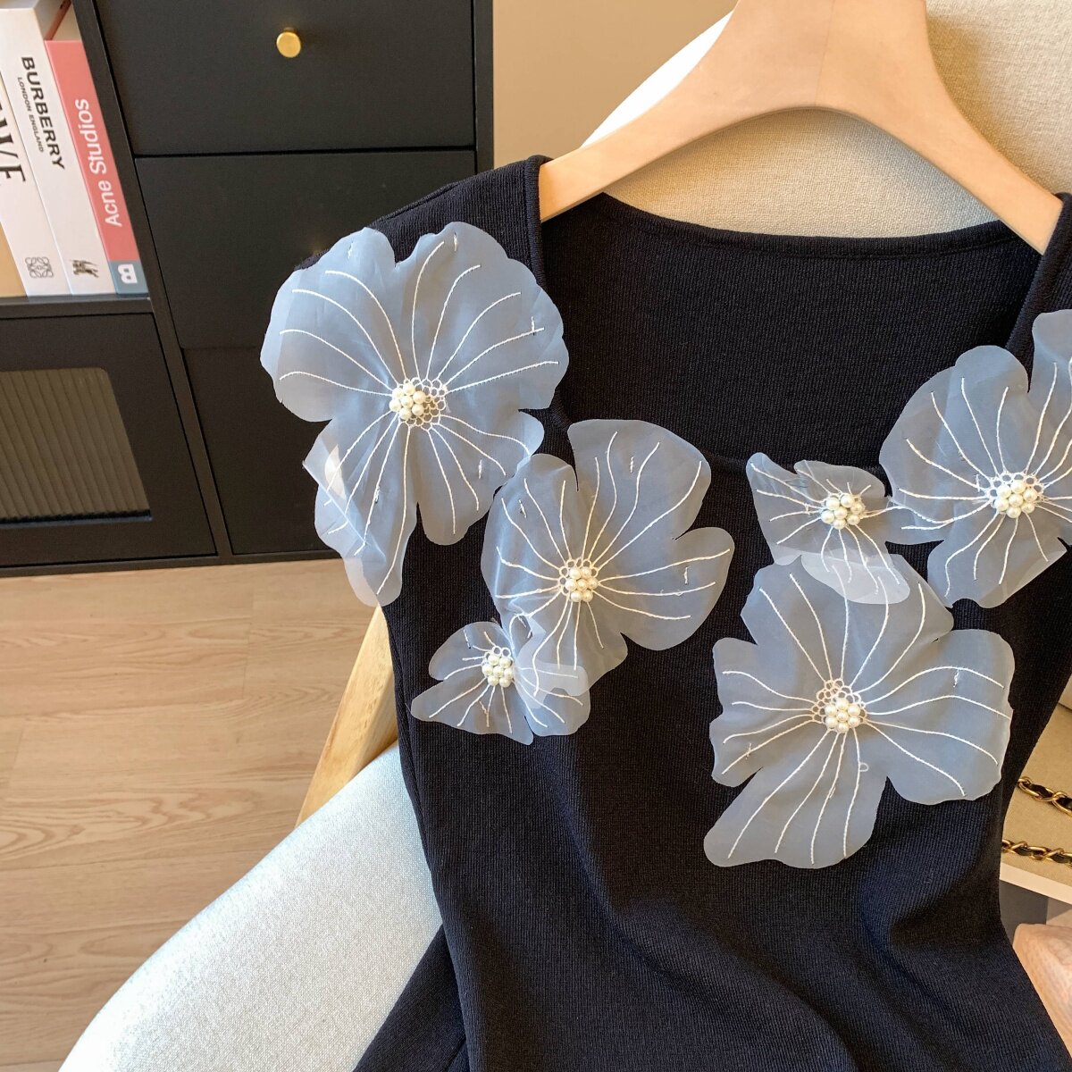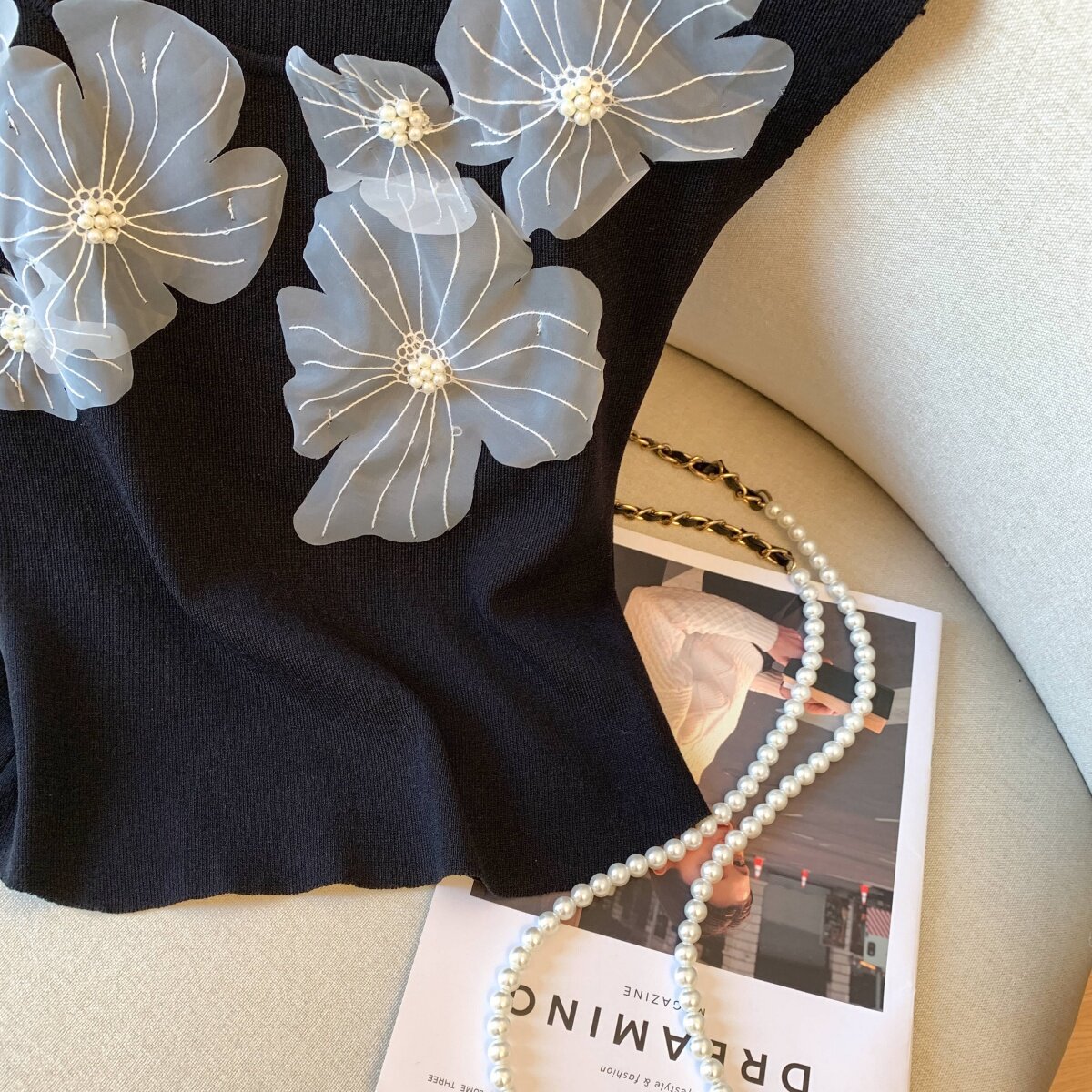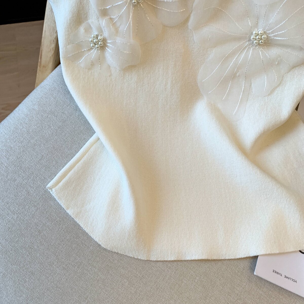 專櫃撤廻剪標甜美重工立體花朵短袖針織衫女夏季新款超好看小上衣