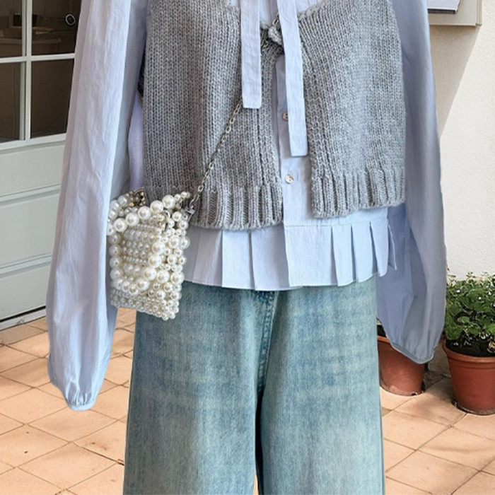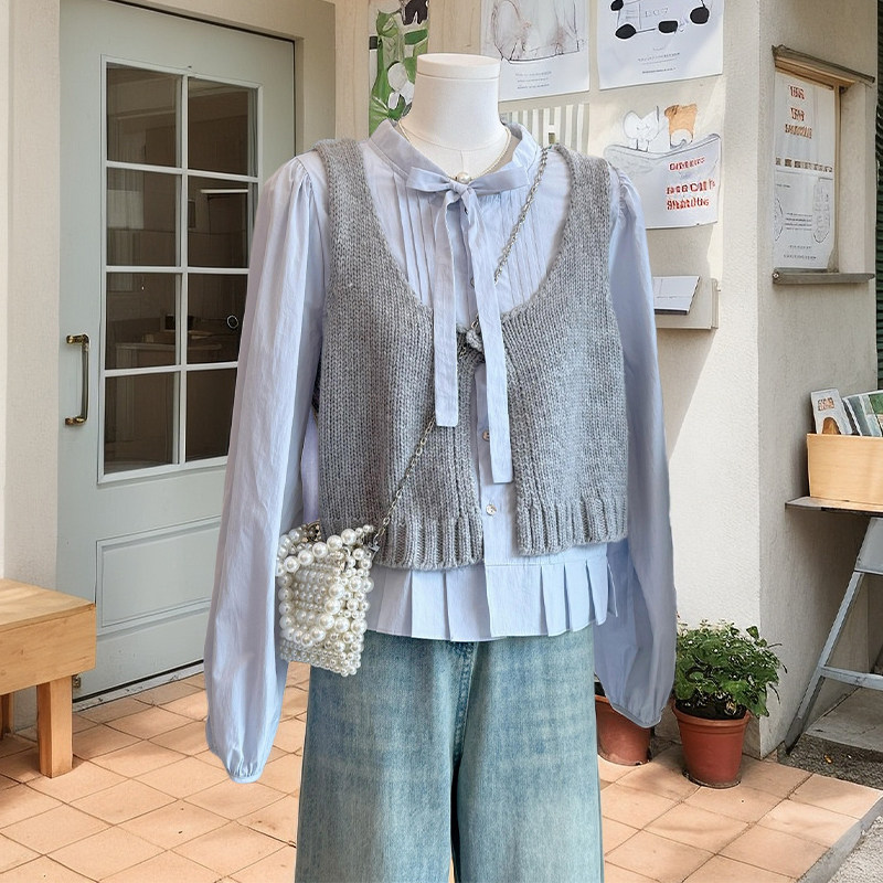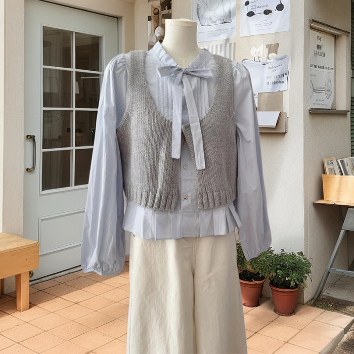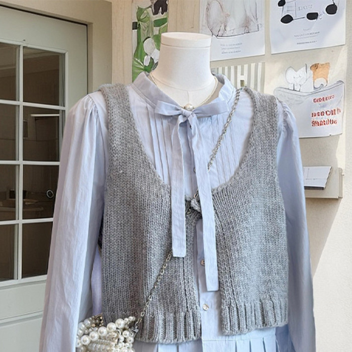 韓系高級感小香風甜美減齡蝴蝶結綁帶襯衫曡穿針織背心兩件套上衣