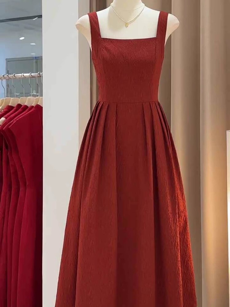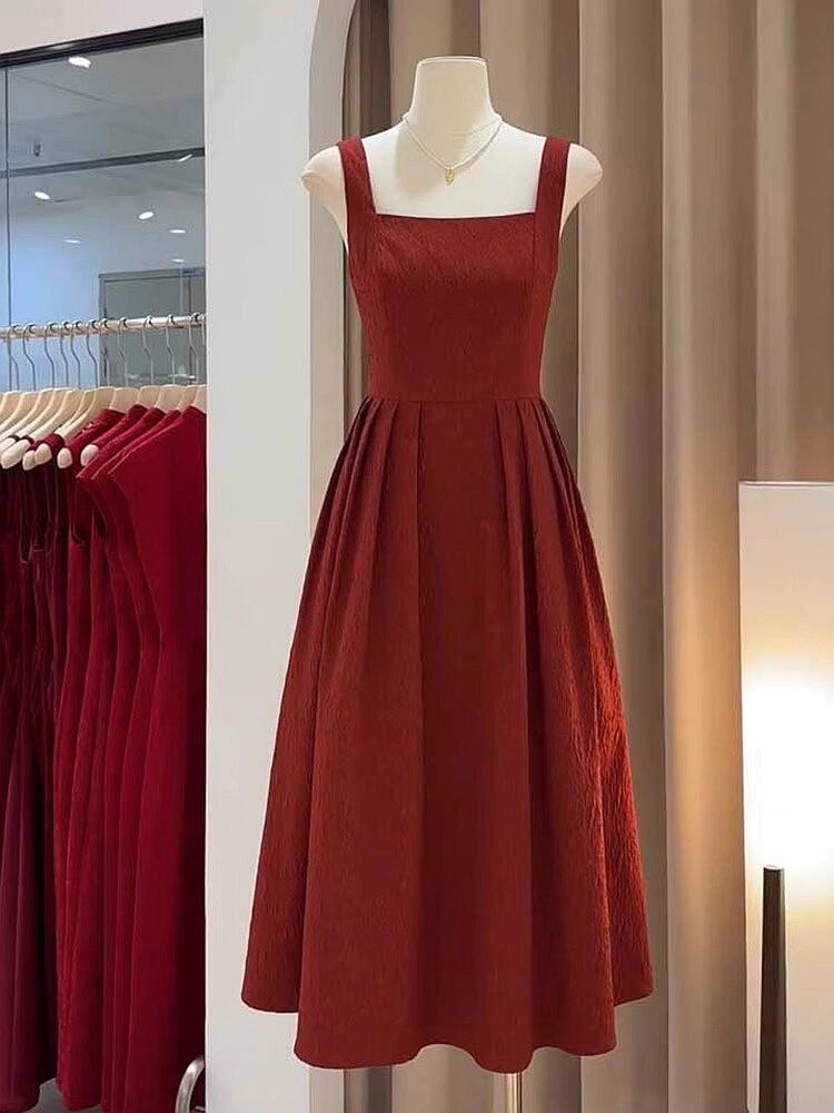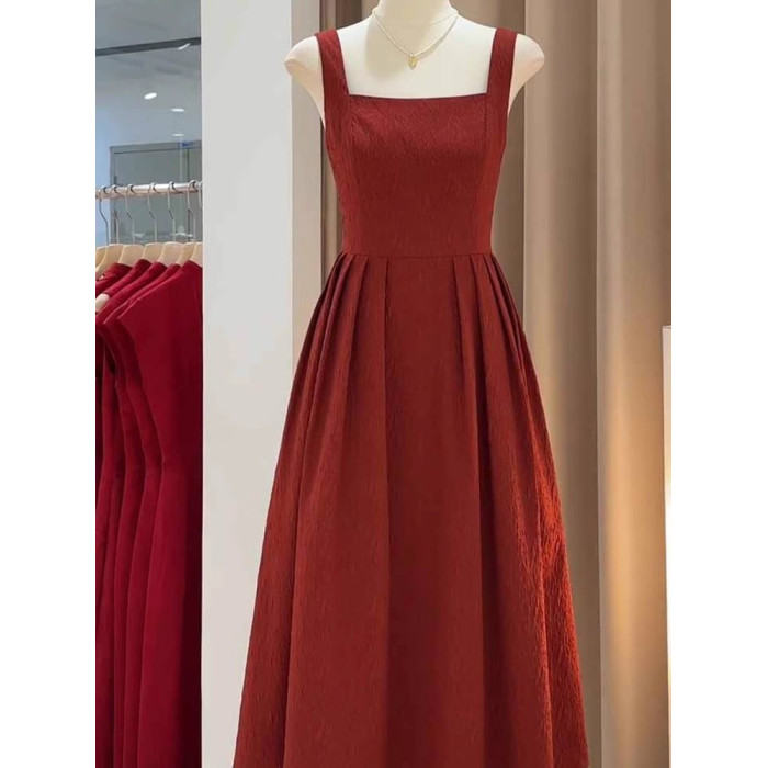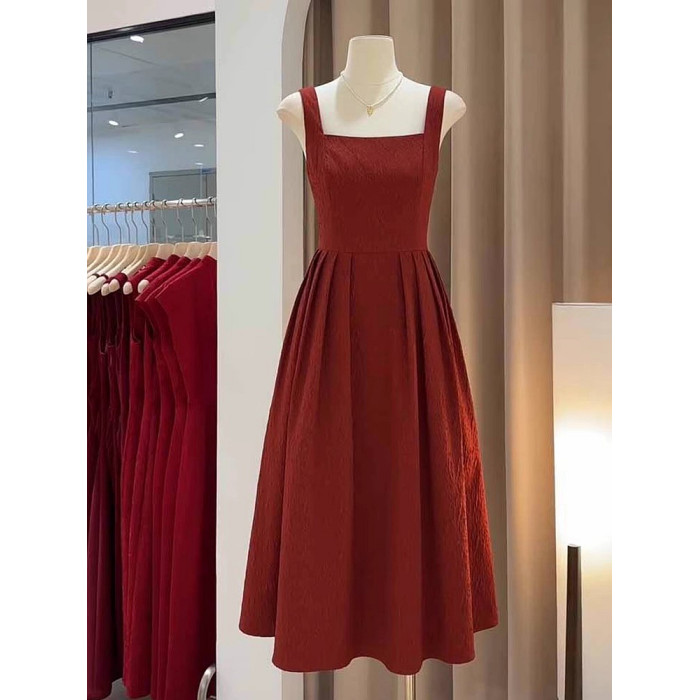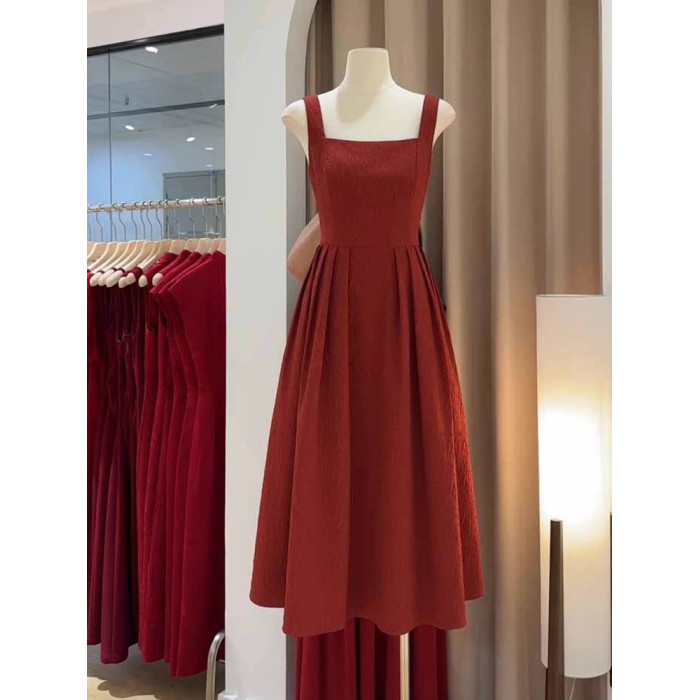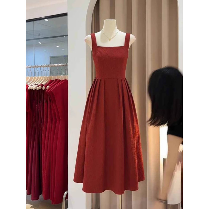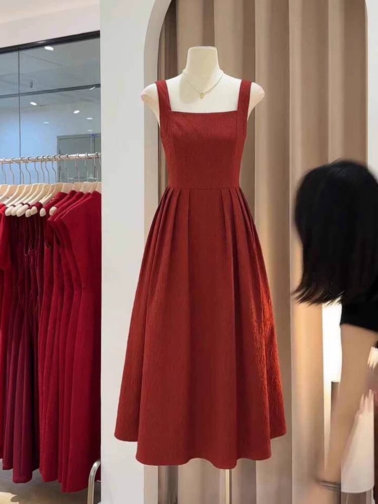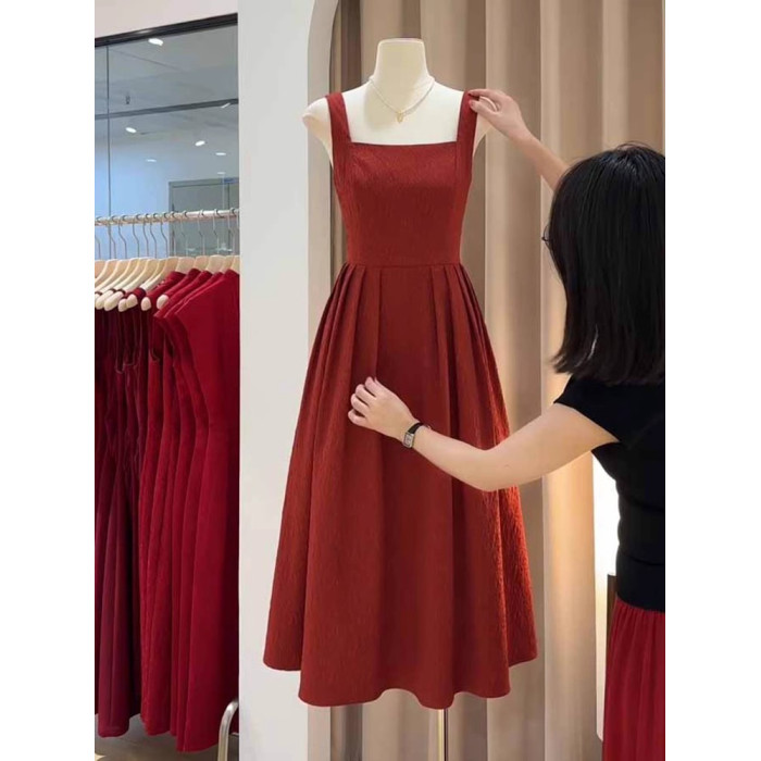 點點夏季新款法式港風高級精緻收腰顯瘦顯白大擺裙紅色吊帶連衣裙