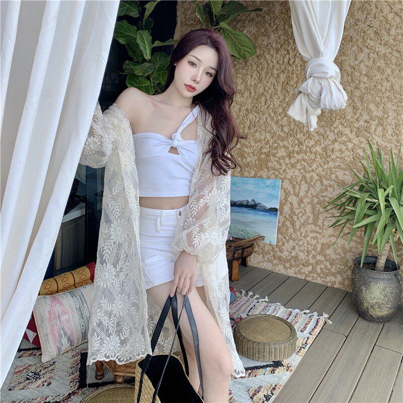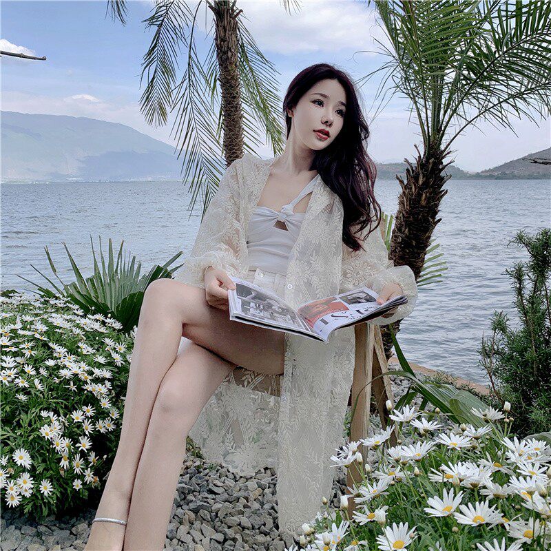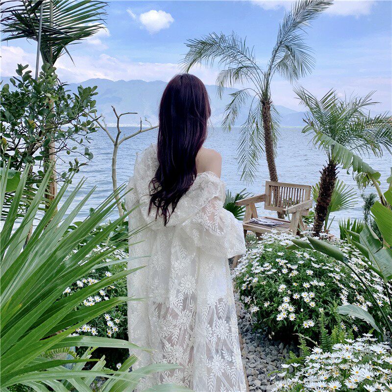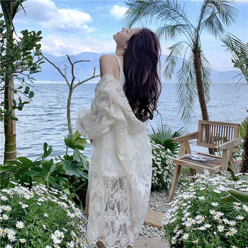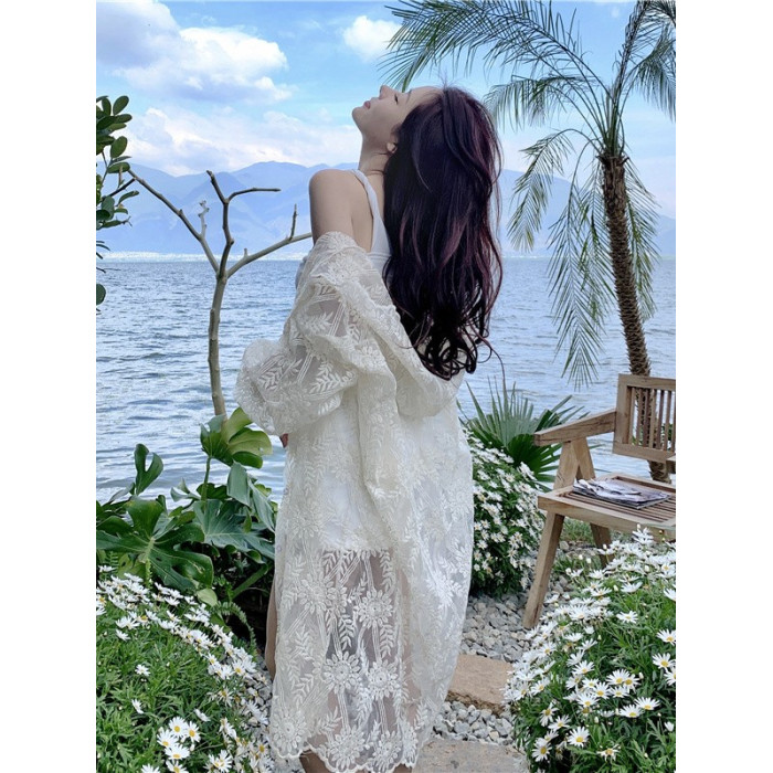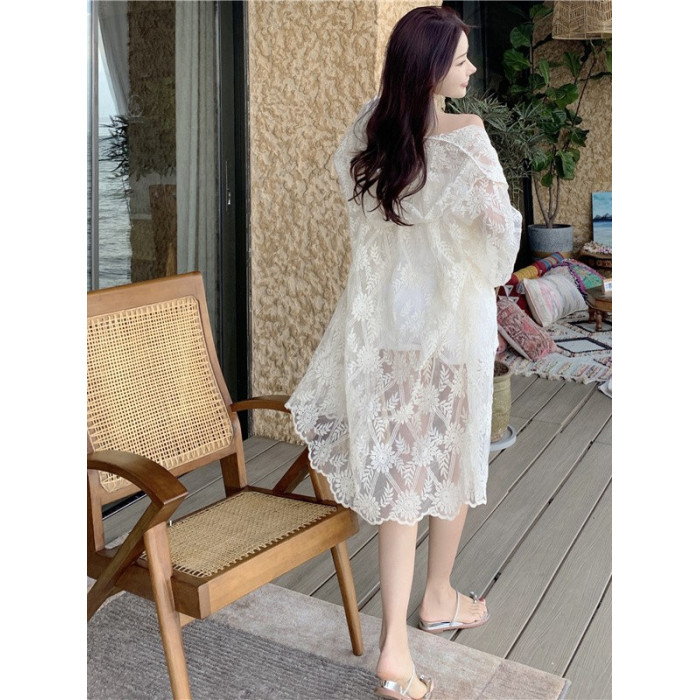 度假長款開衫超仙蕾絲鉤花連帽外套女寬鬆輕薄刺綉網紗鏤空防曬衣