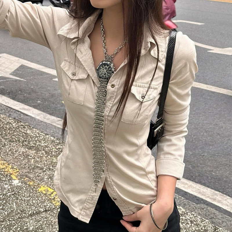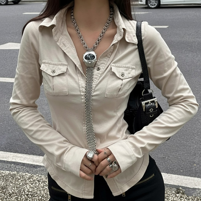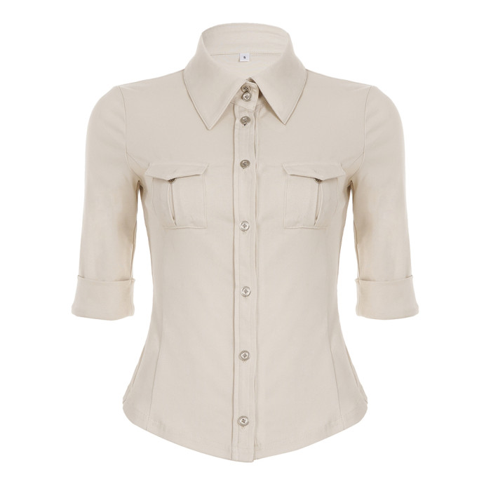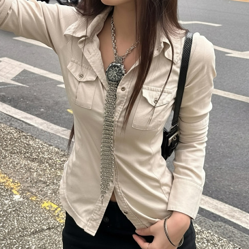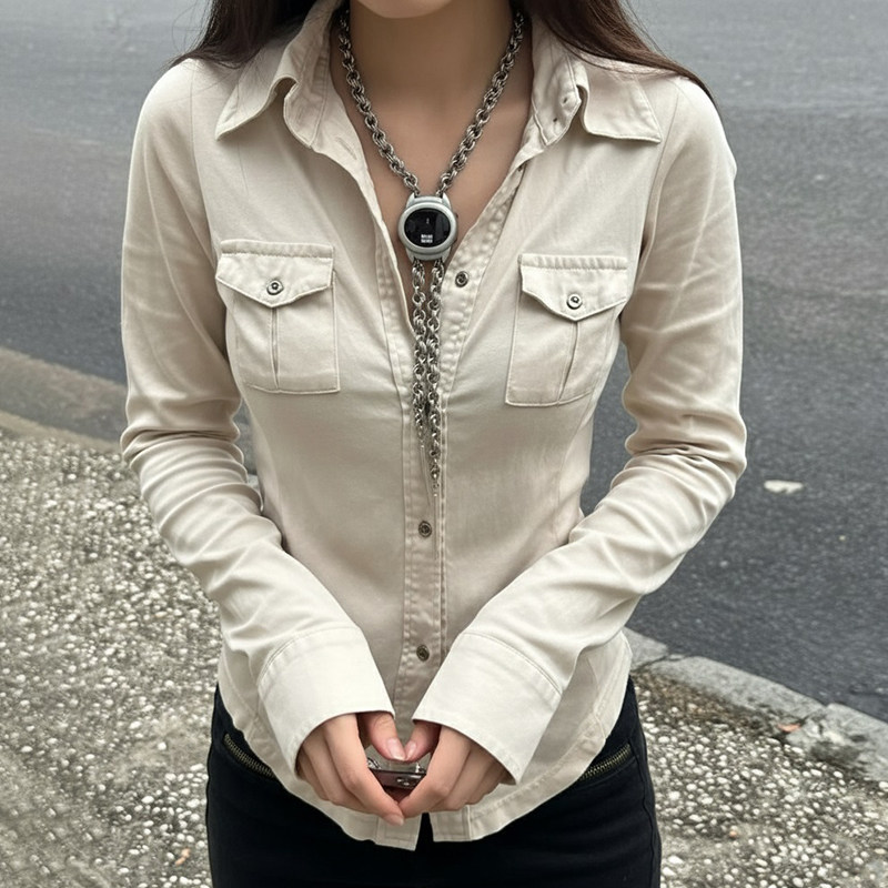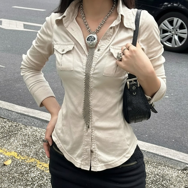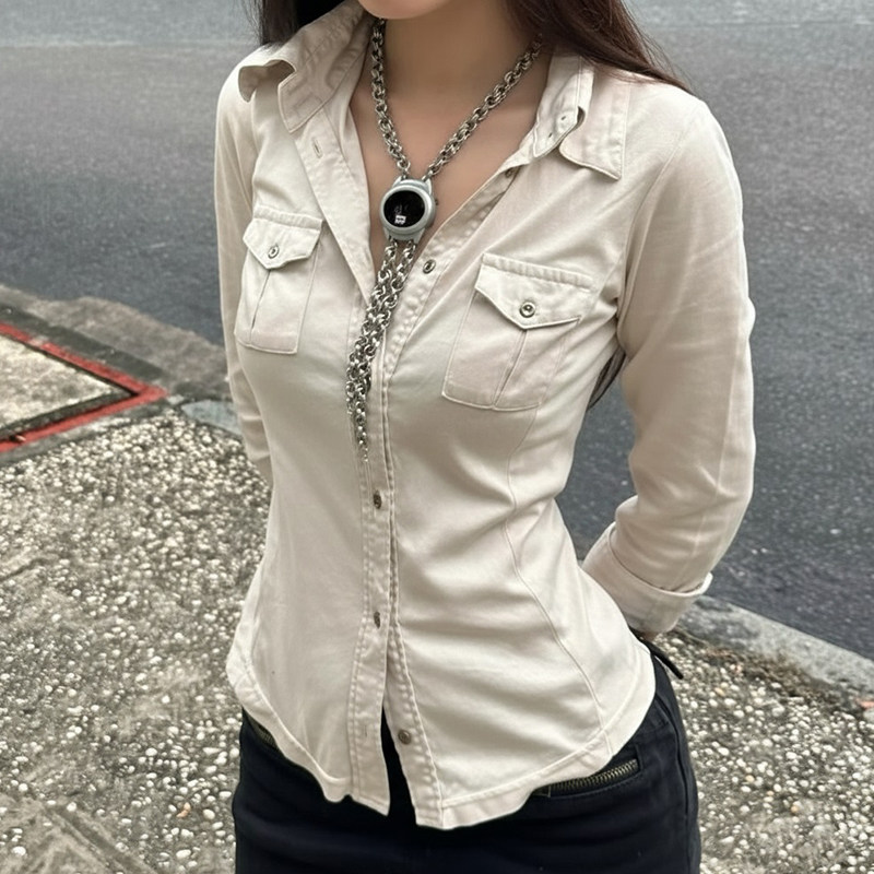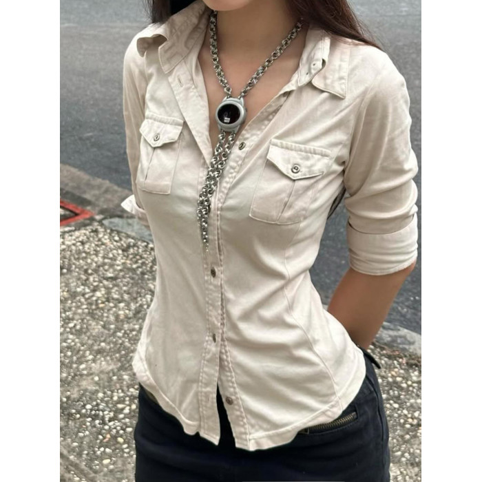 ROCKMORE【酷帥街頭】米白色繙領單排釦口袋工裝襯衫辣妹修身上衣