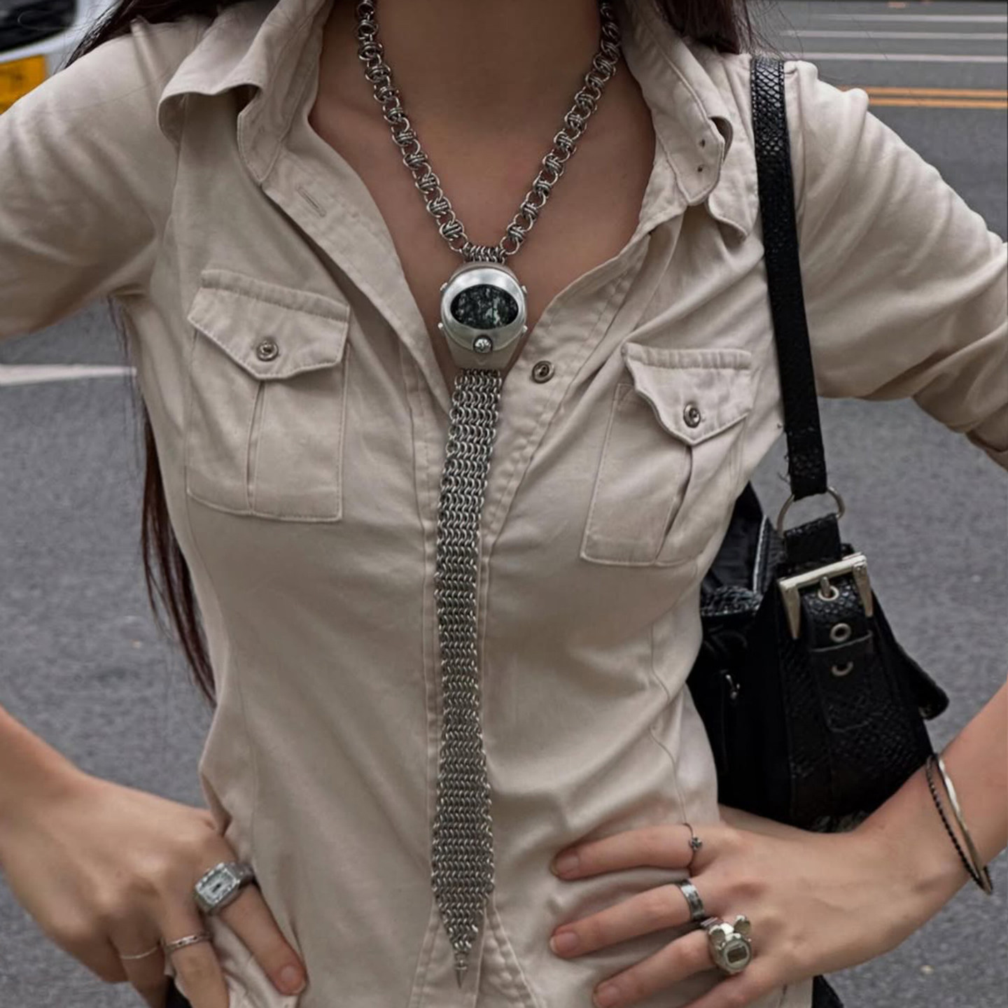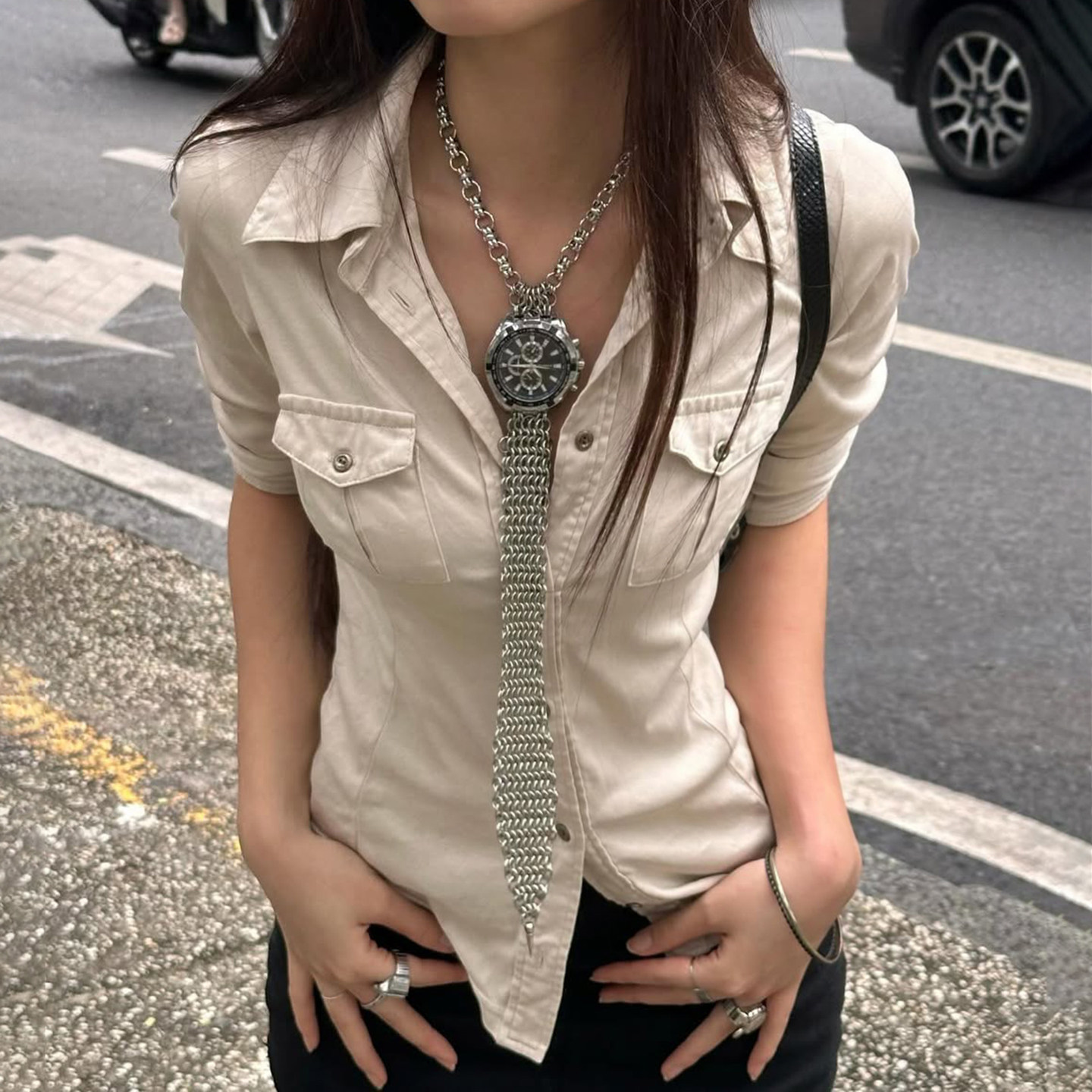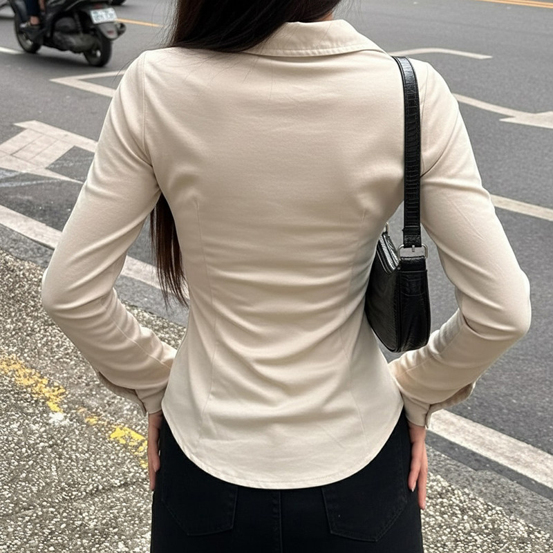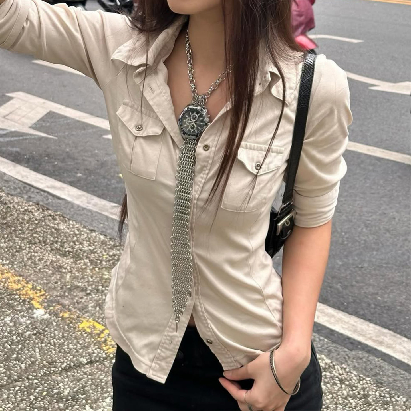 ROCKMORE【酷帥街頭】米白色繙領單排釦口袋工裝襯衫辣妹修身上衣