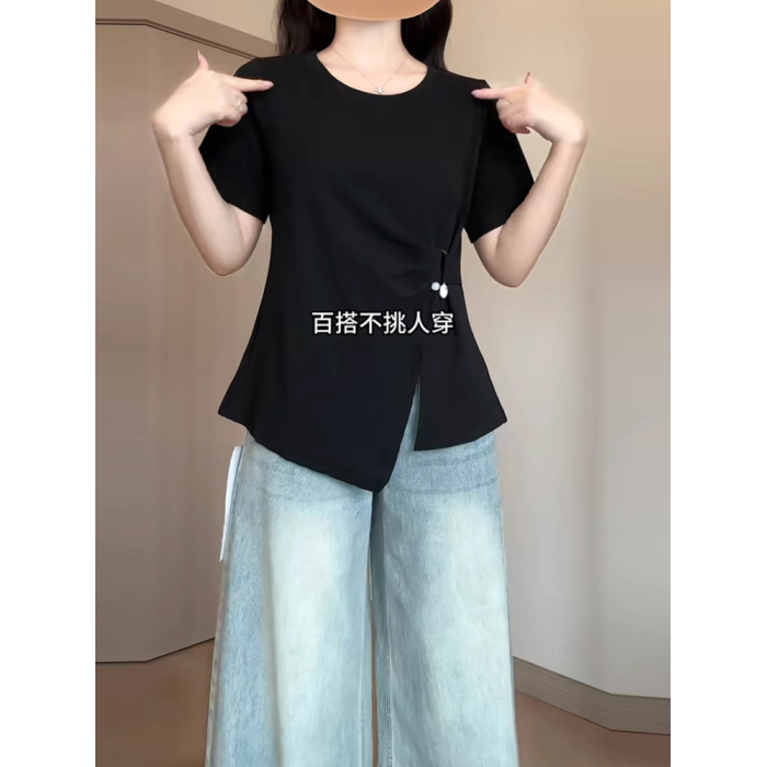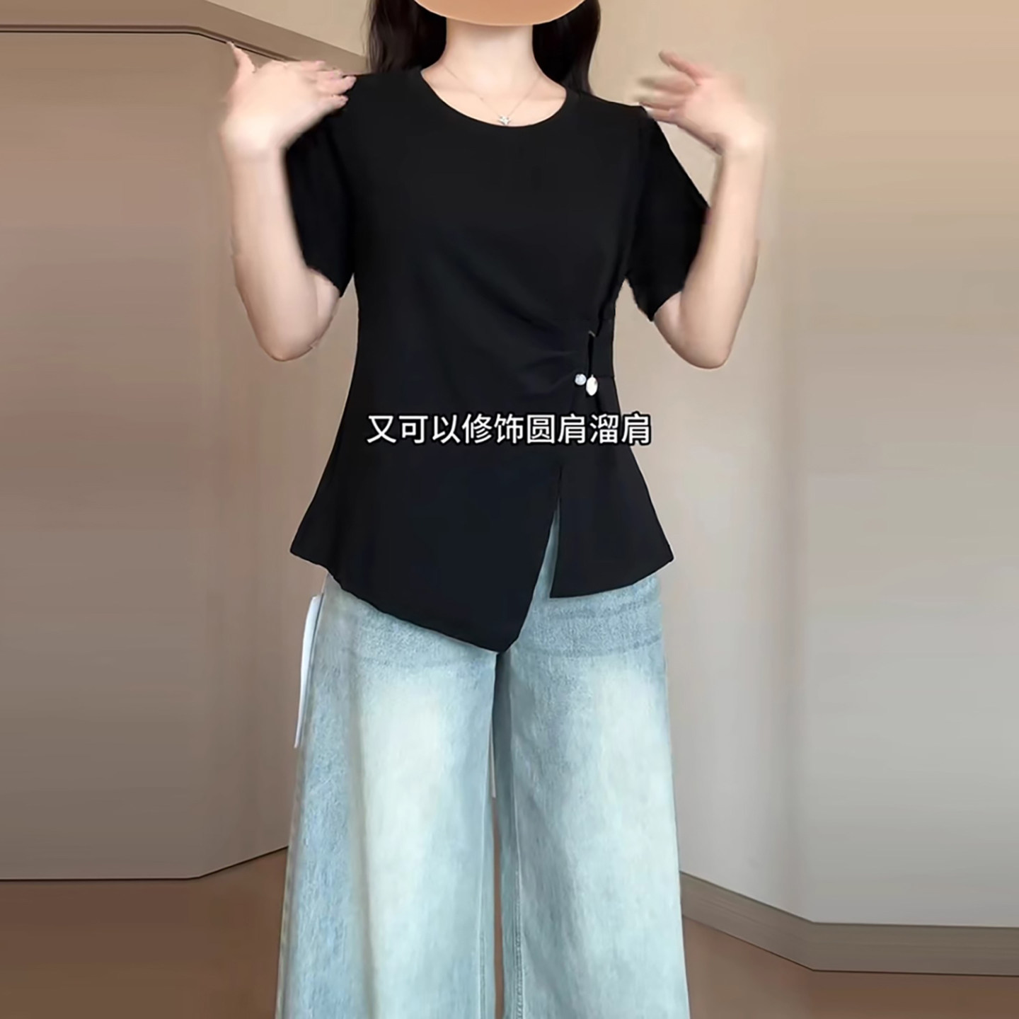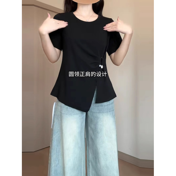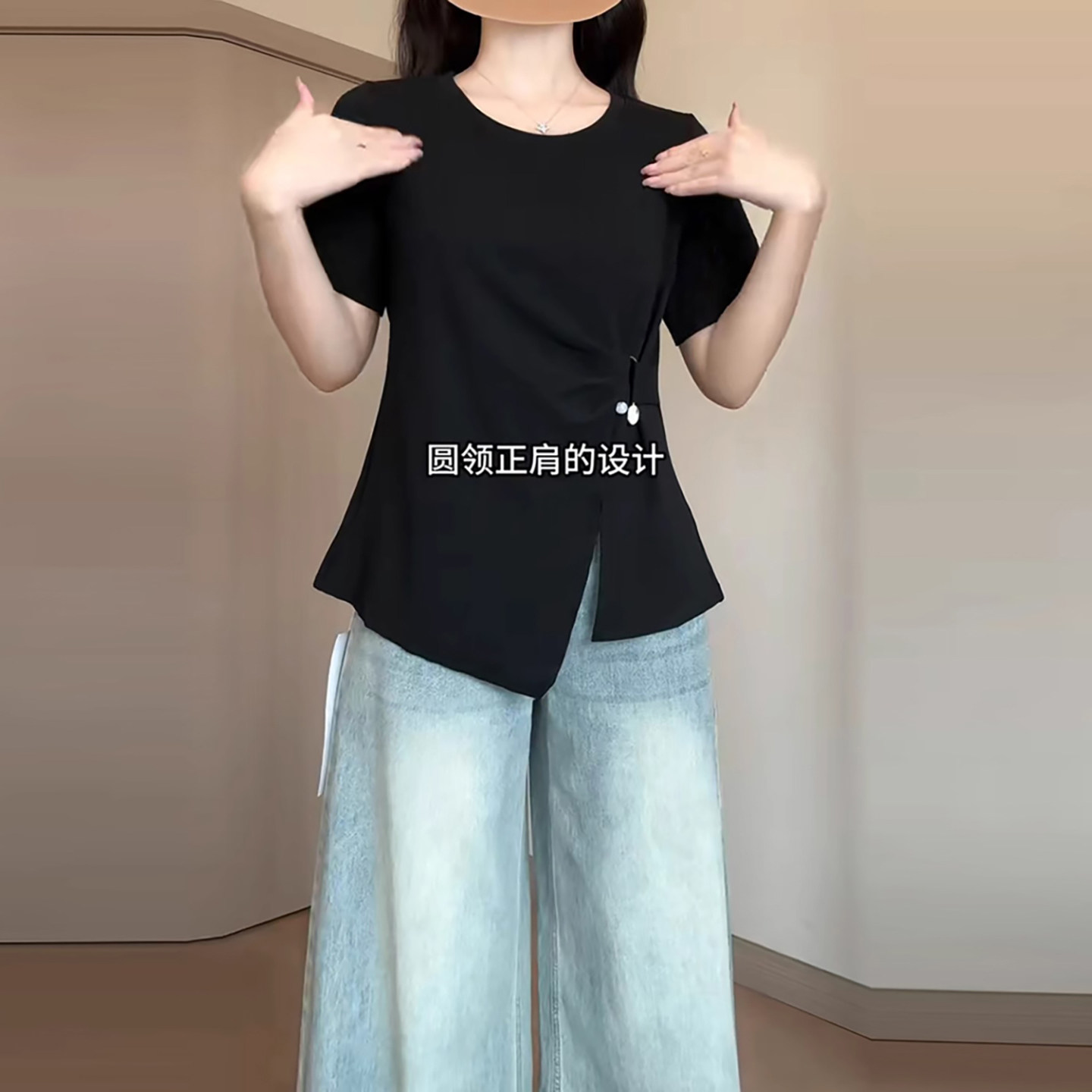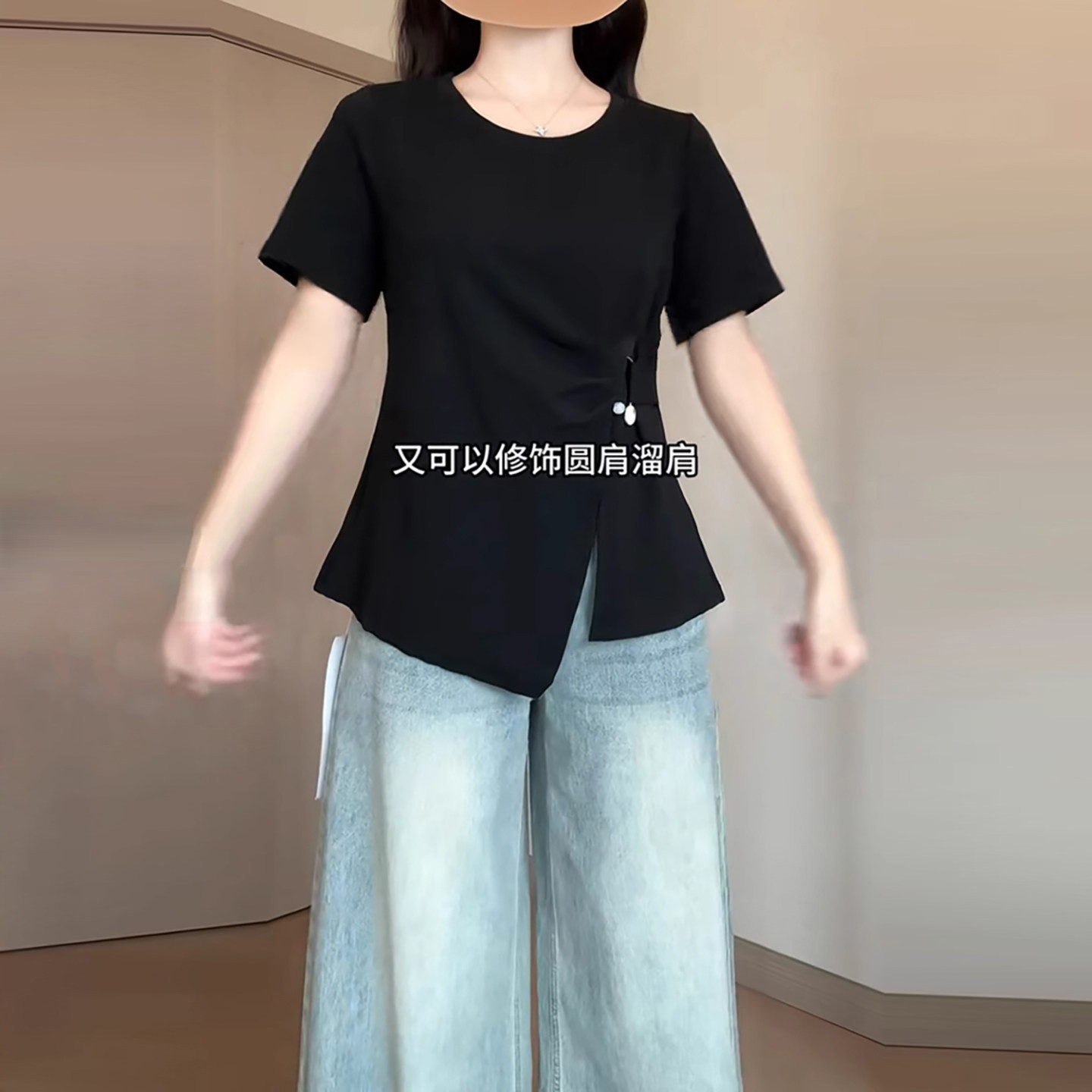 大碼法式純色圓領短袖t恤女夏季胖mm顯瘦遮肉不規則收腰絕美上衣