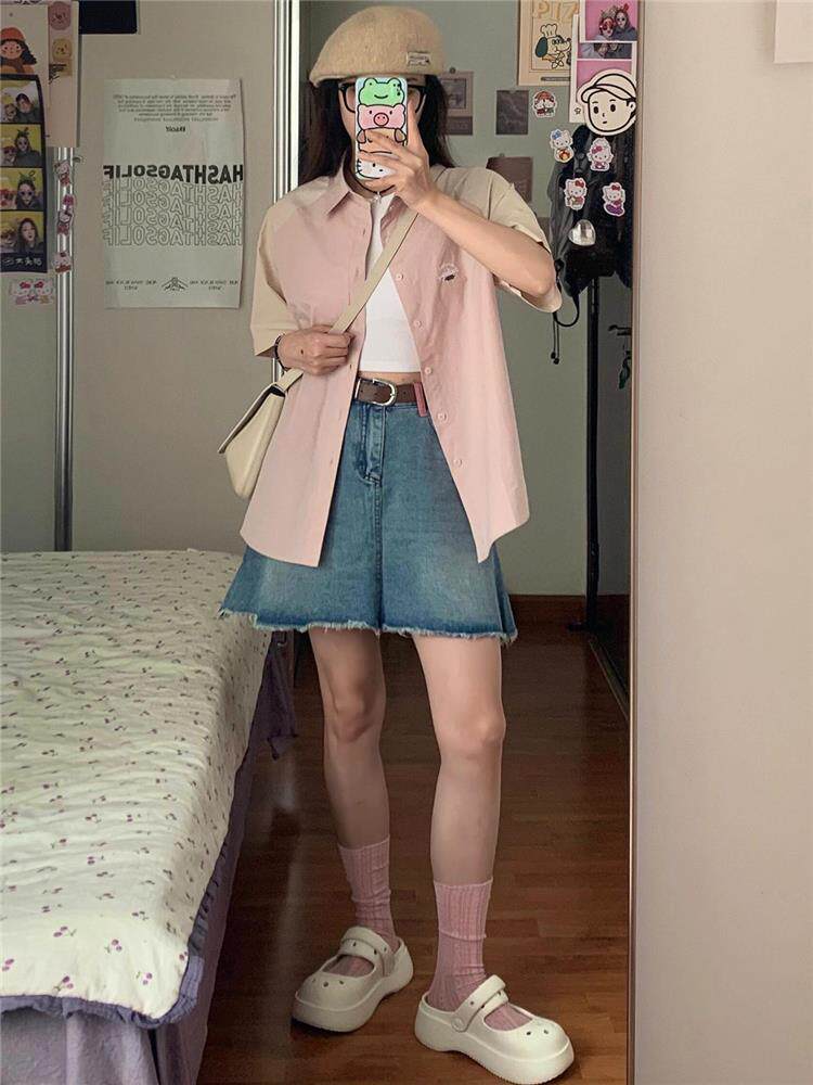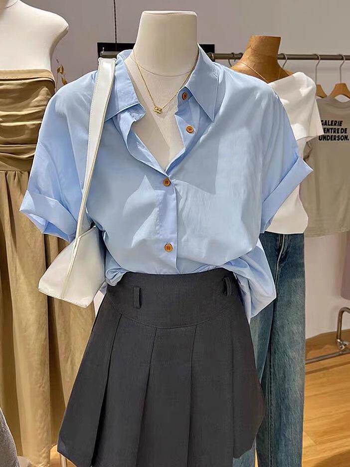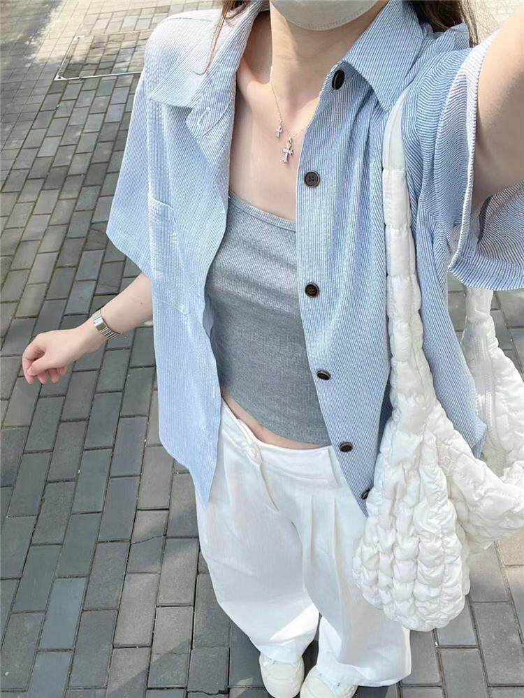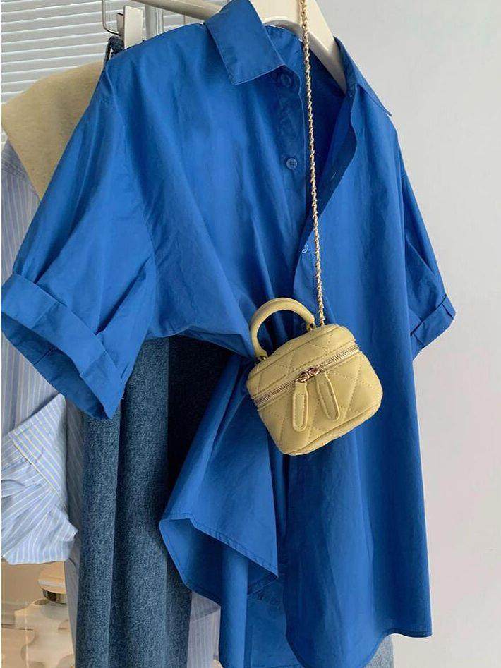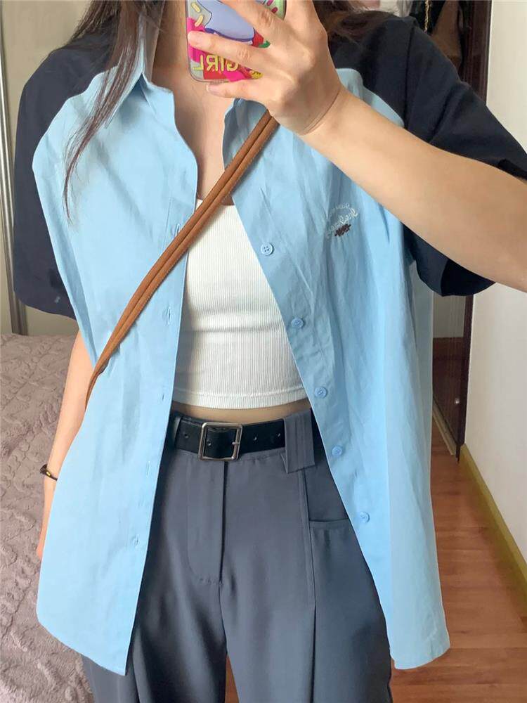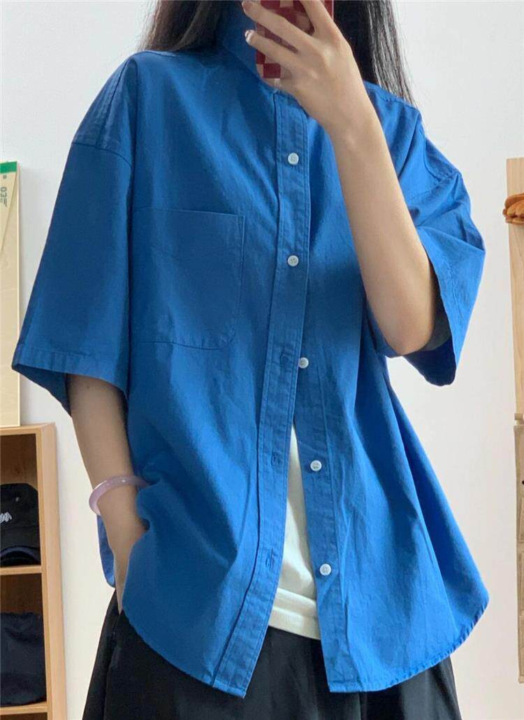 森系藍色短袖襯衫女小個子2025夏季新款上衣寬鬆遮肉百搭襯衣外穿