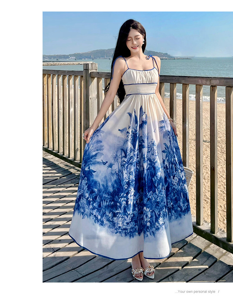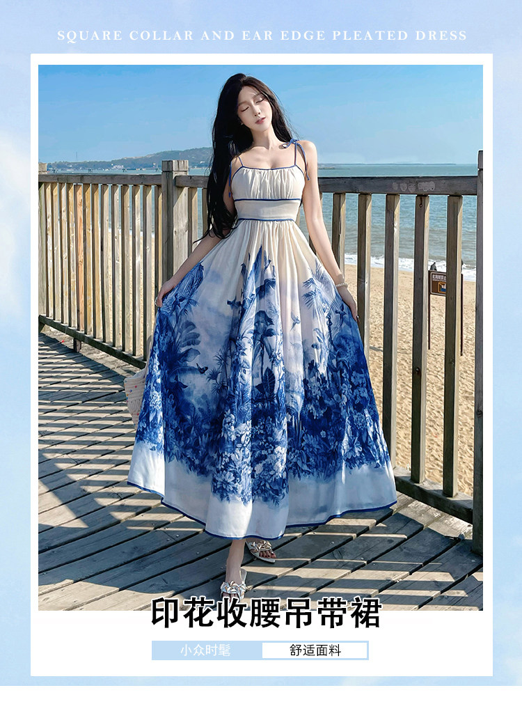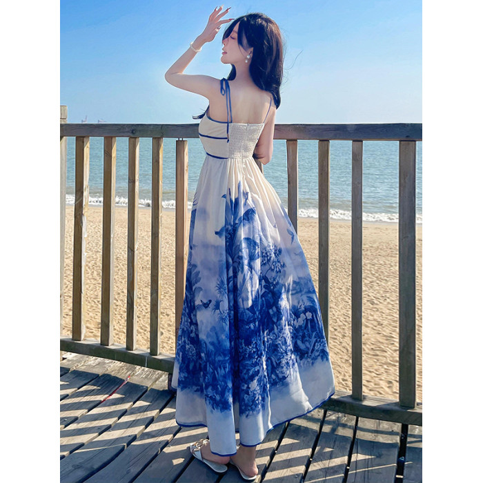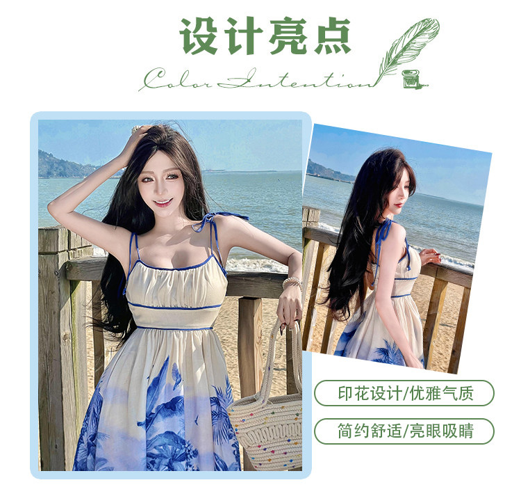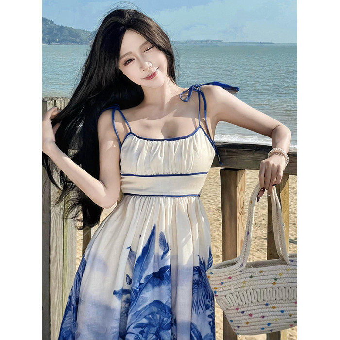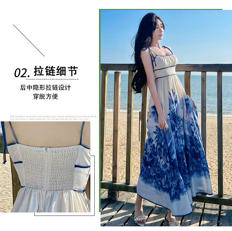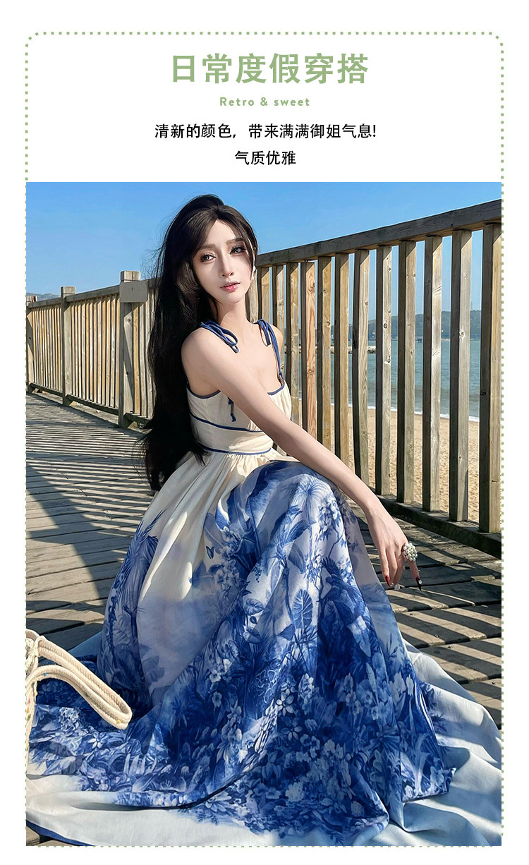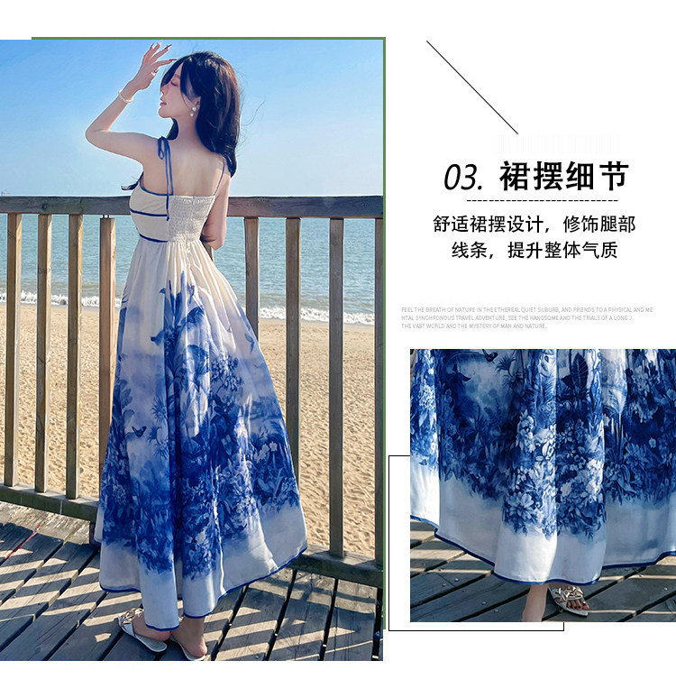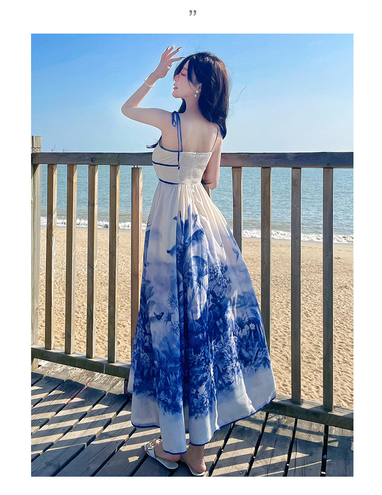 新中式國風海島穿搭度假風吊帶連衣裙女春夏旅遊拍照絕美收腰長裙