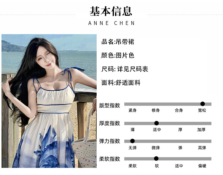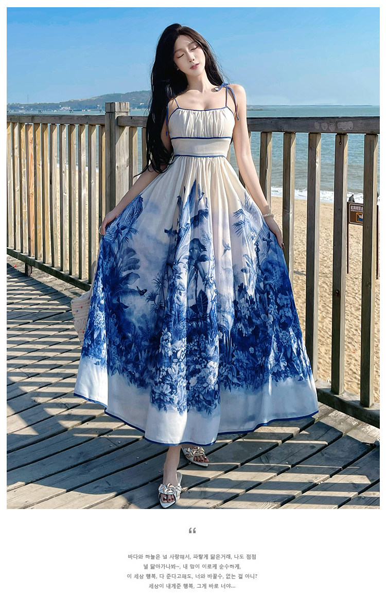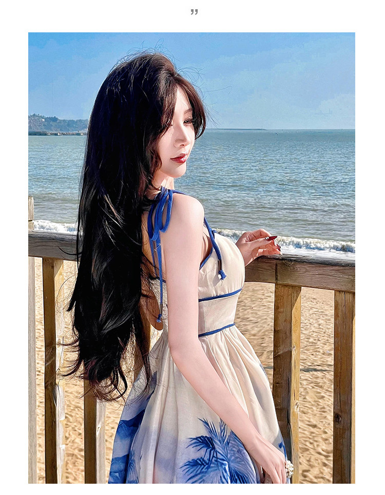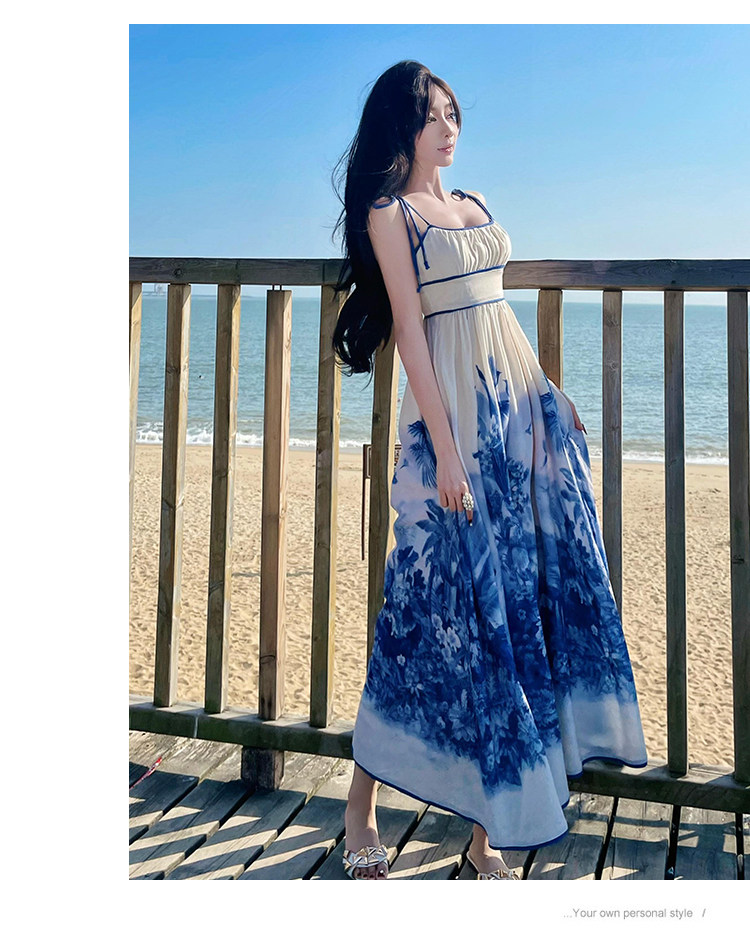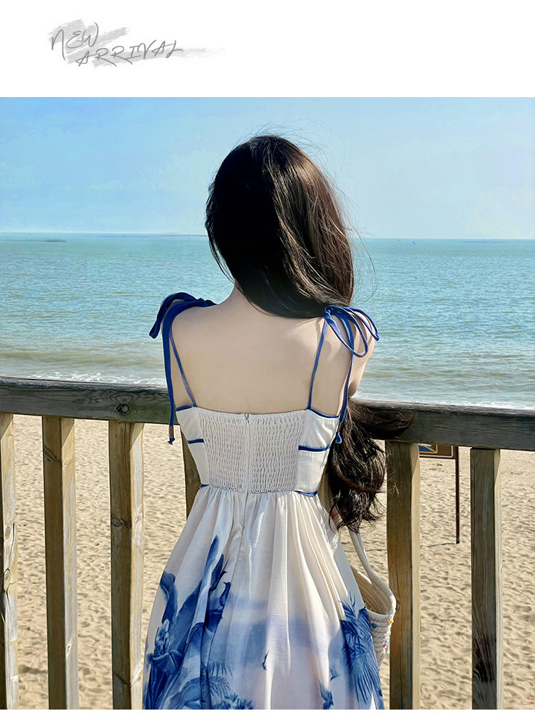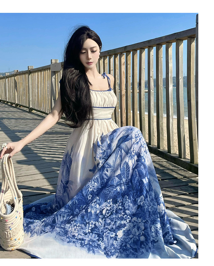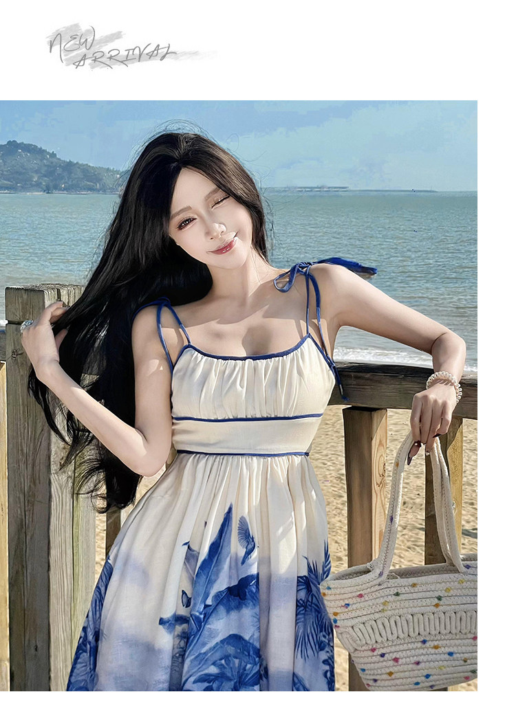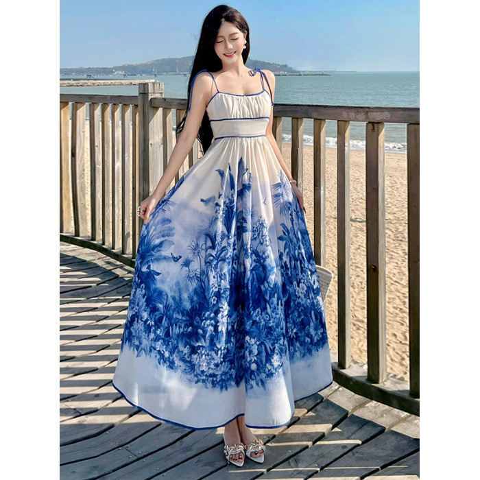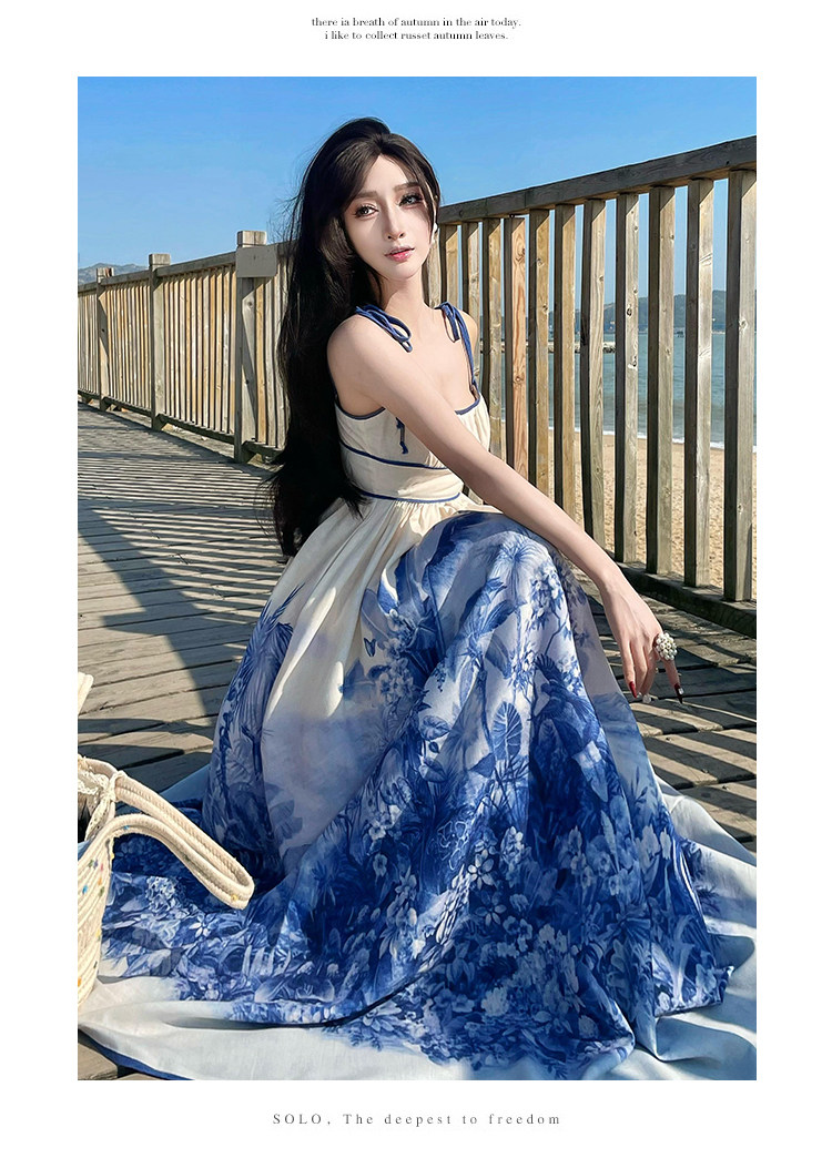 新中式國風海島穿搭度假風吊帶連衣裙女春夏旅遊拍照絕美收腰長裙