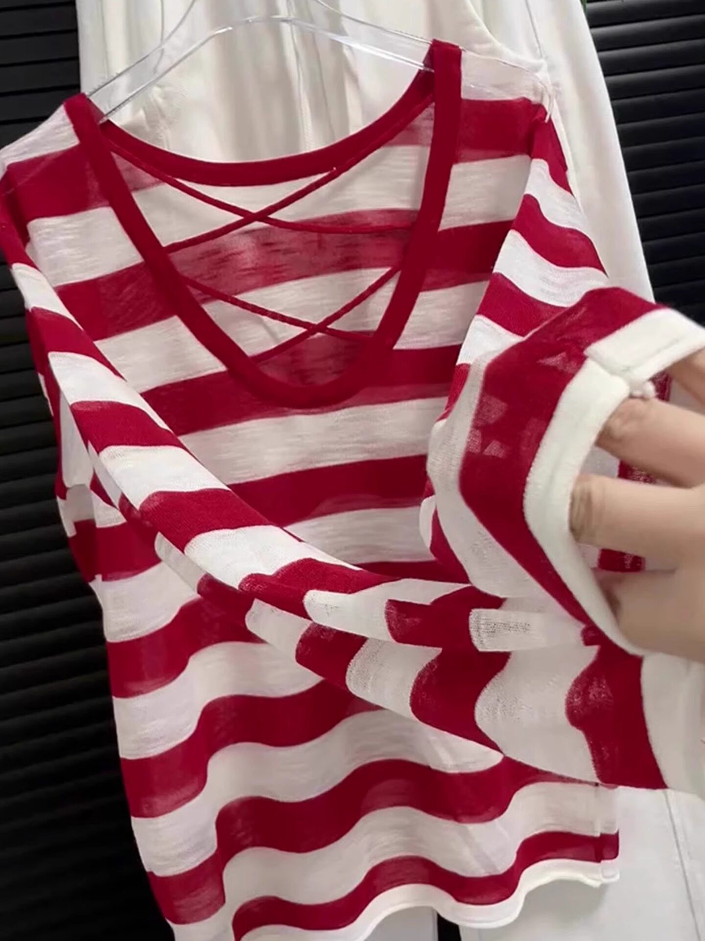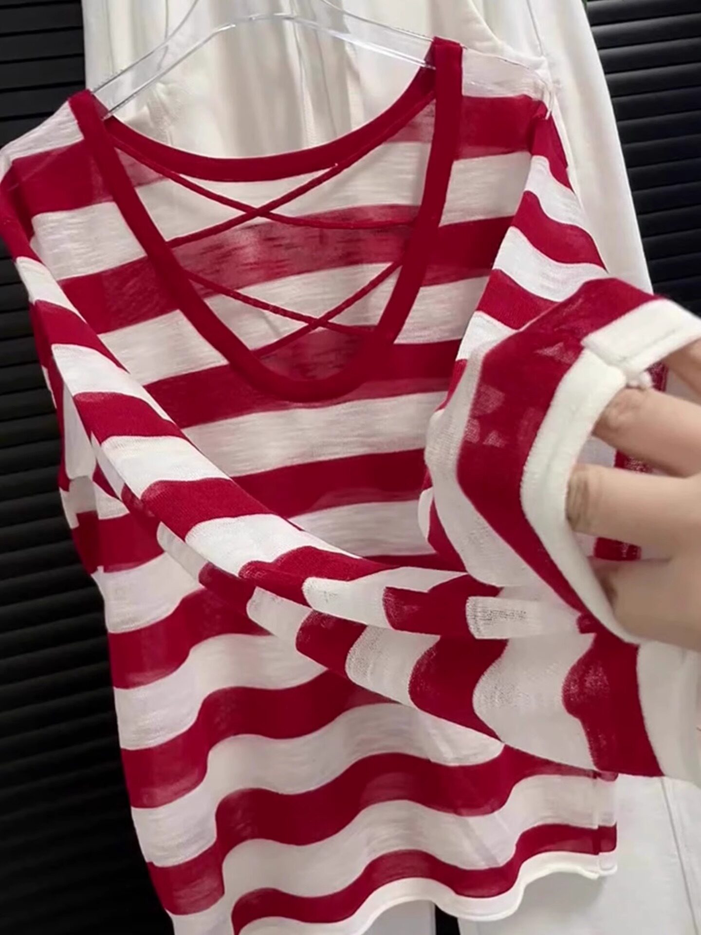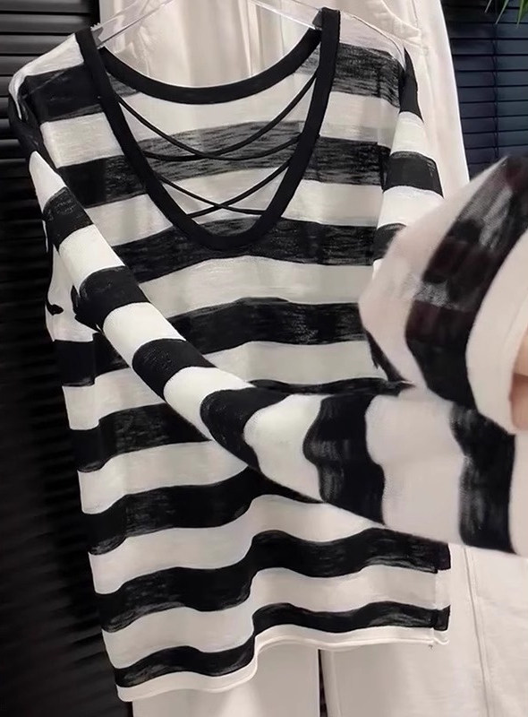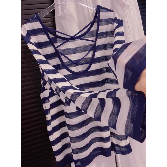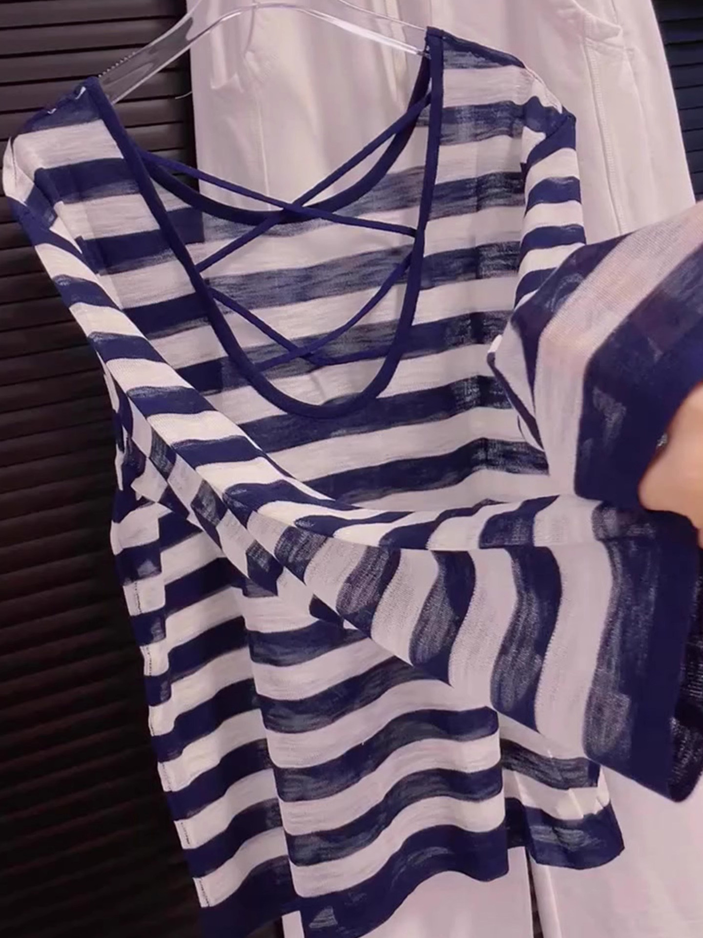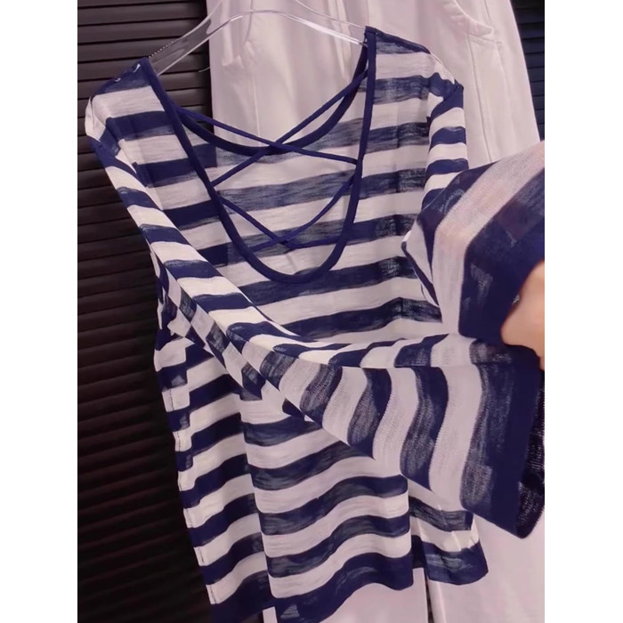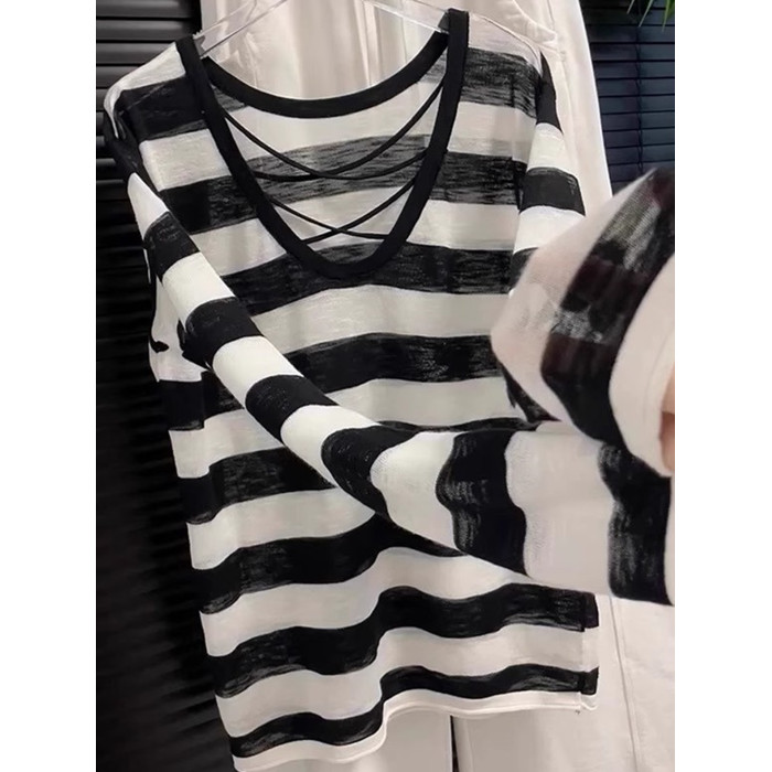韓版薄款鏤空交叉防曬長袖條紋針織衫寬鬆顯瘦上衣2025夏季t恤女