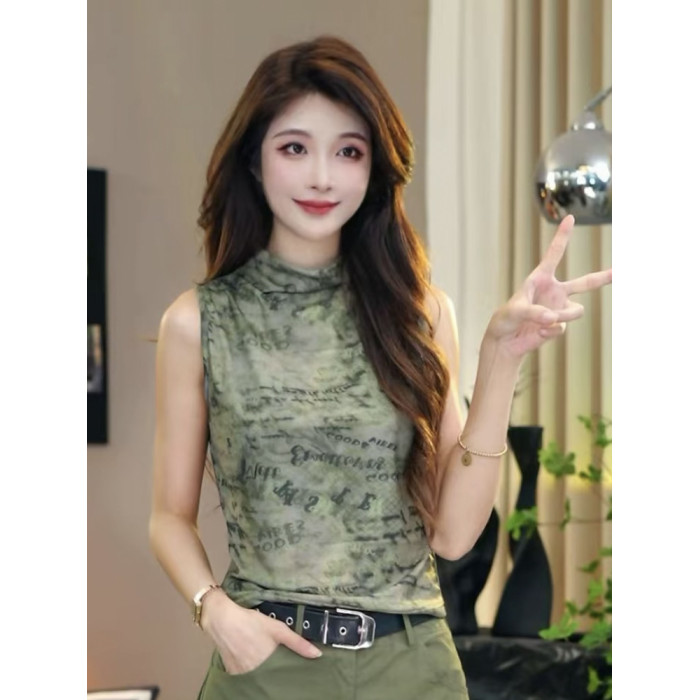 時尚立領網紗字母印花打底衫女2025夏季新款辣妹內搭無袖修身上衣