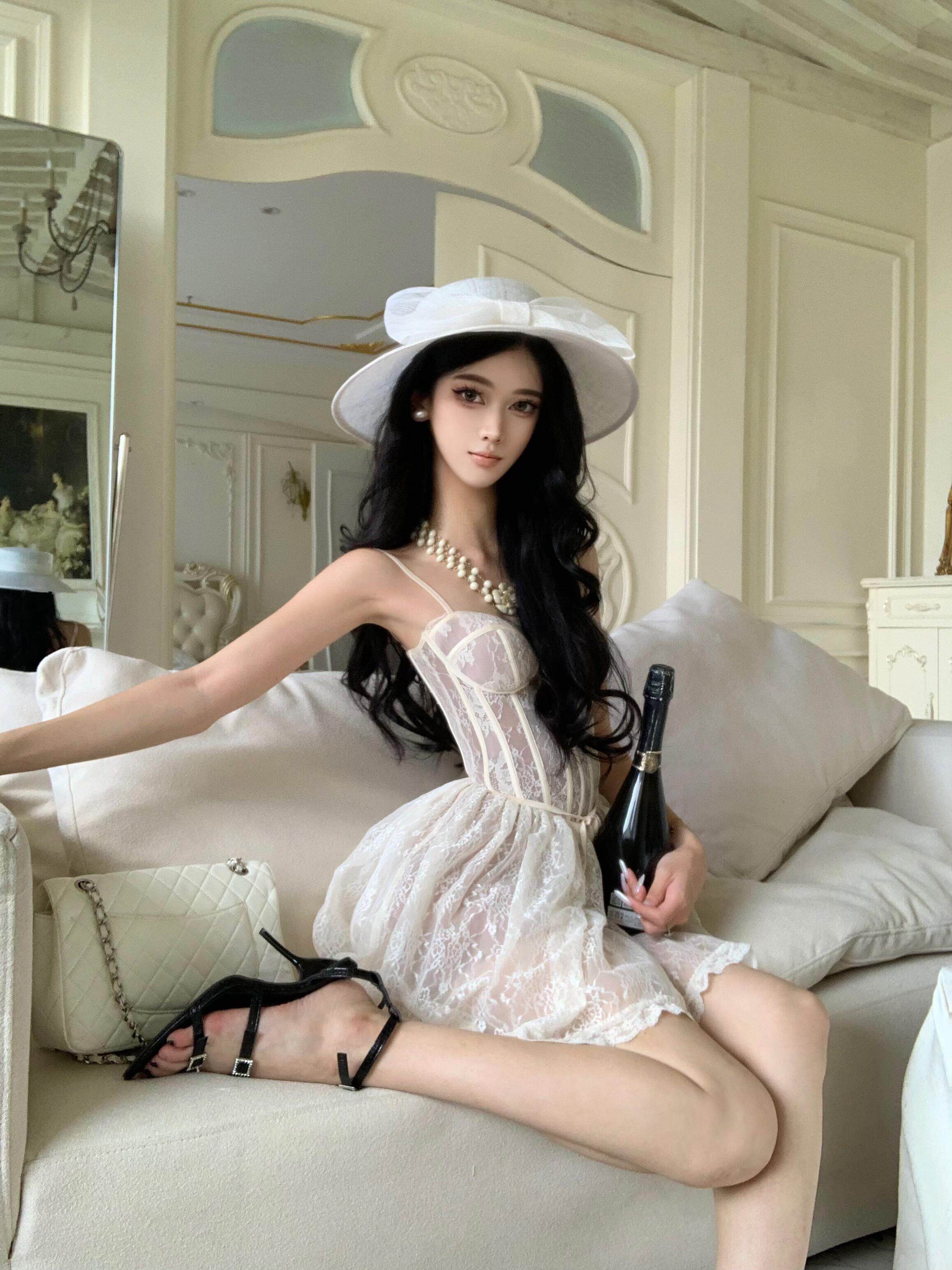 OUTFlT STUDIO 法式重工蕾絲拼接魚骨吊帶連衣裙女氣質優雅短裙