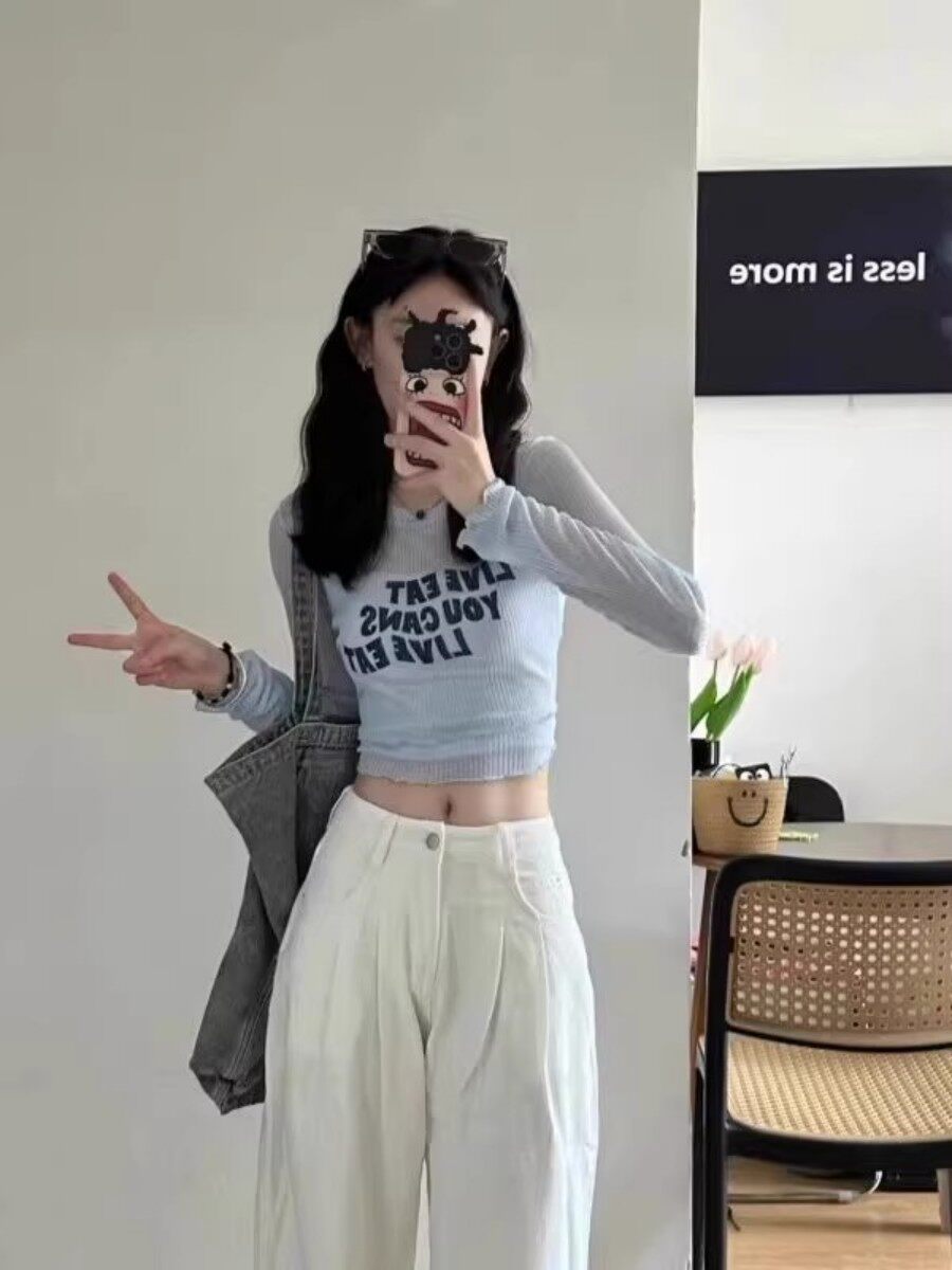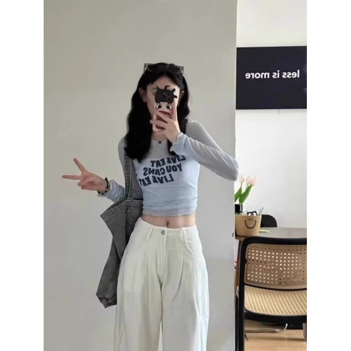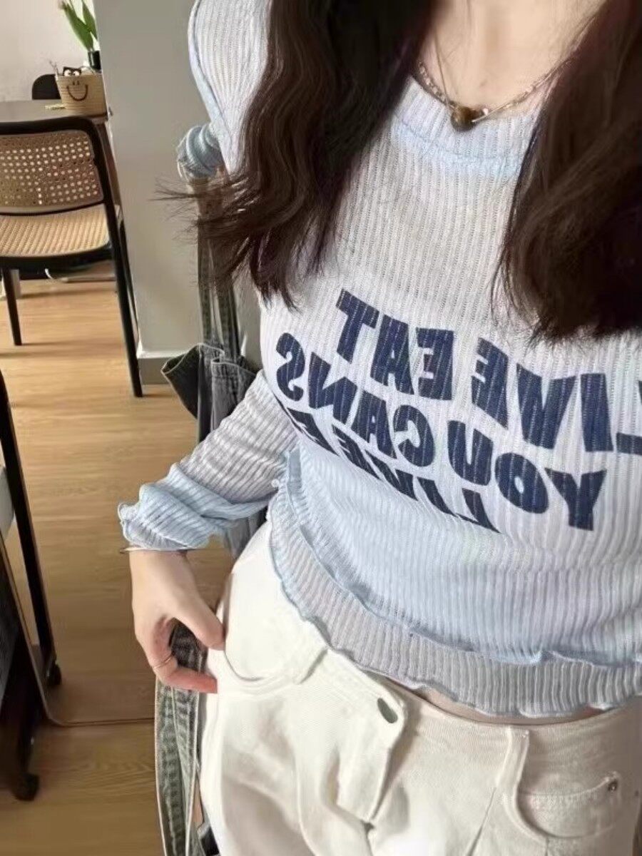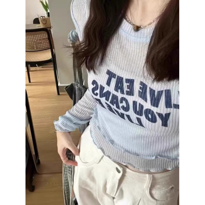 法式假兩件藍色冰絲短款長袖上衣女夏季辣妹外搭薄款針織防曬罩衫