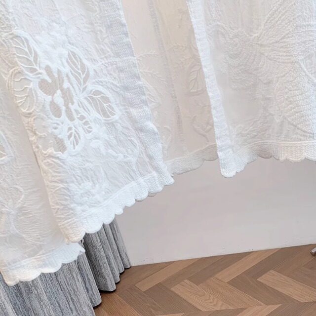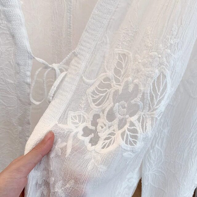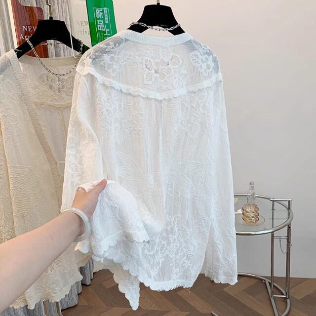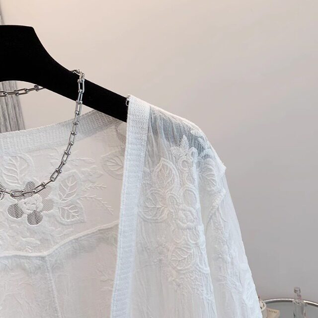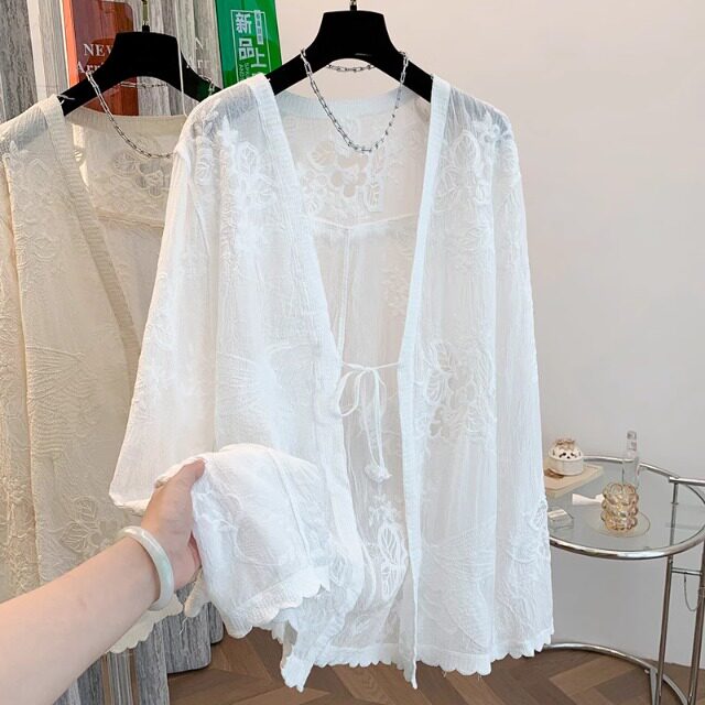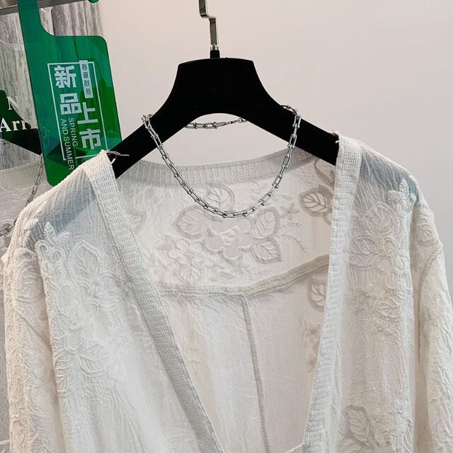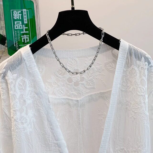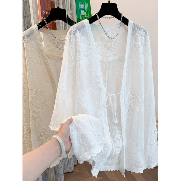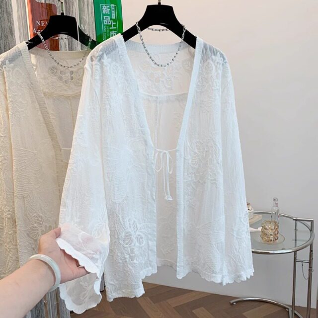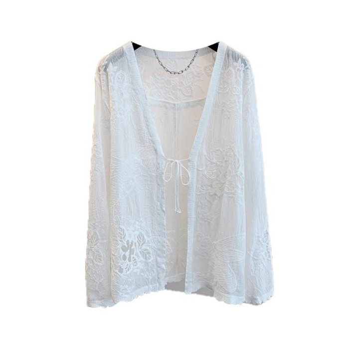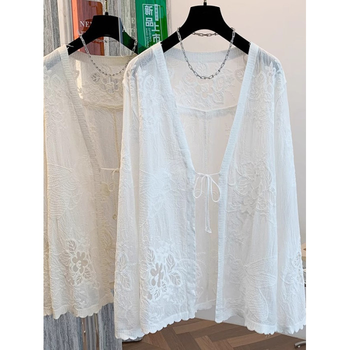 薄款V領系帶蕾絲防曬長袖外套女夏季大碼胖mm中長款外搭開衫上衣