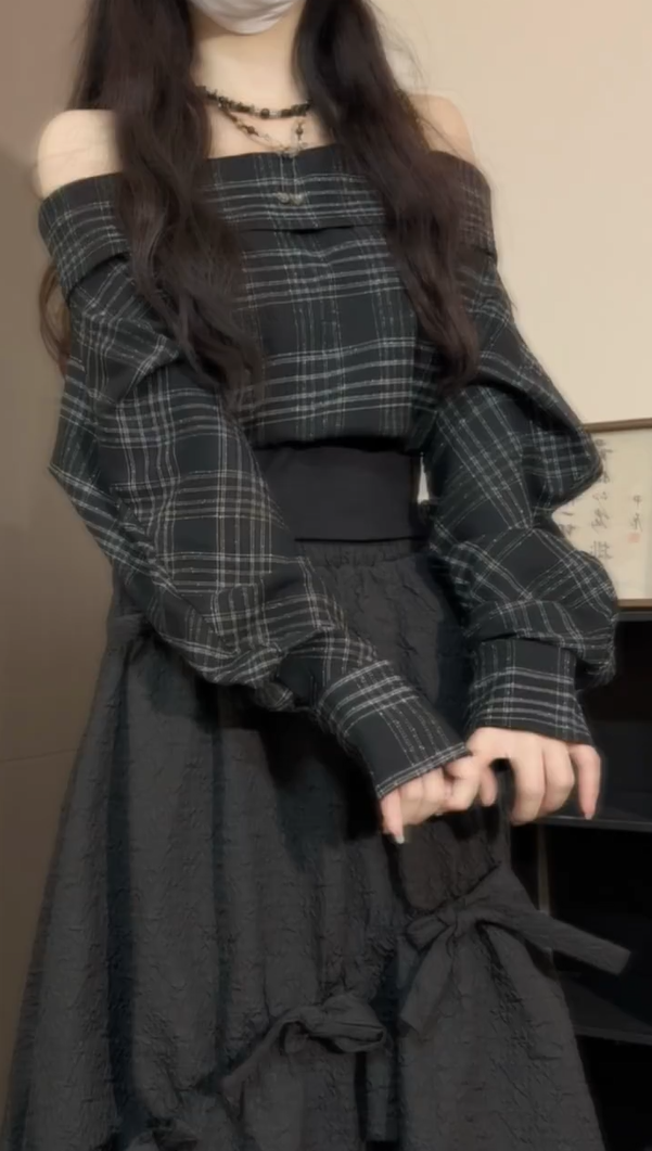 日系復古黑色格紋一字肩襯衫女秋季辣妹高級感小衆氣質長袖上衣潮