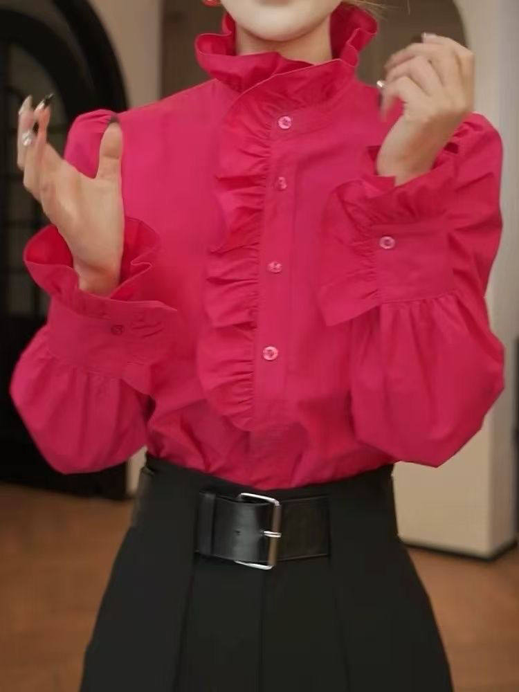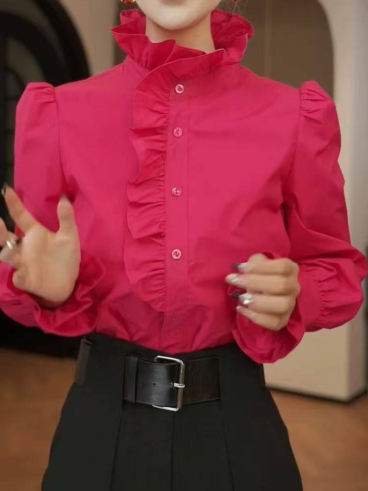 木耳荷葉邊雪紡長袖襯衫女春秋季新款溫柔風不規則半高領小衫上衣