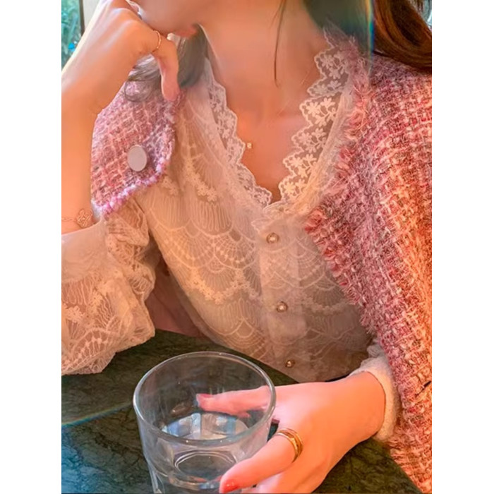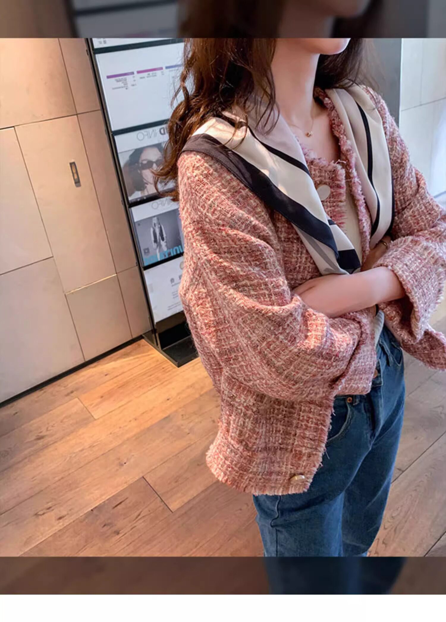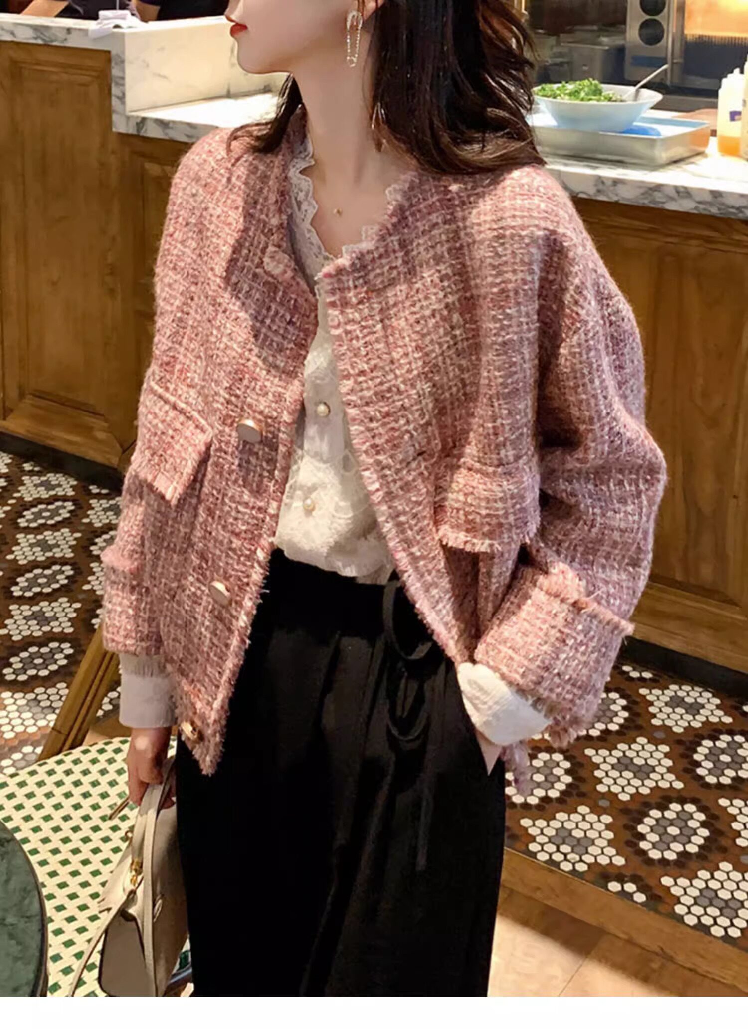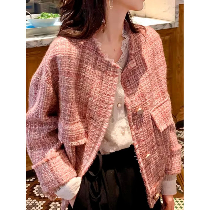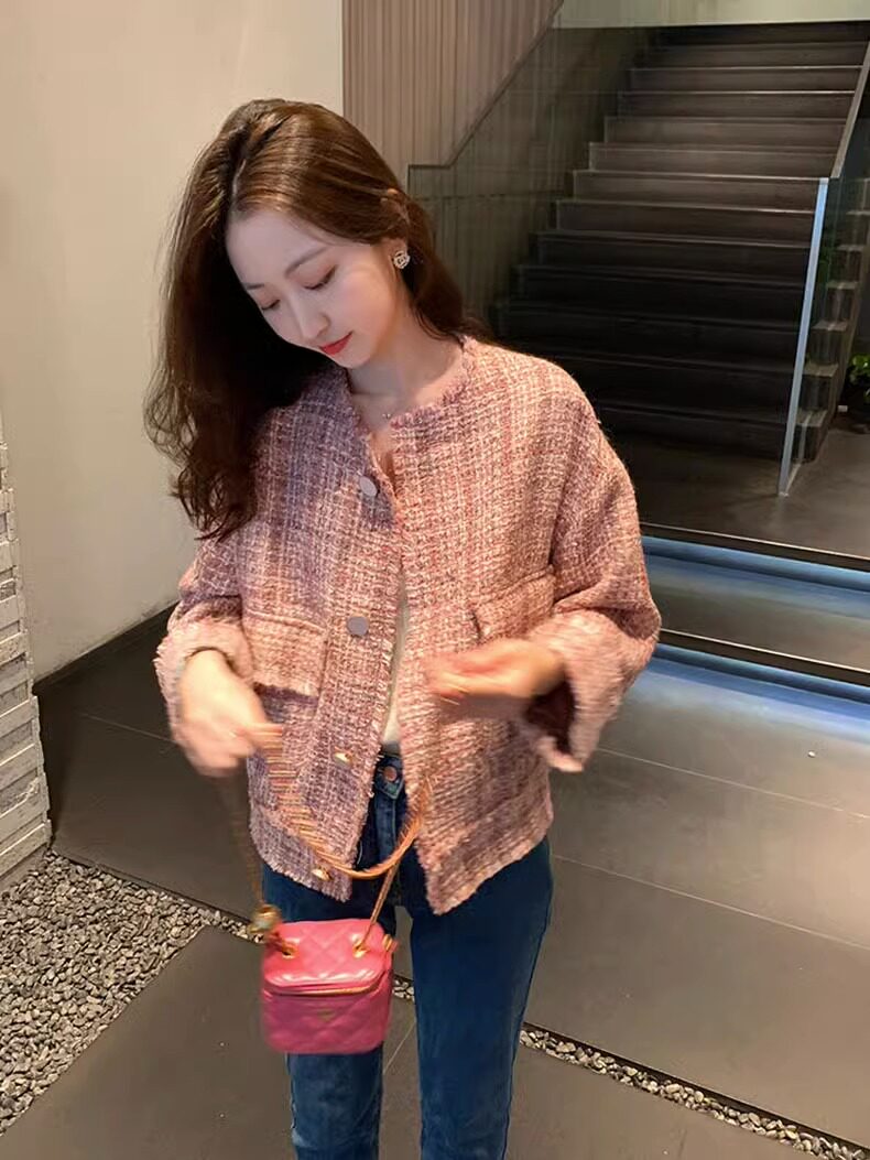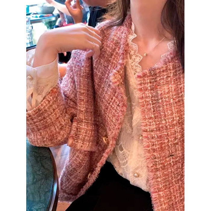時尚高級感2025年新款秋季女裝法式設計小香風粉色粗花呢外套上衣