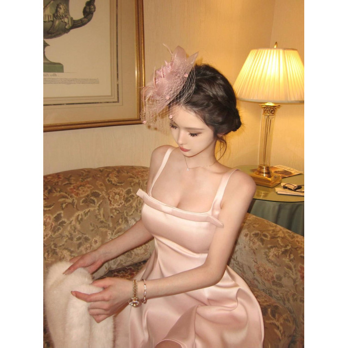 kiti 生日party小禮裙年會禮服聚會戰袍富家千金感粉色吊帶連衣裙