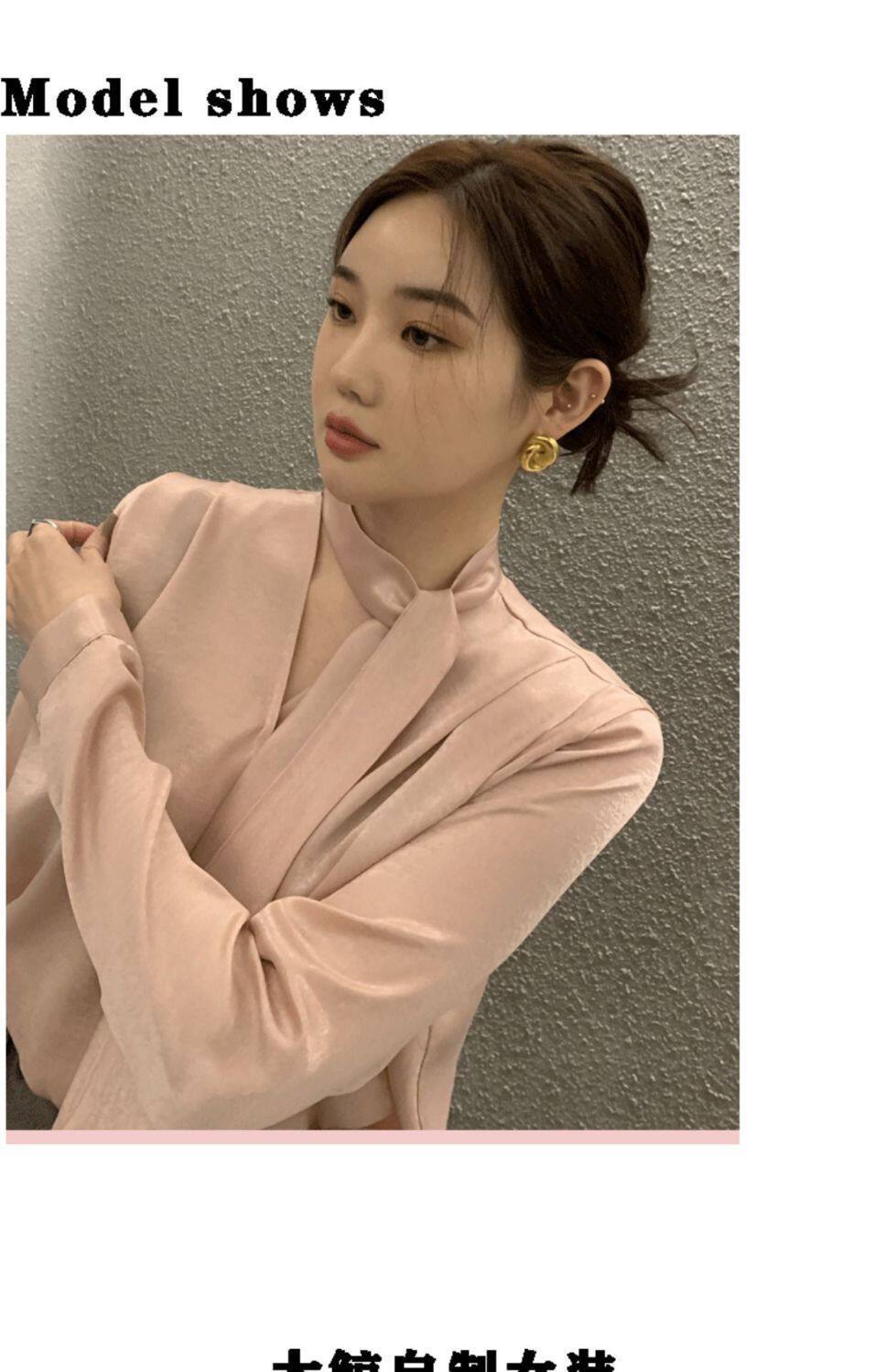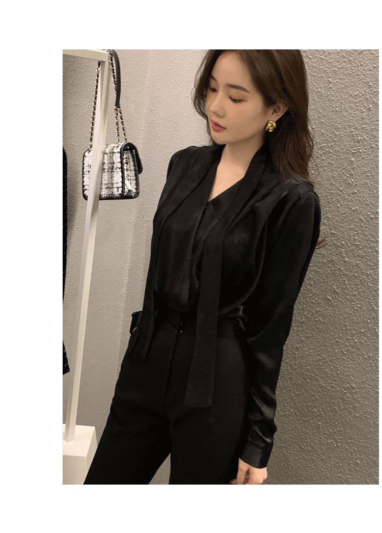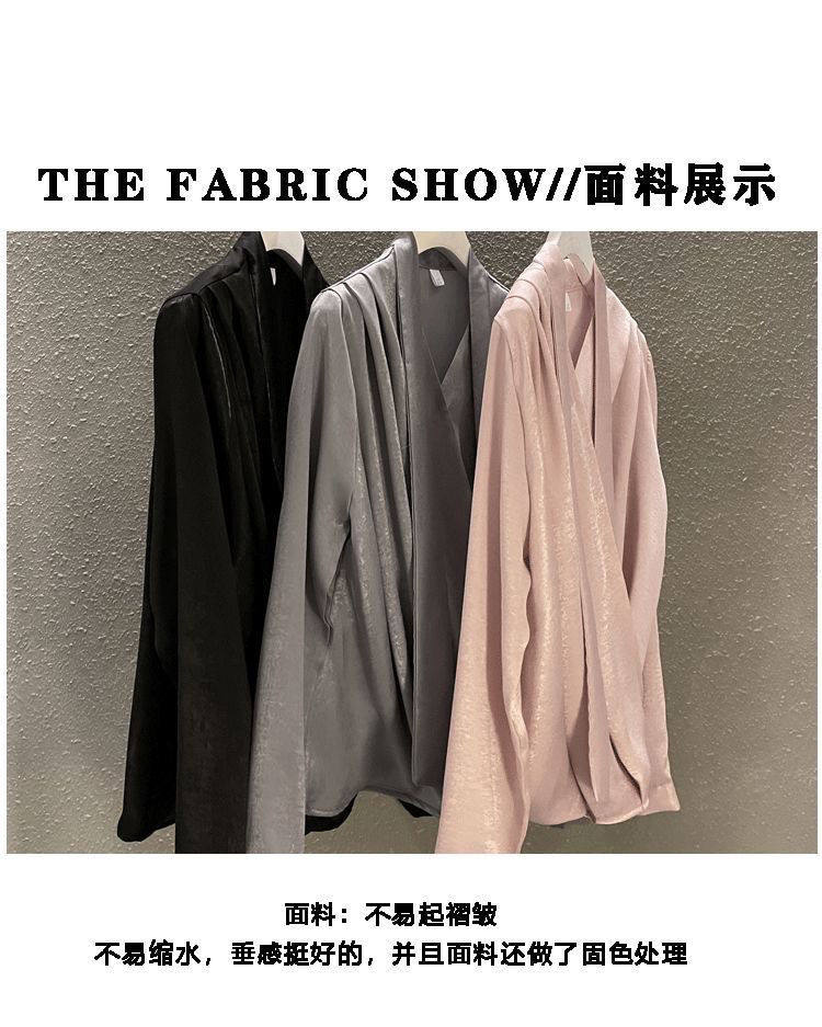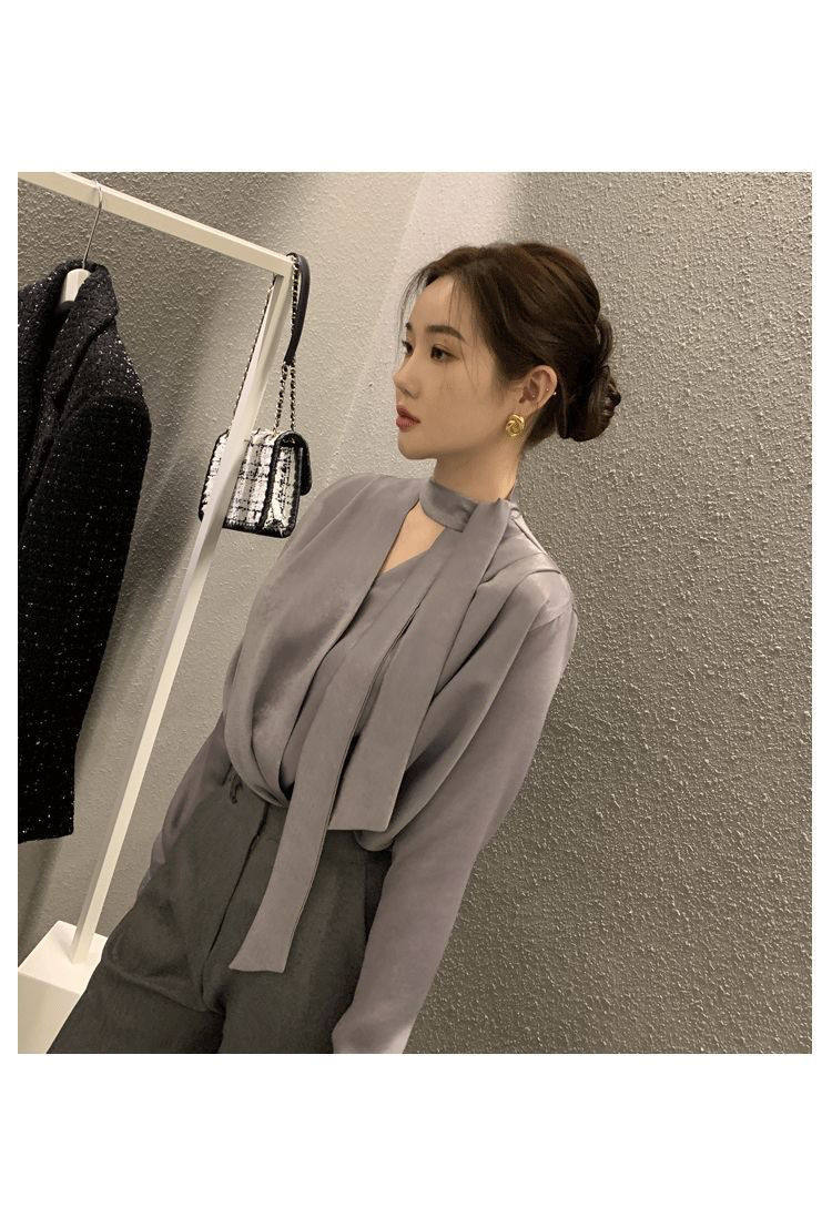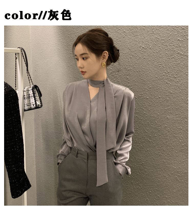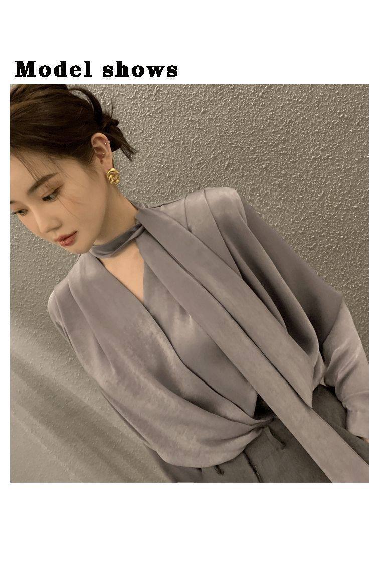雪紡緞面系帶掛脖V領襯衫女春秋季新款高級感輕熟風小衫長袖上衣