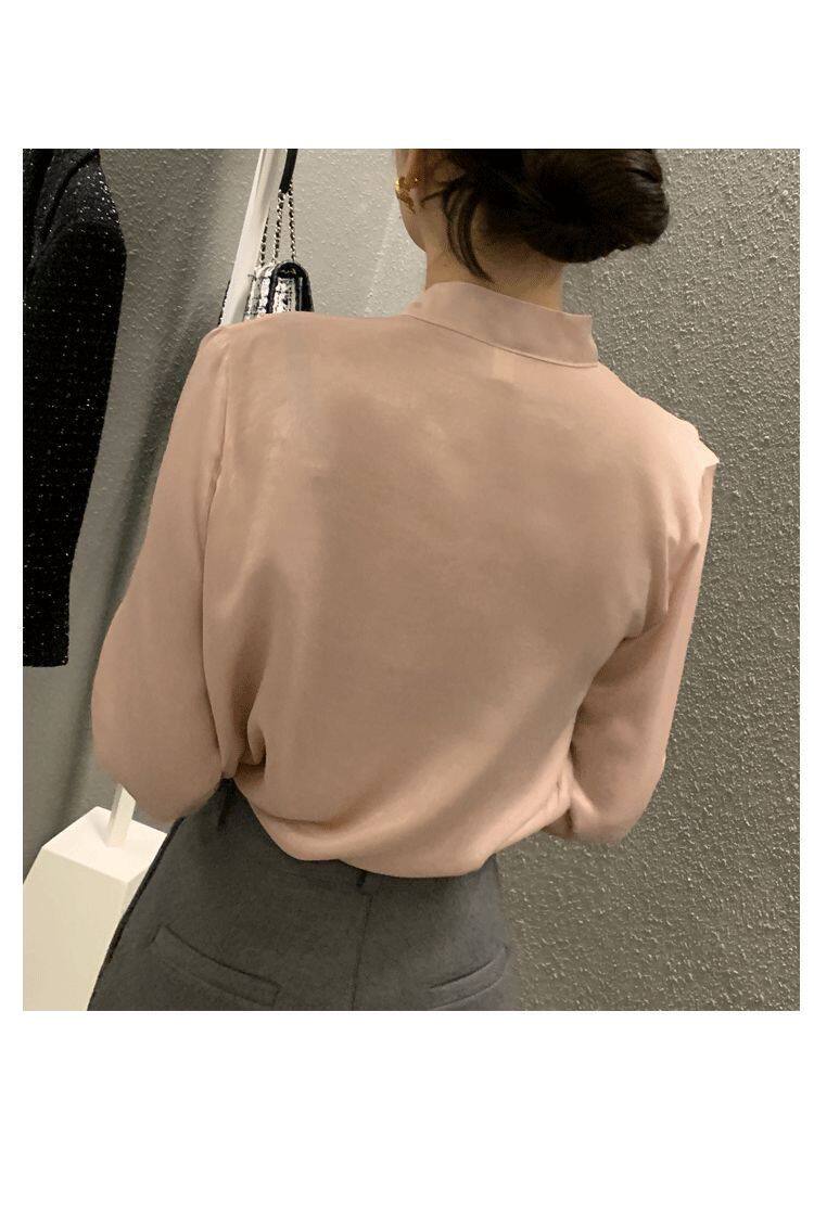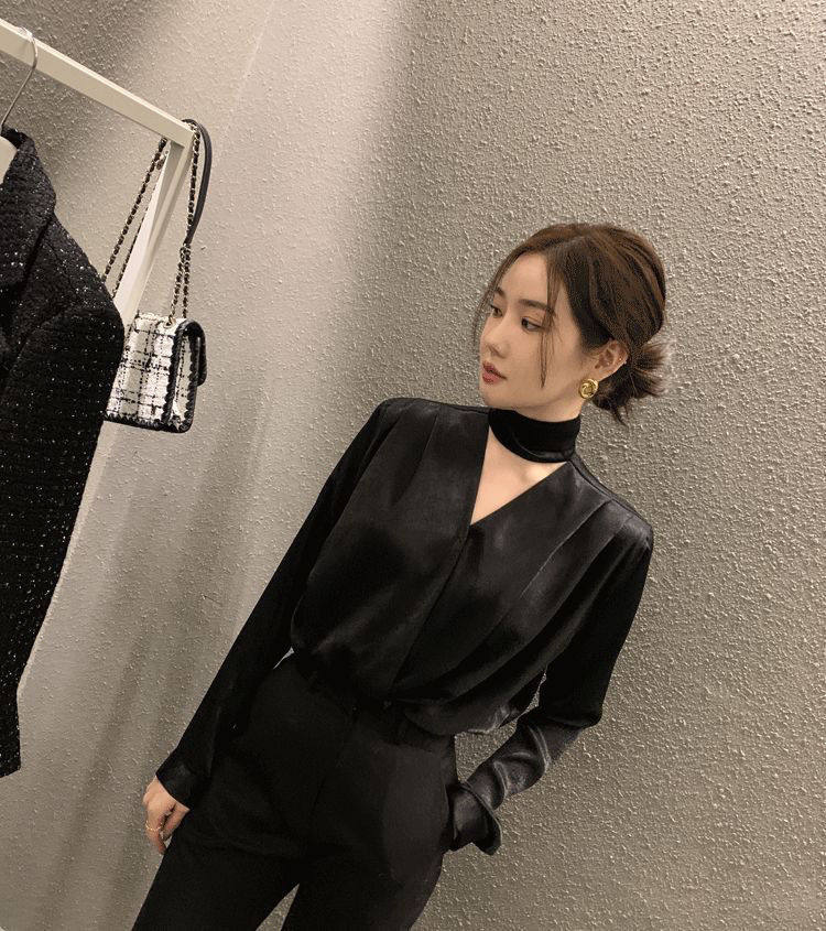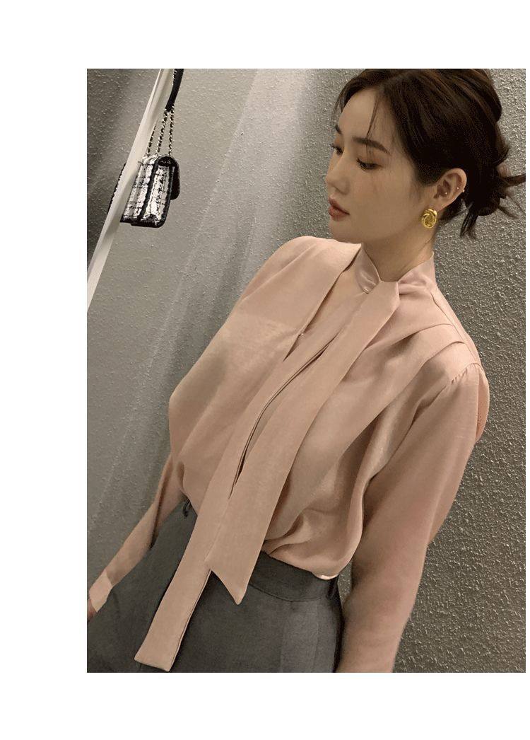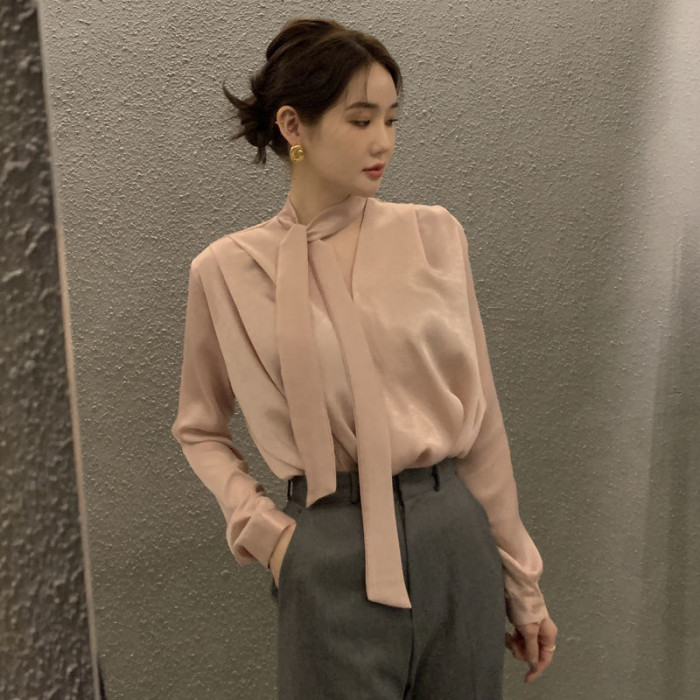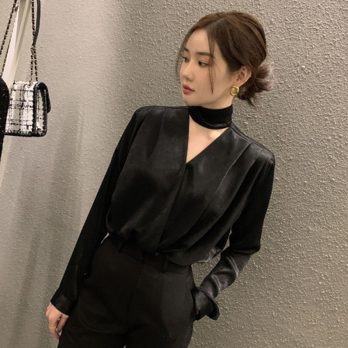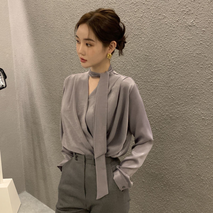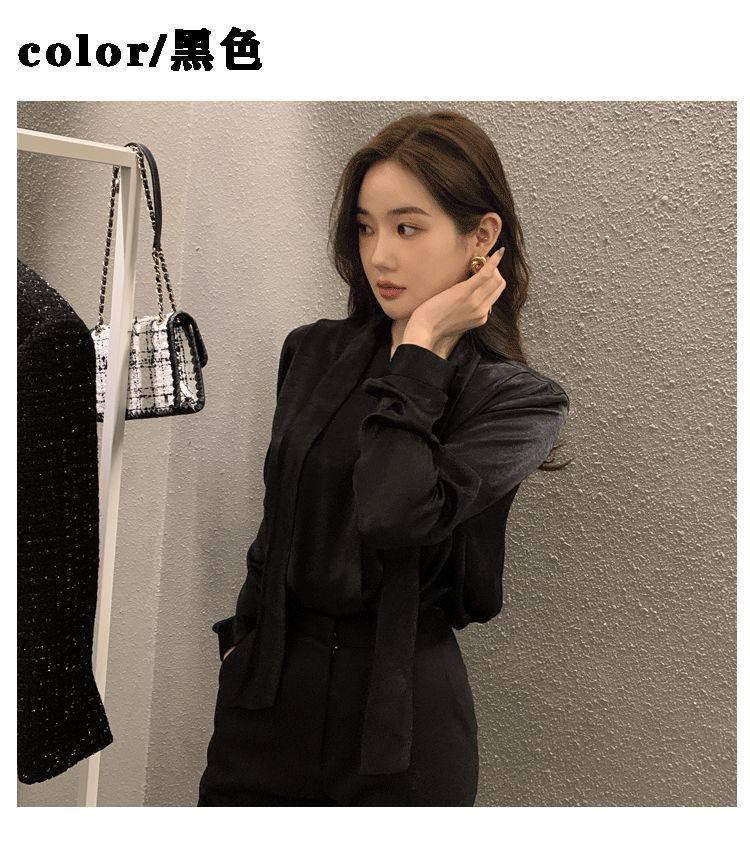 雪紡緞面系帶掛脖V領襯衫女春秋季新款高級感輕熟風小衫長袖上衣