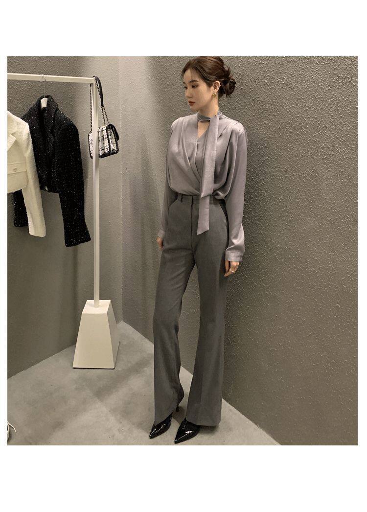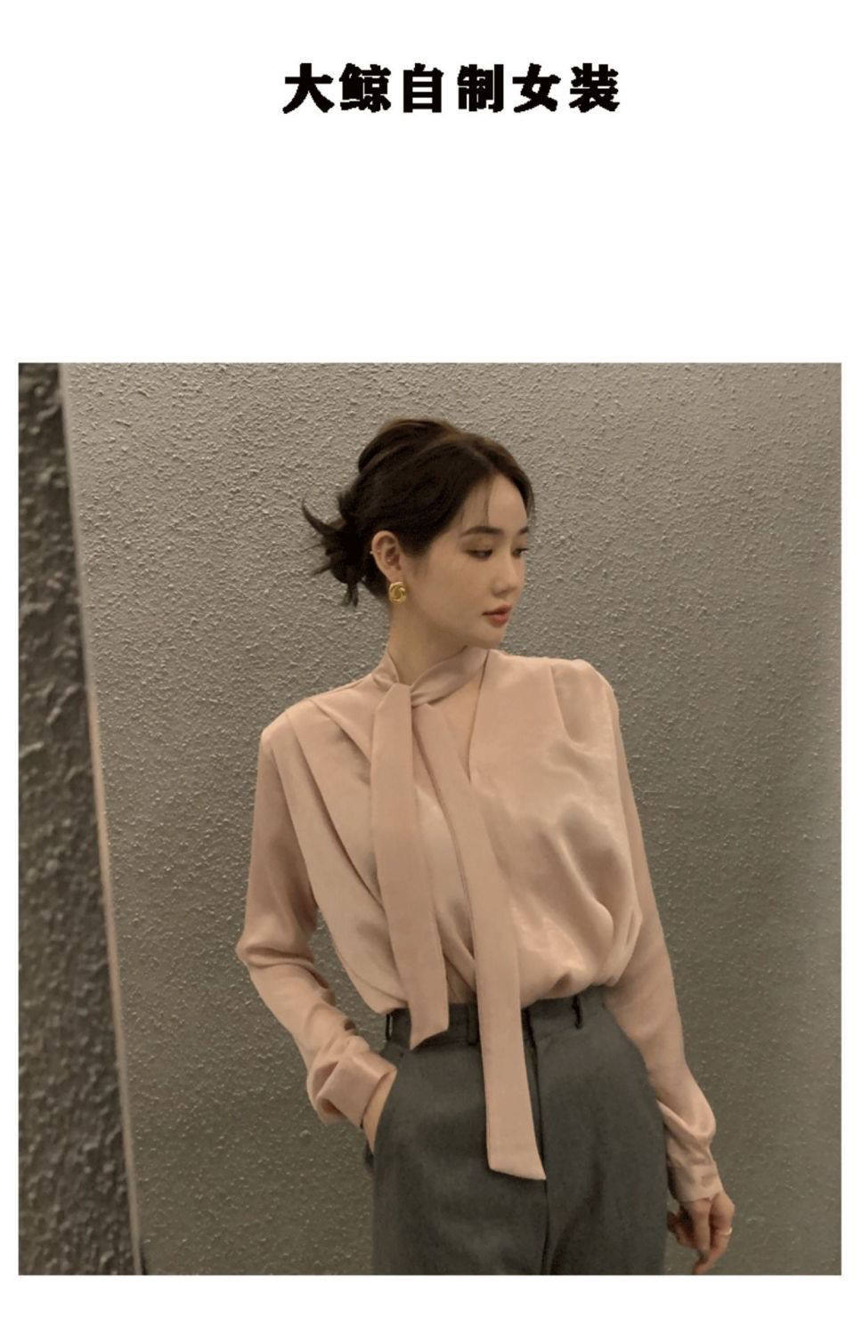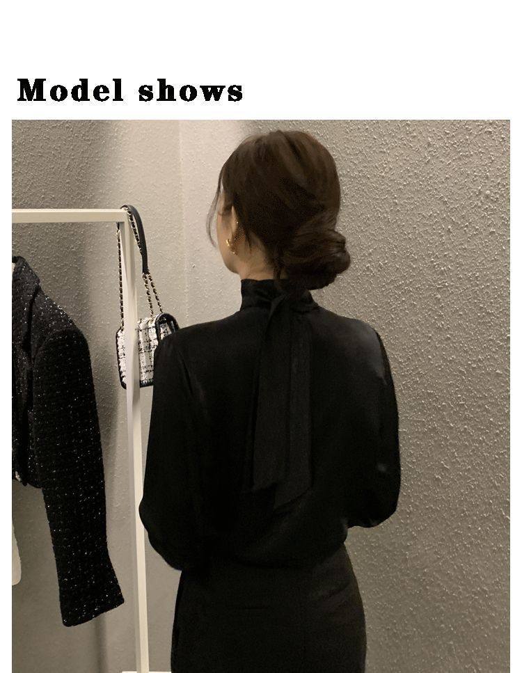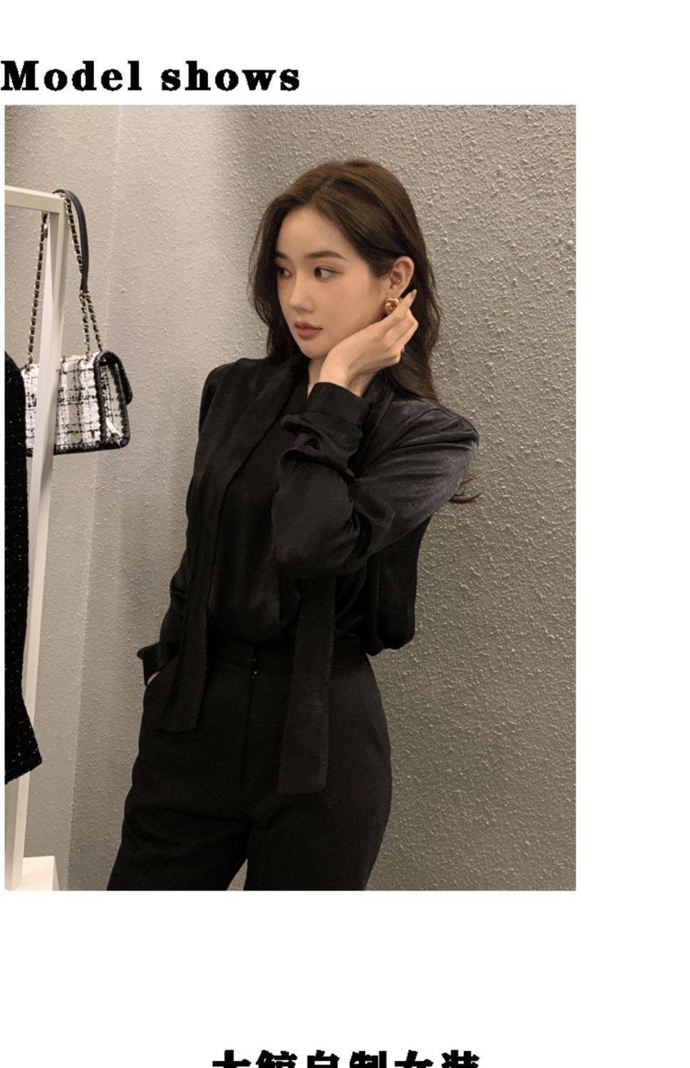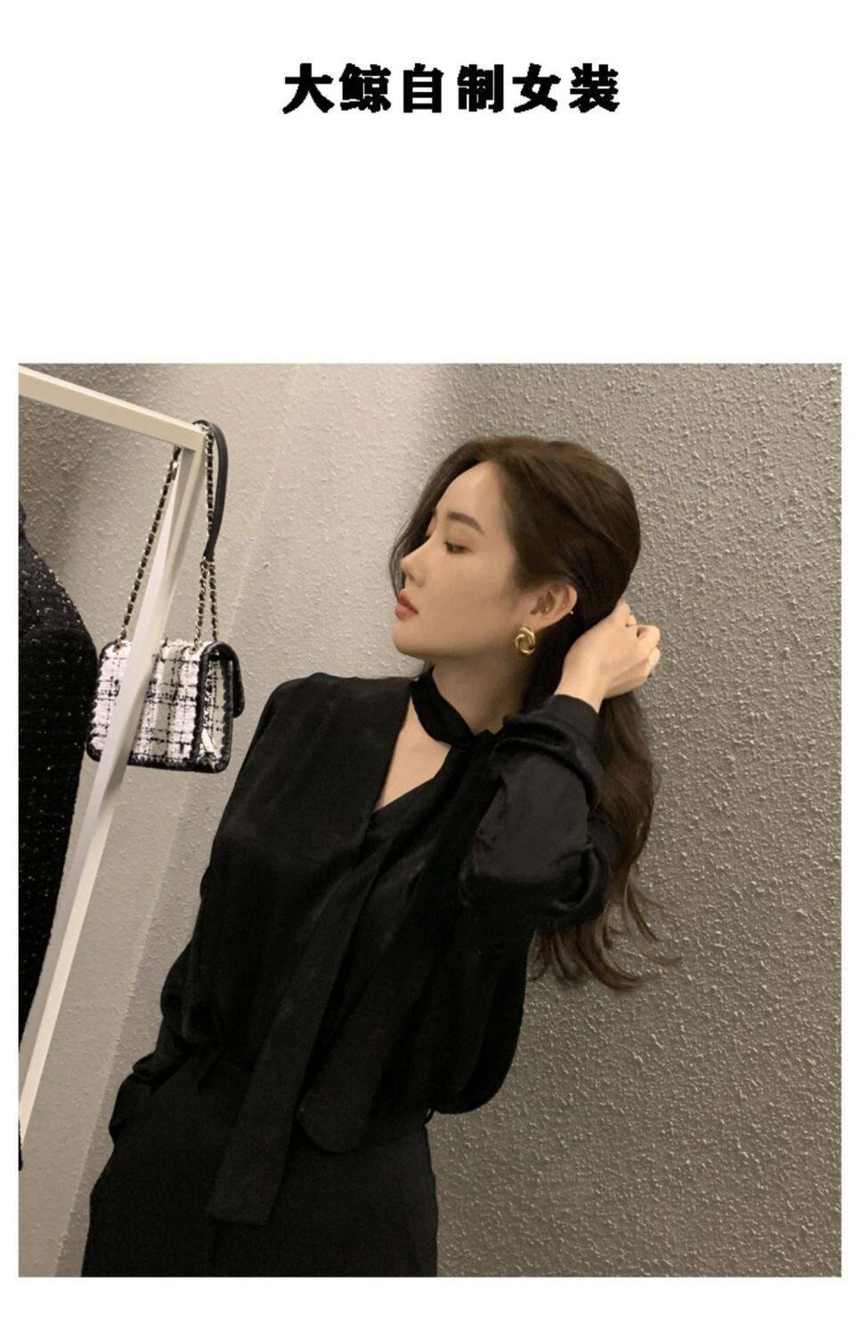 雪紡緞面系帶掛脖V領襯衫女春秋季新款高級感輕熟風小衫長袖上衣
