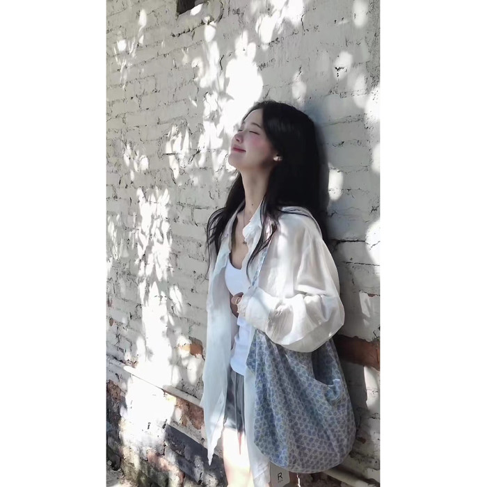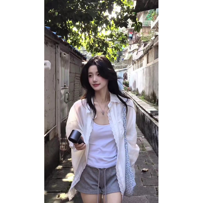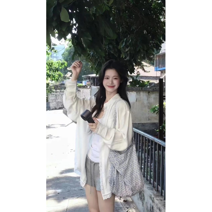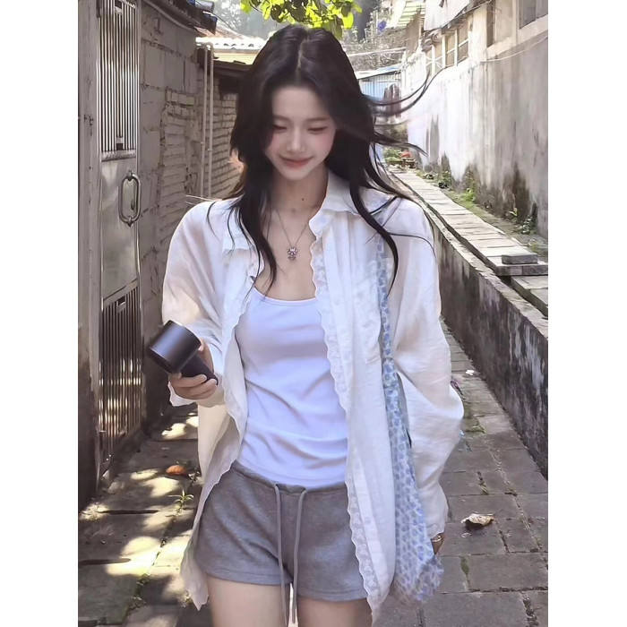 韓裡韓氣減齡上衣寬鬆慵懶風淡人系白色蕾絲邊繙領防曬襯衫女夏季