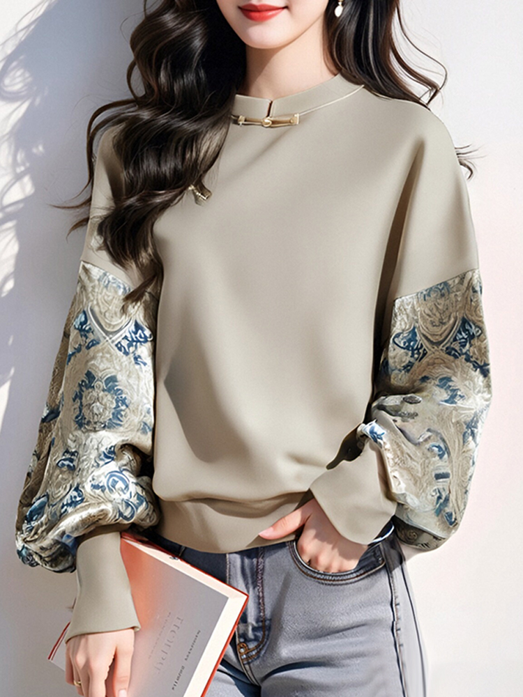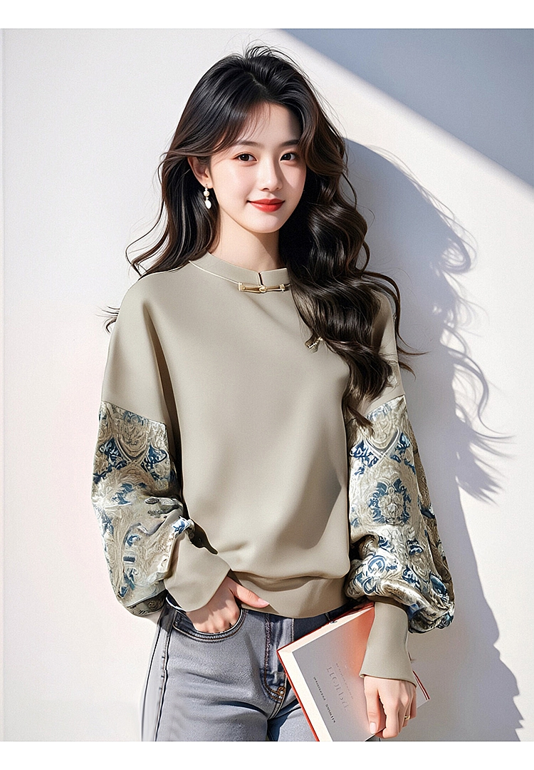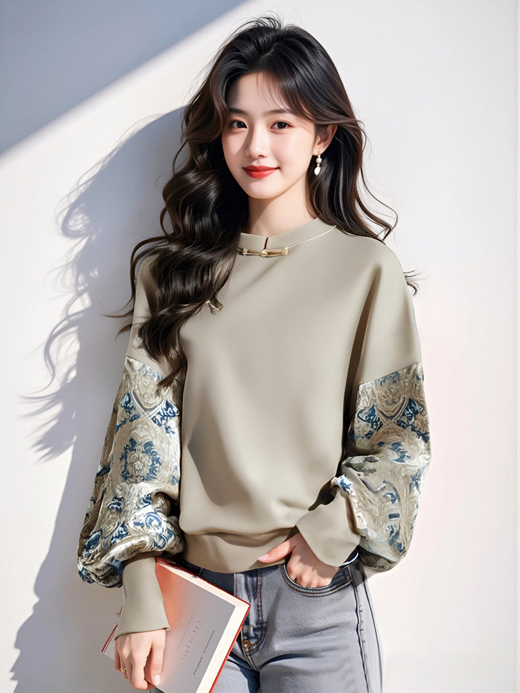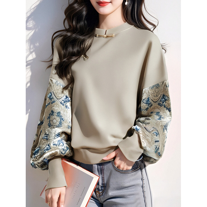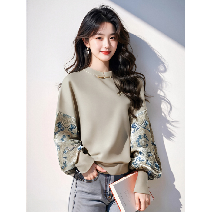 新中式國風拼色印花寬鬆衛衣女外套2025春秋新款復古盤釦拼接上衣