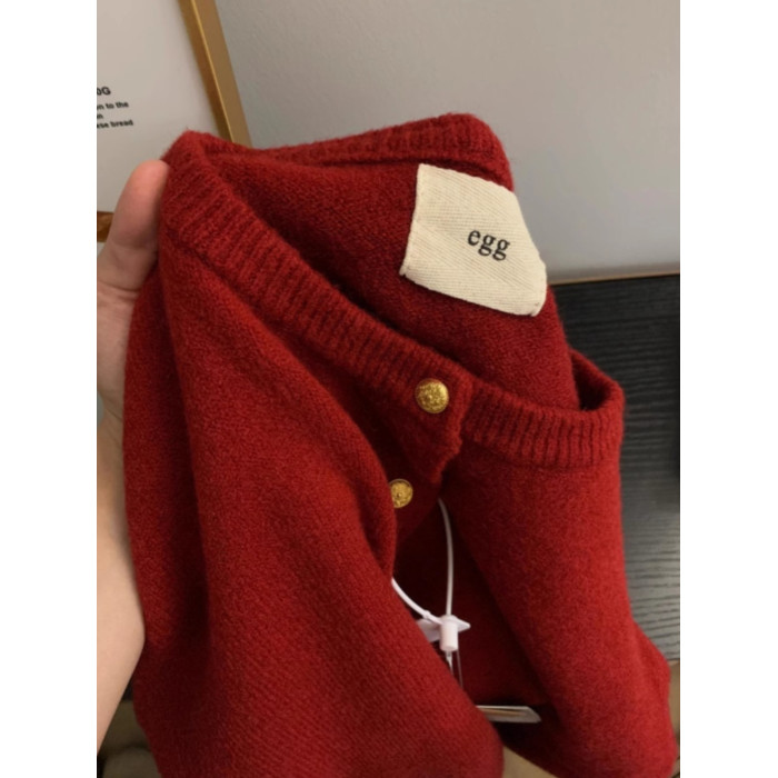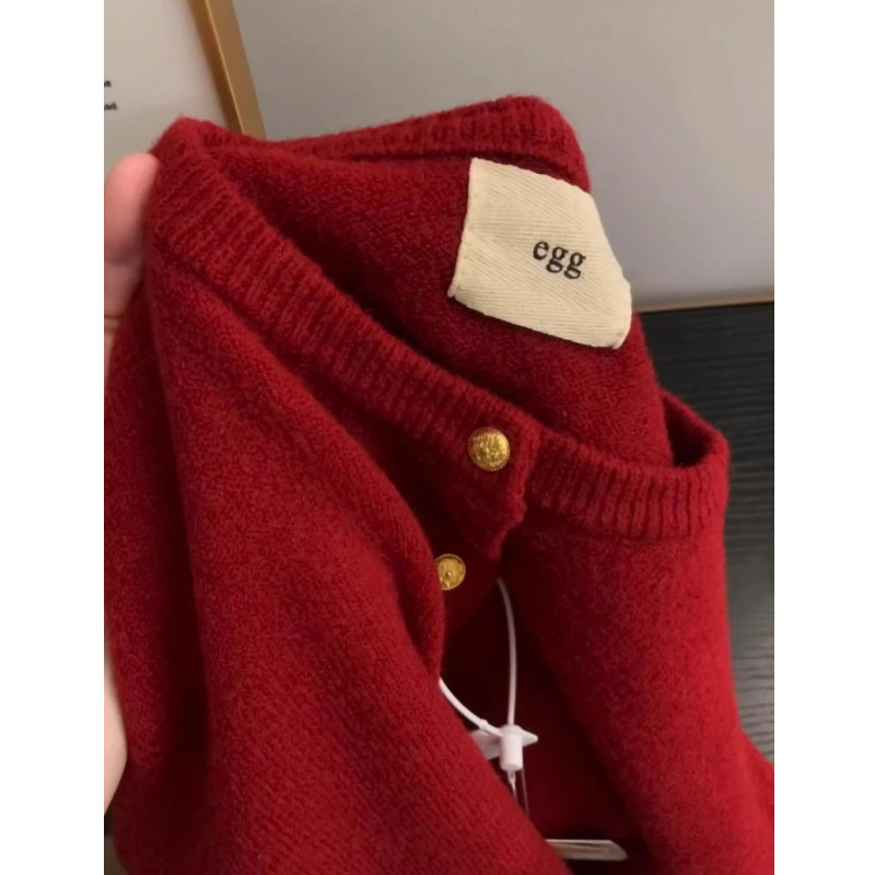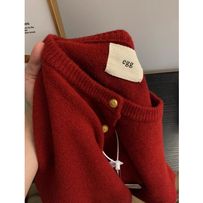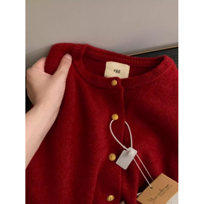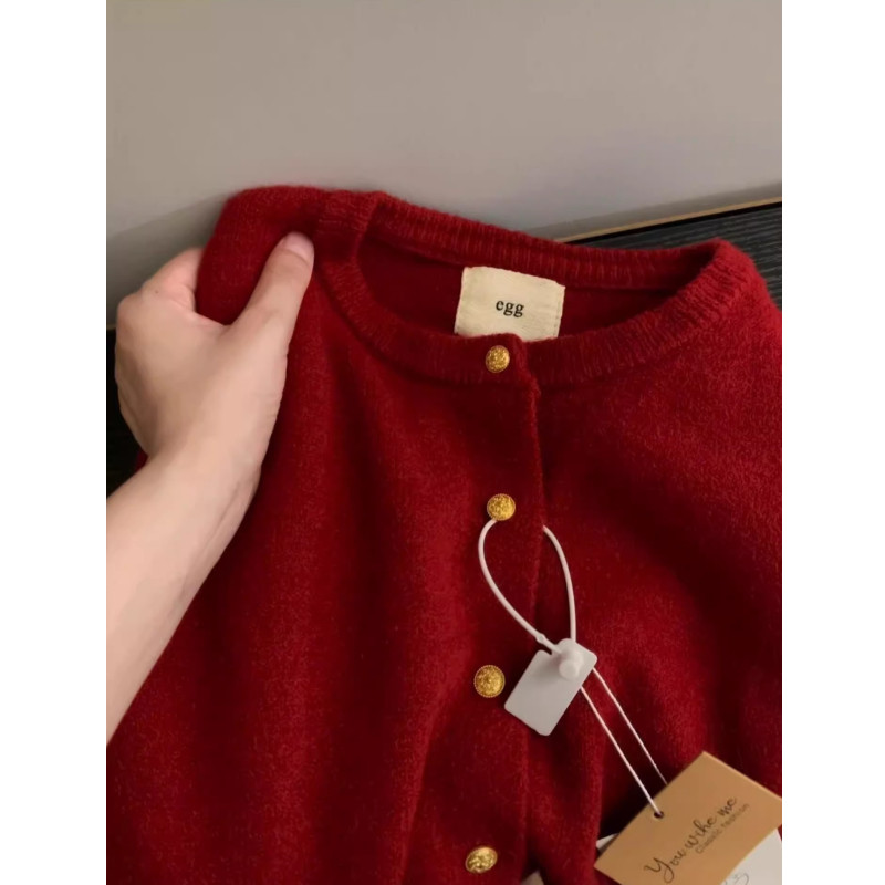 歐貨高級感復古紅色小金釦針織開衫女秋冬洋氣別致浣熊絨毛衣外套