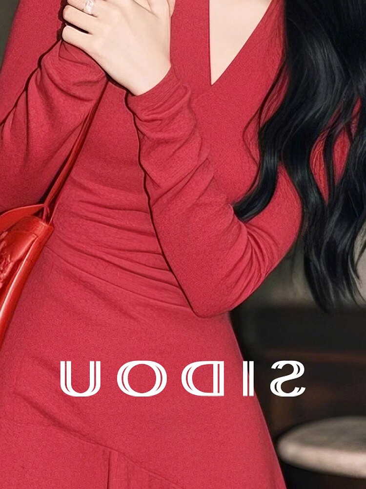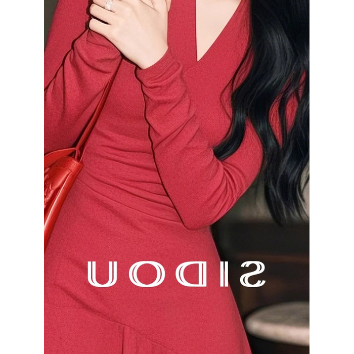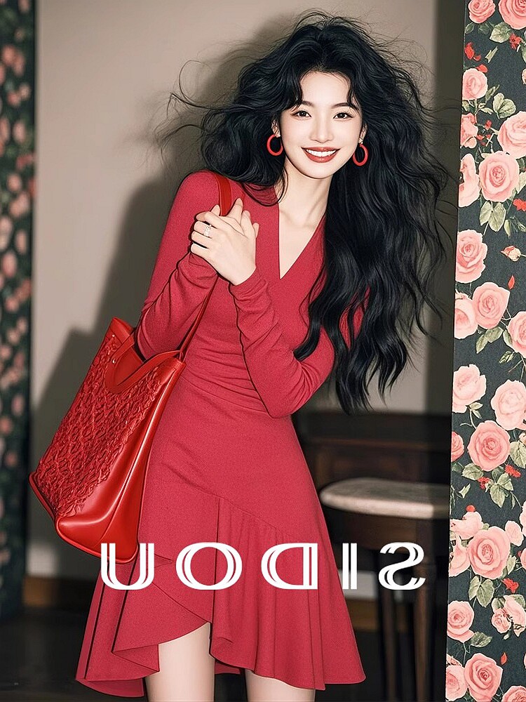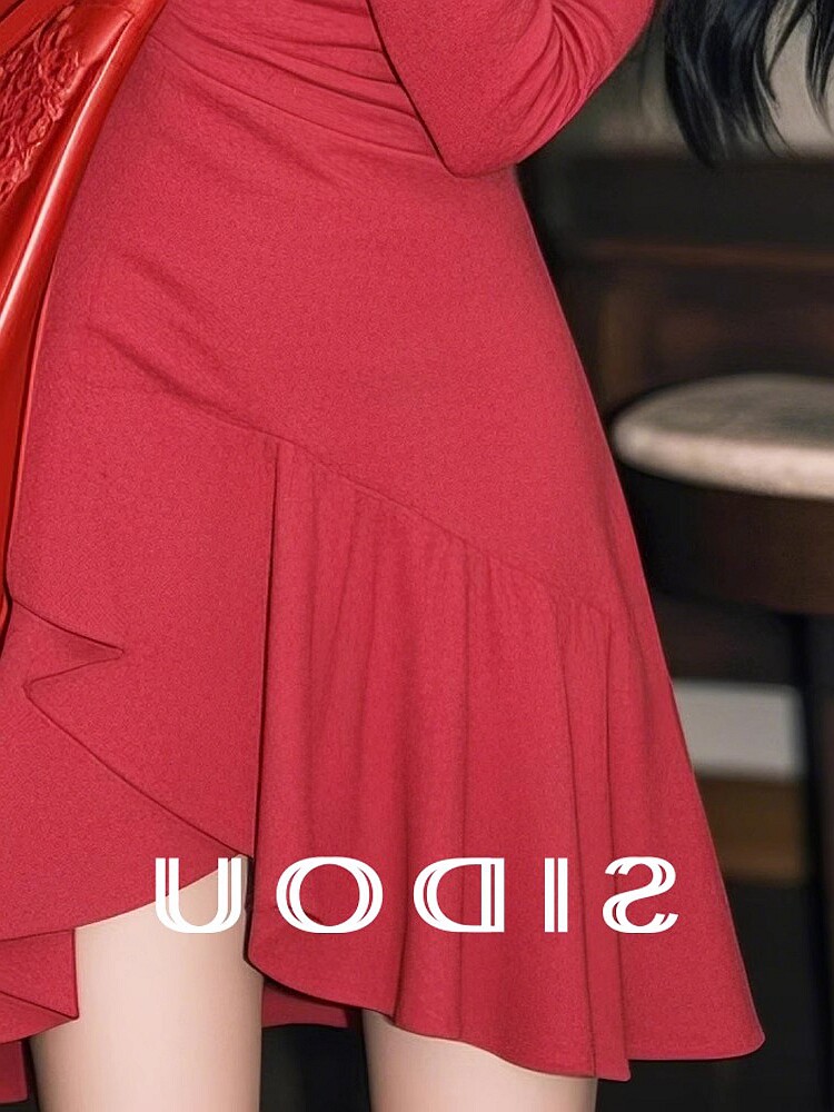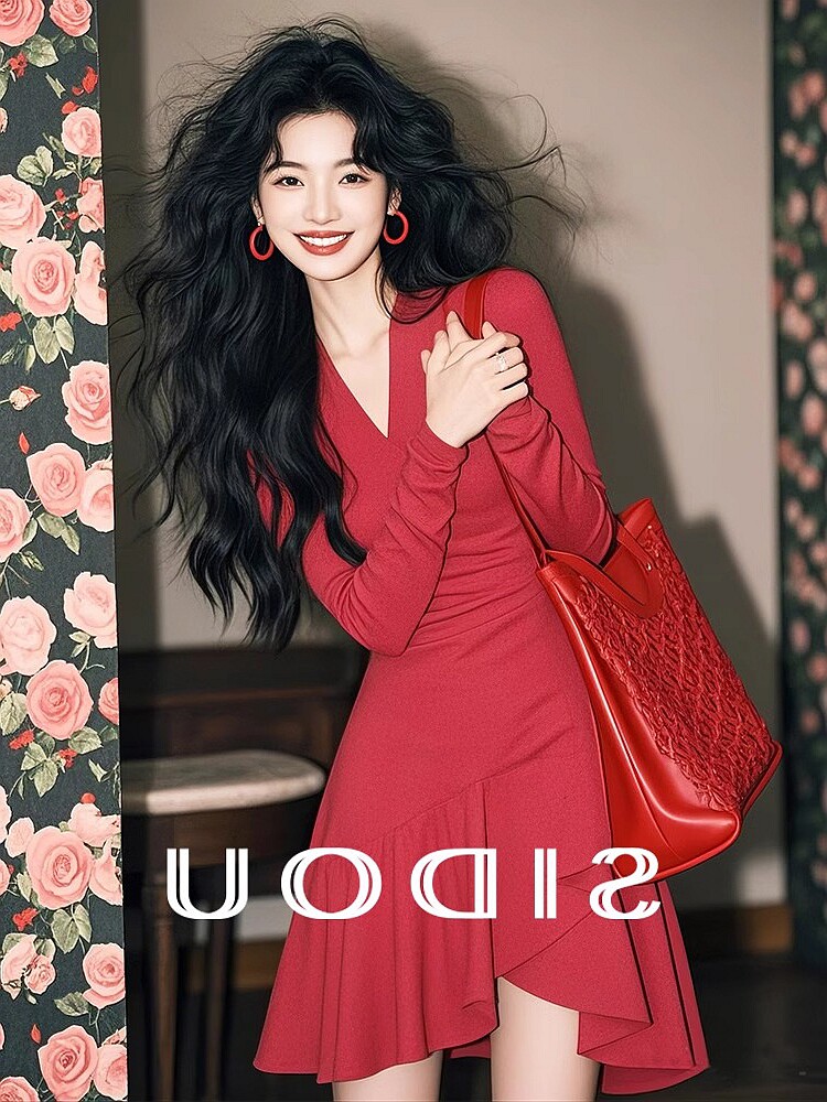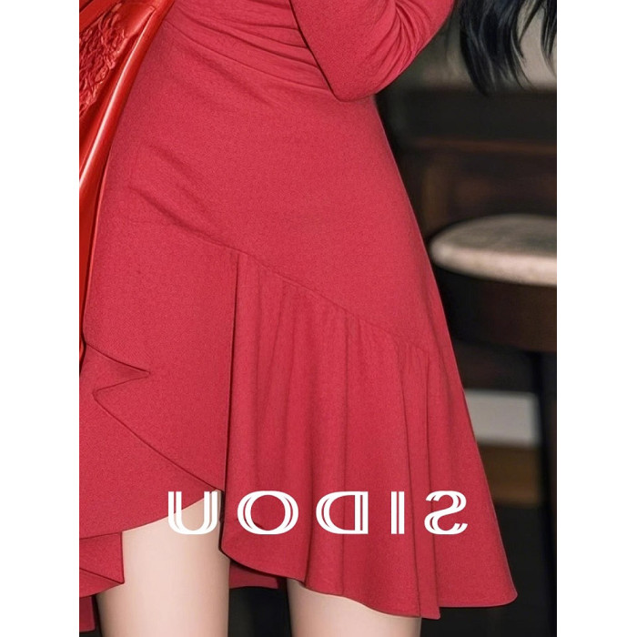 專櫃撤櫃春季新款韓系千金感穿搭復古收腰顯瘦紅色不規則連衣裙女