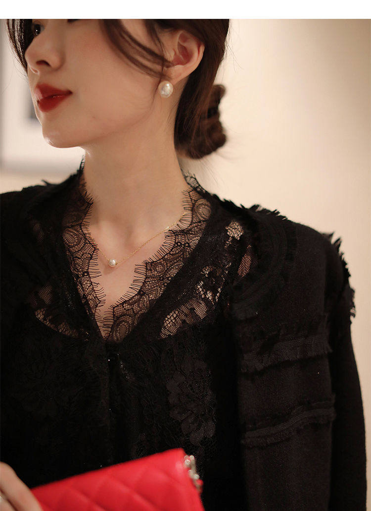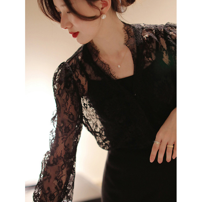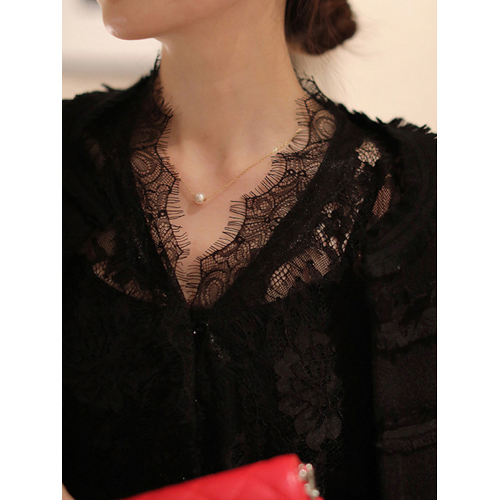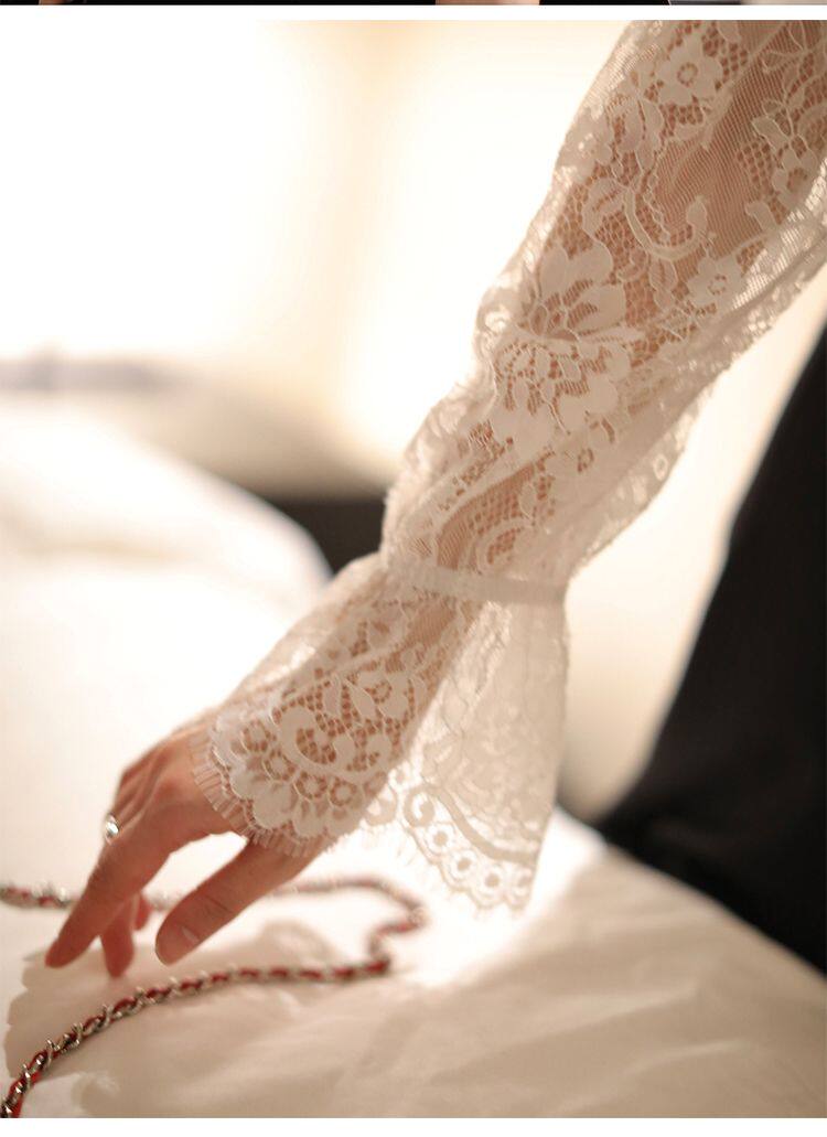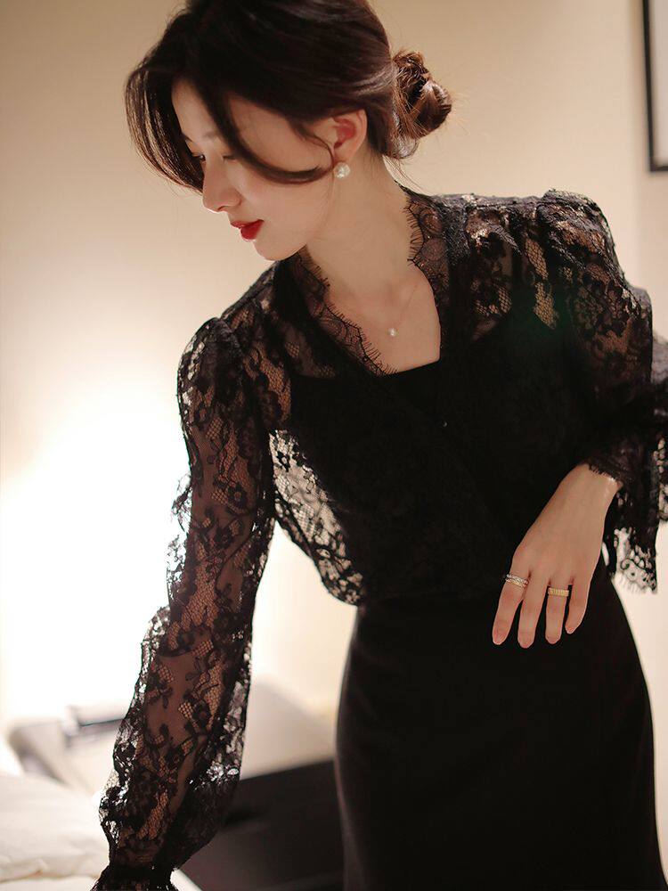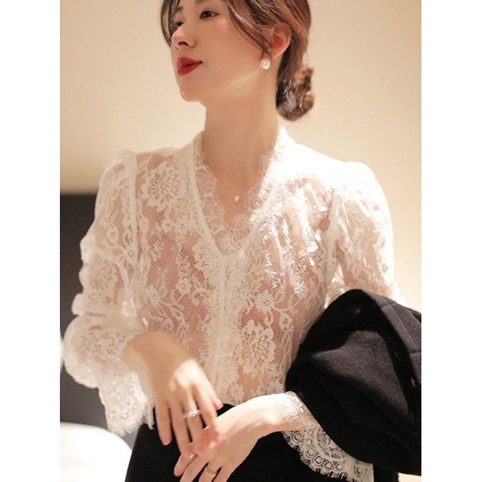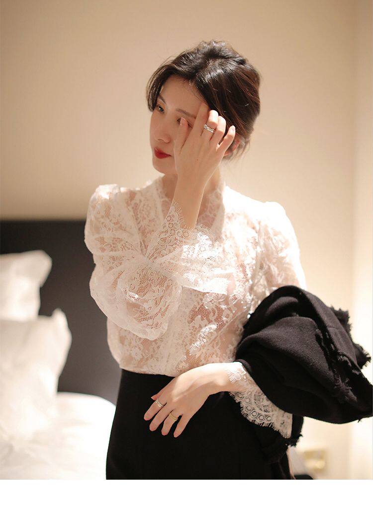 法式v領打底蕾絲衫女2025秋冬洋氣網紗長袖襯衫鏤空性感內搭上衣