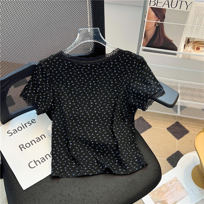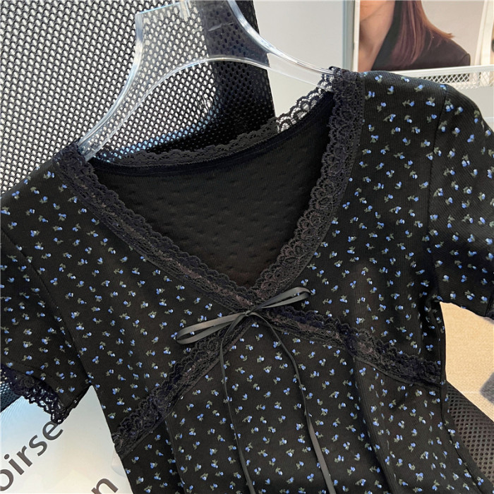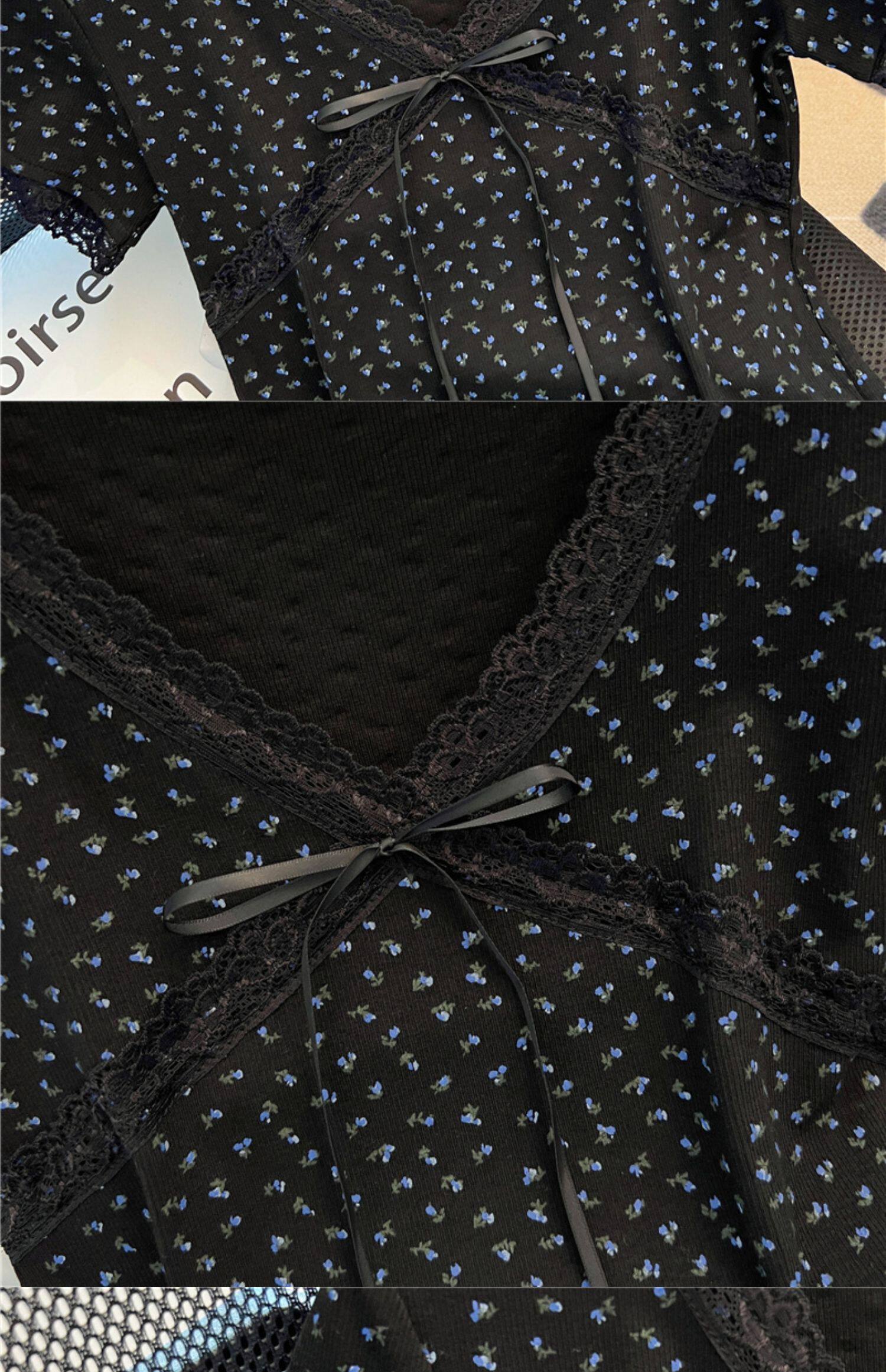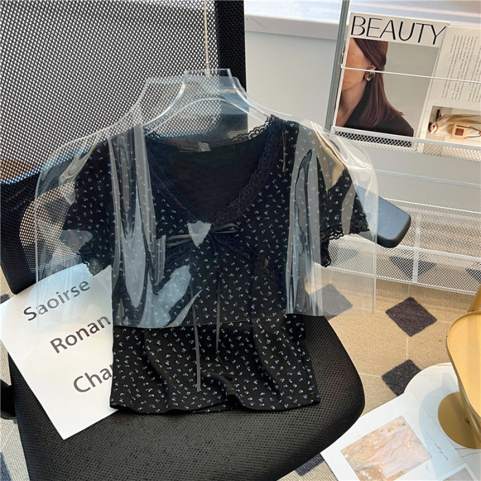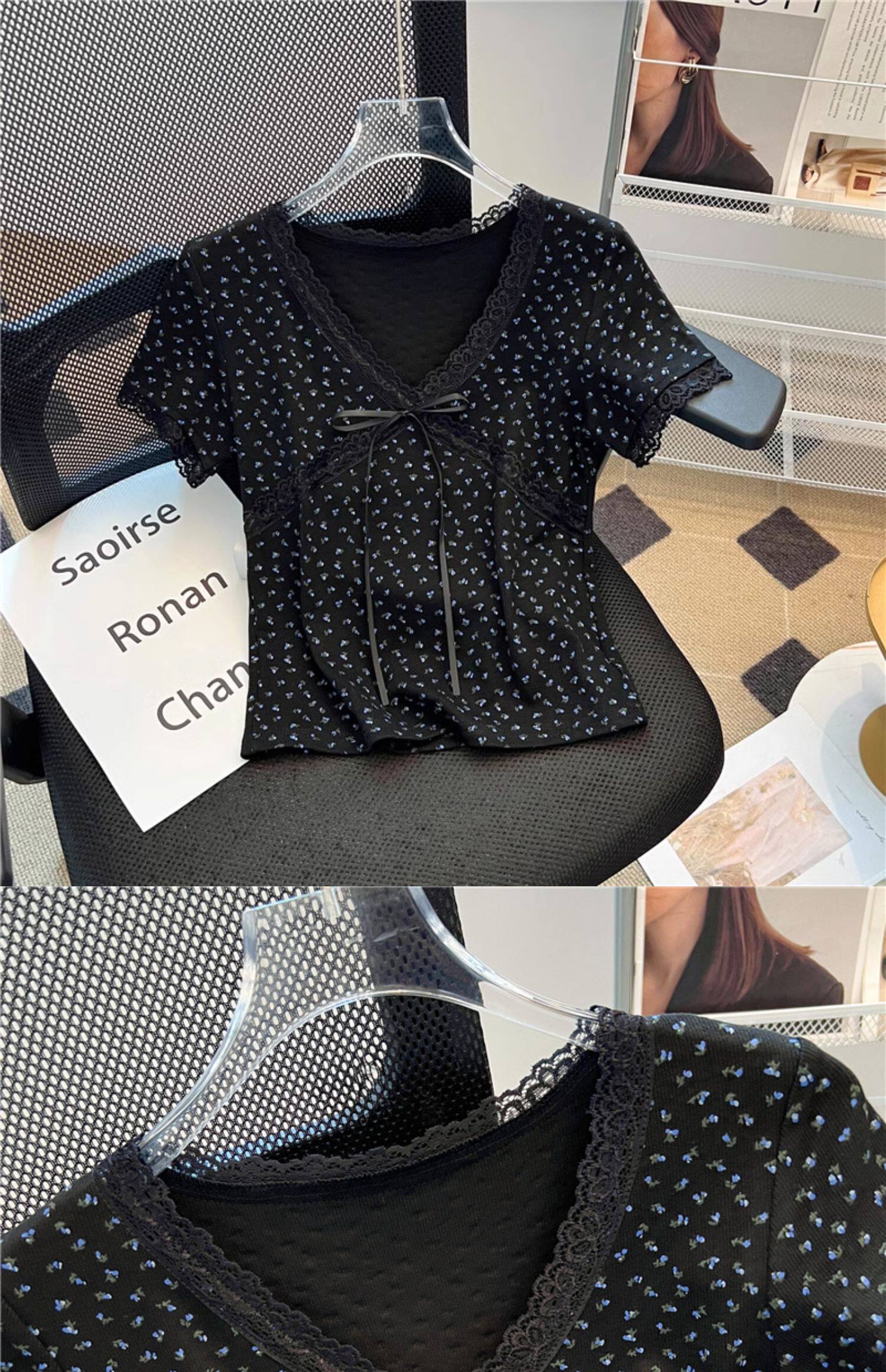 專櫃撤廻剪標黑色V領碎花短袖T恤女夏季新款設計感正肩蝴蝶結上衣