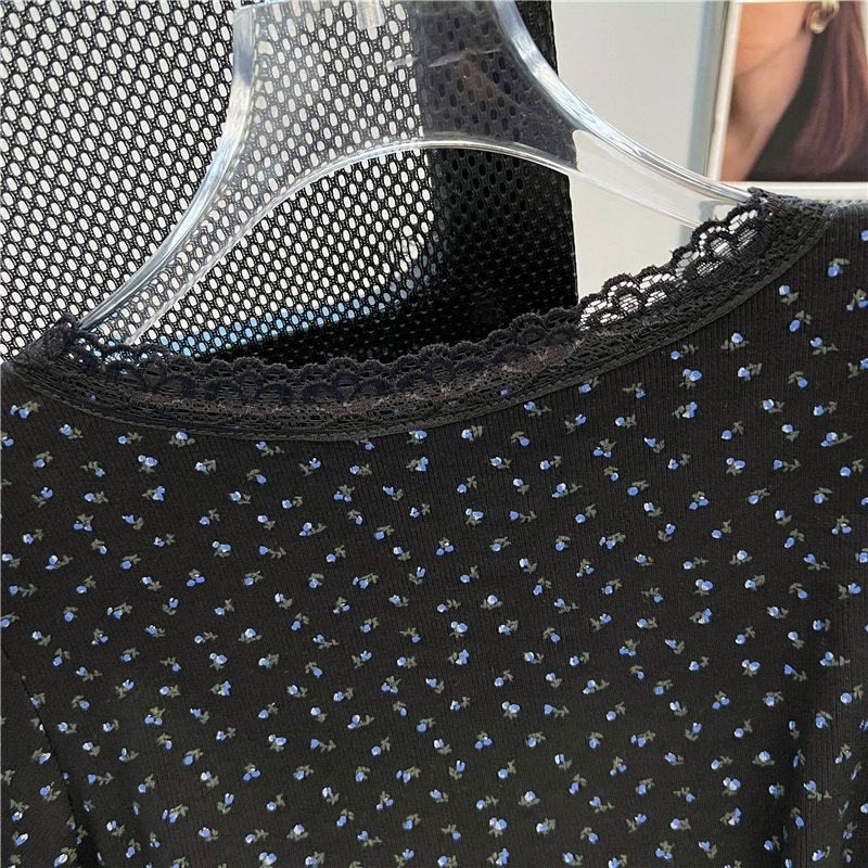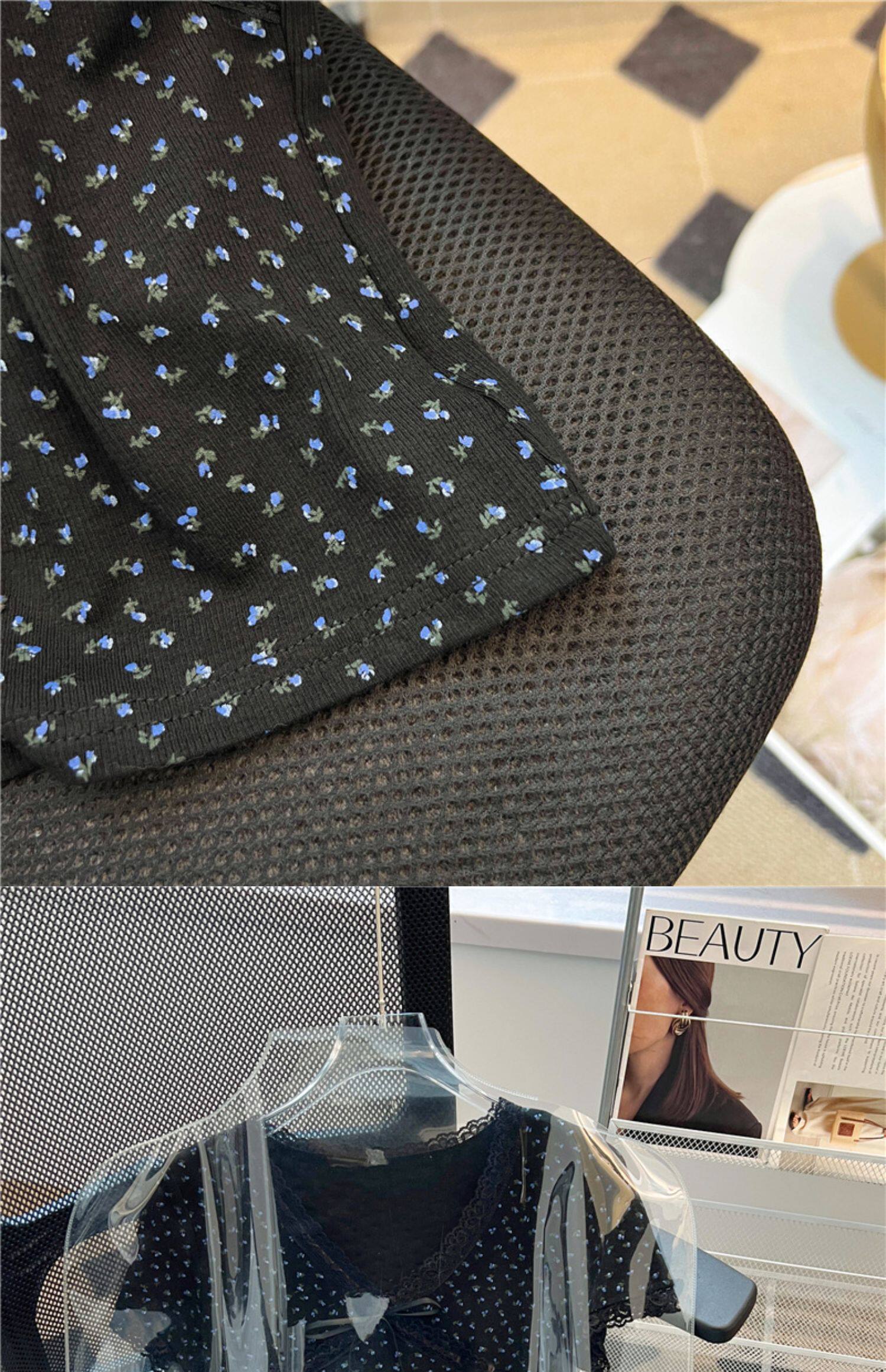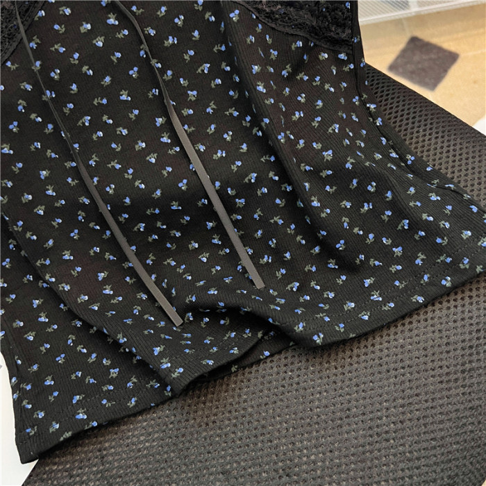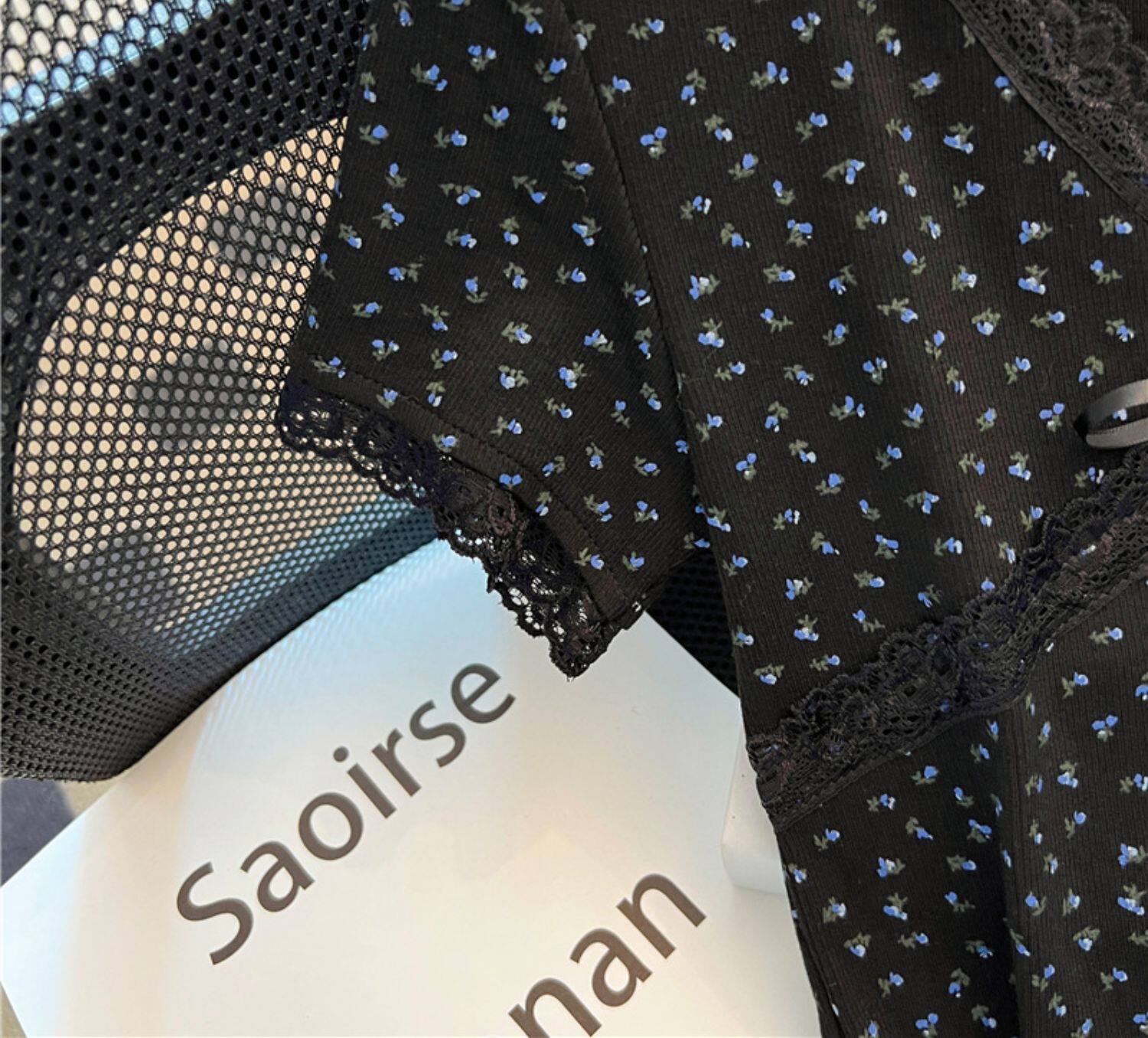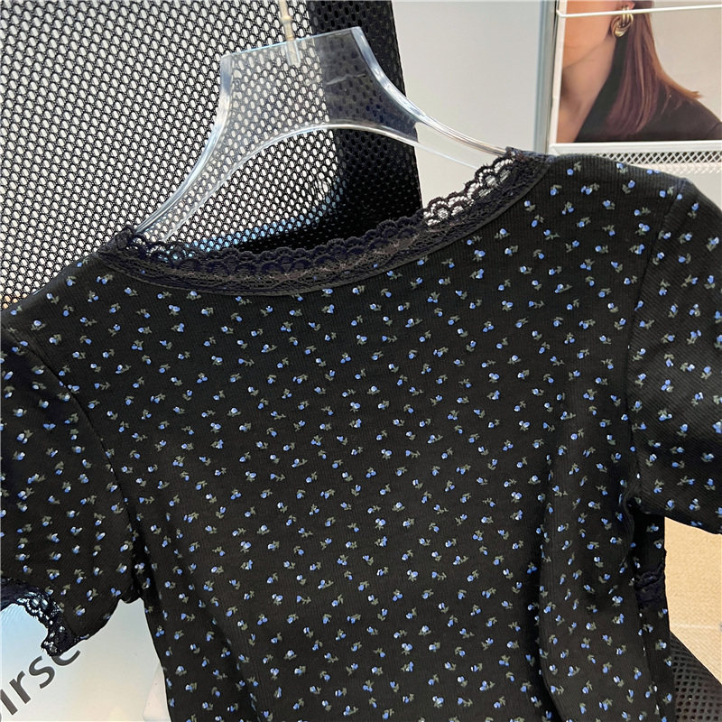 專櫃撤廻剪標黑色V領碎花短袖T恤女夏季新款設計感正肩蝴蝶結上衣