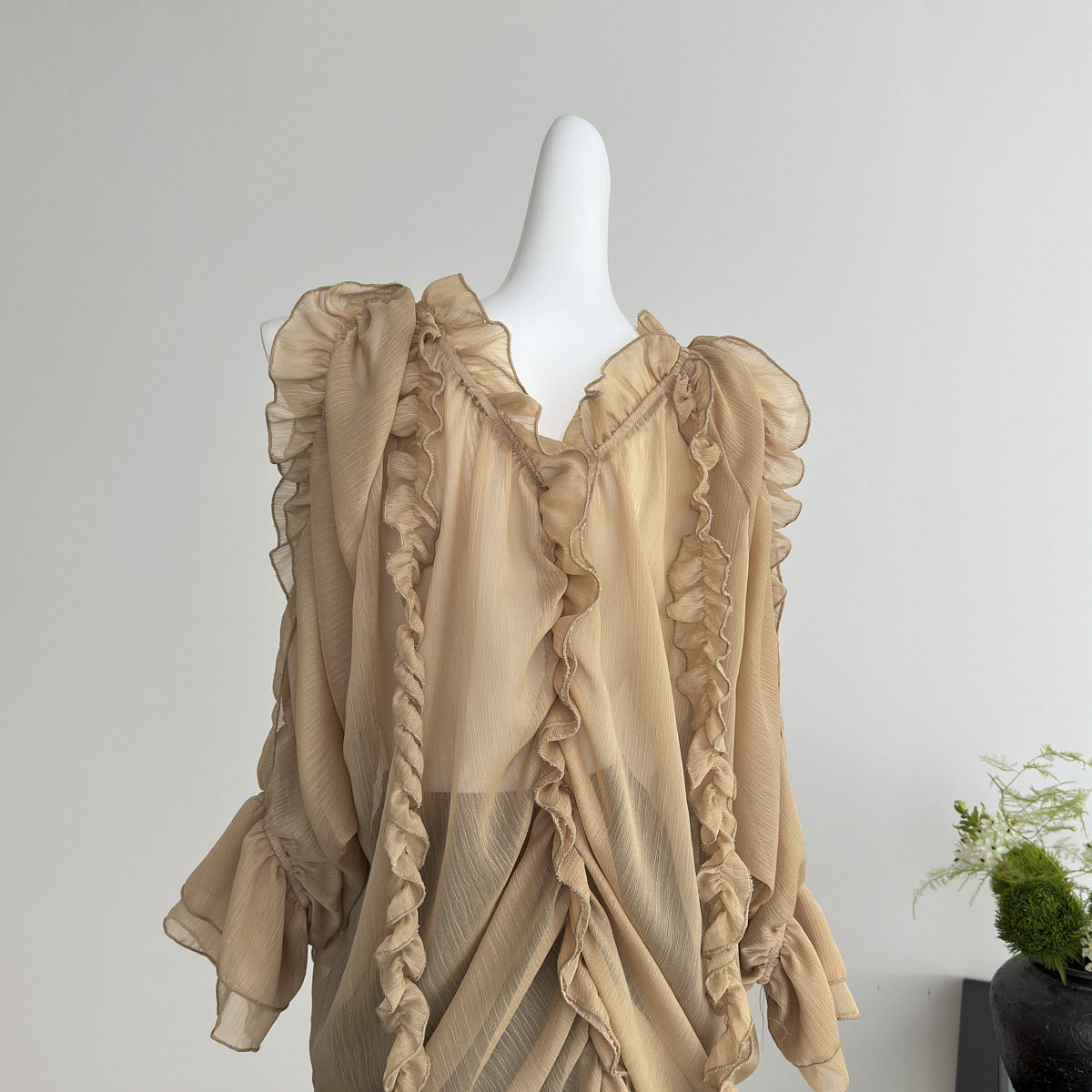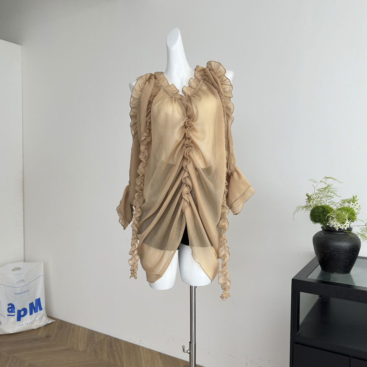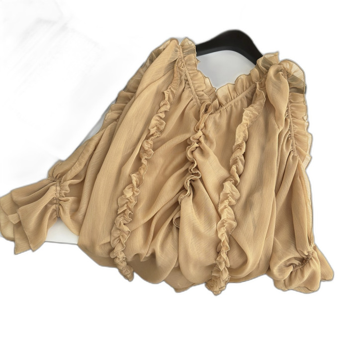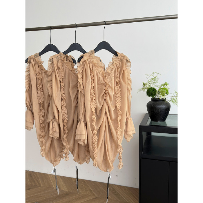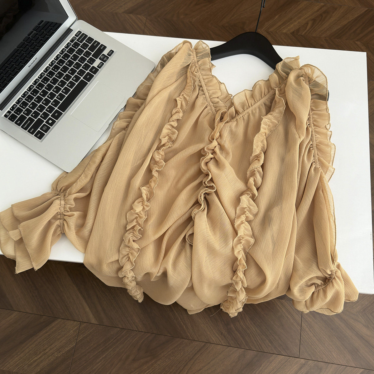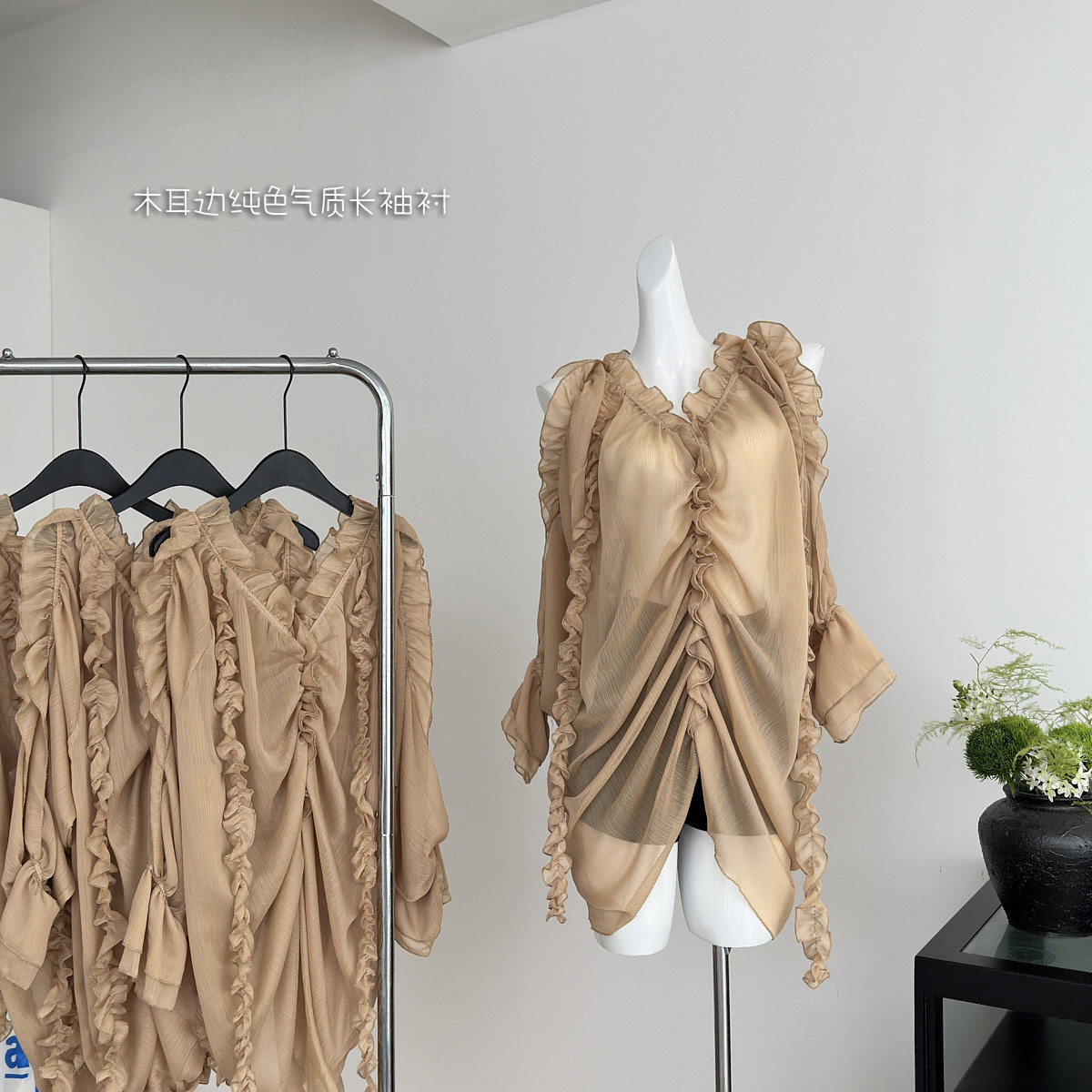 FuunJ 香氛羅曼設計感木耳邊抽褶V領長袖襯衫女慵懶寬鬆顯瘦上衣
