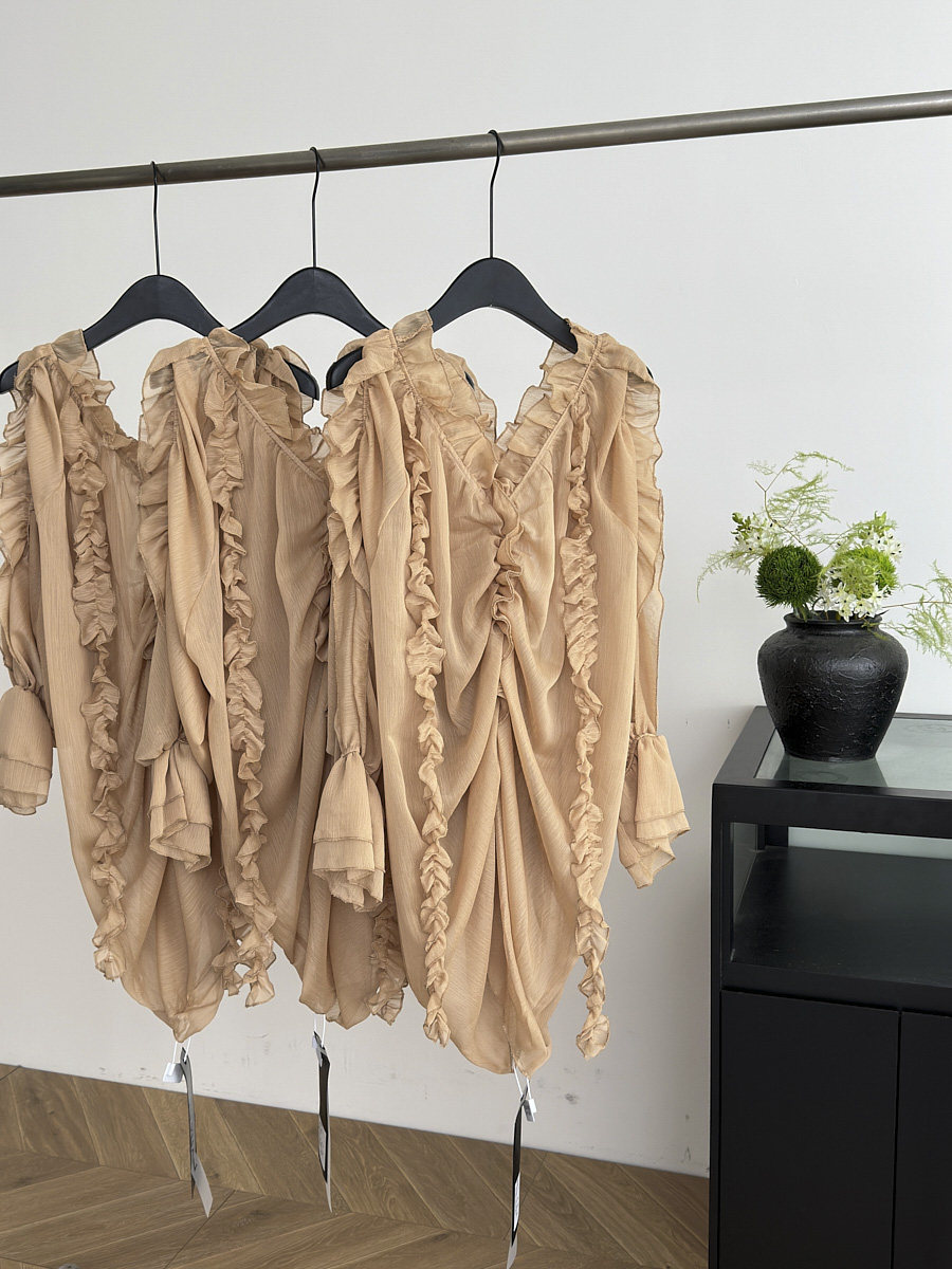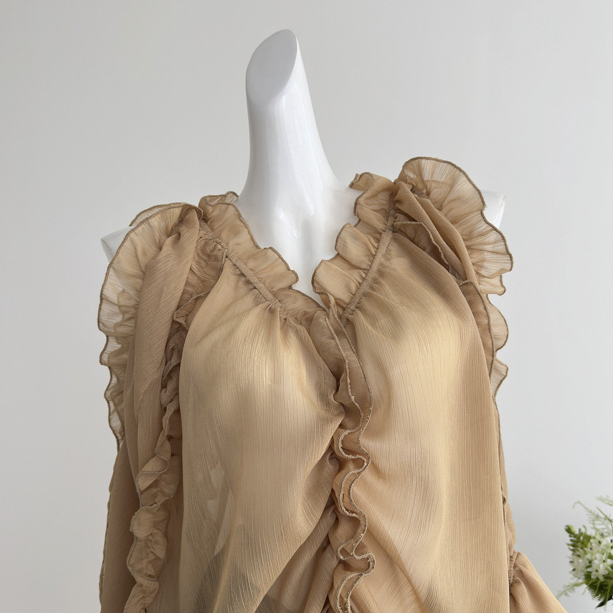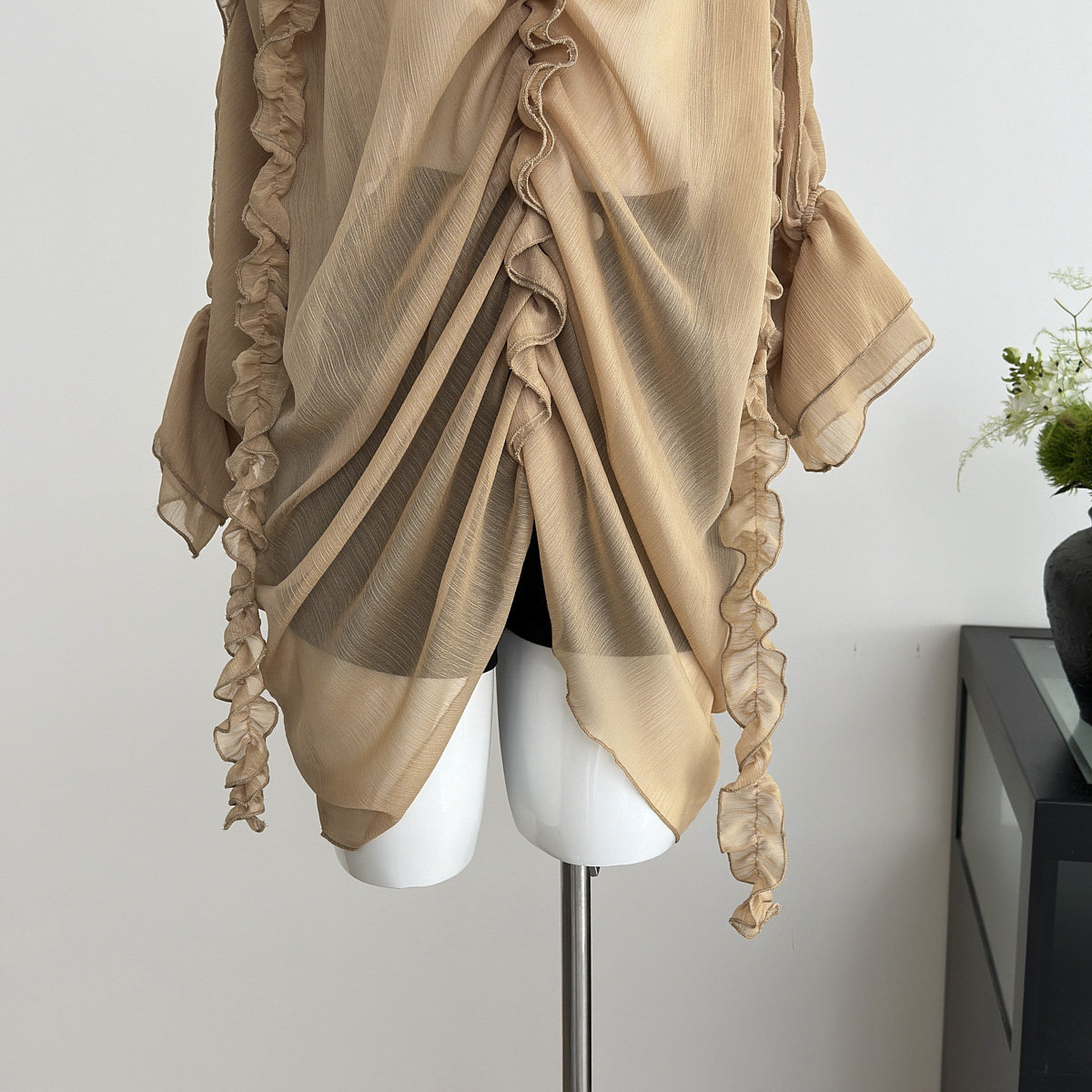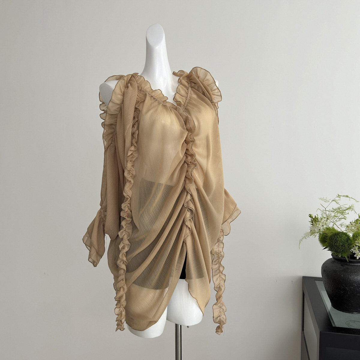 FuunJ 香氛羅曼設計感木耳邊抽褶V領長袖襯衫女慵懶寬鬆顯瘦上衣