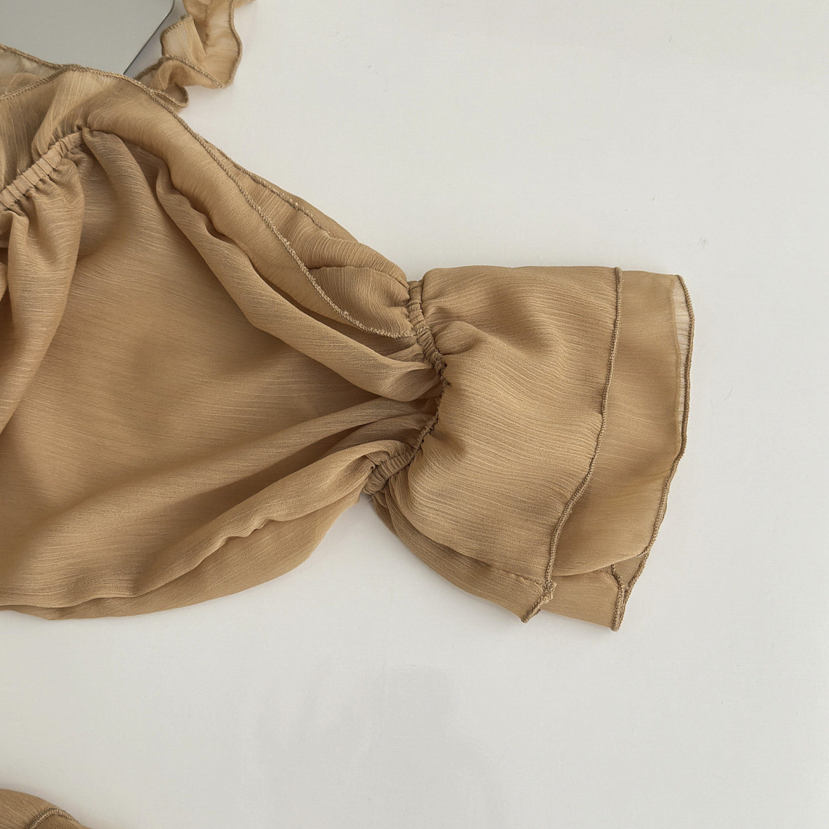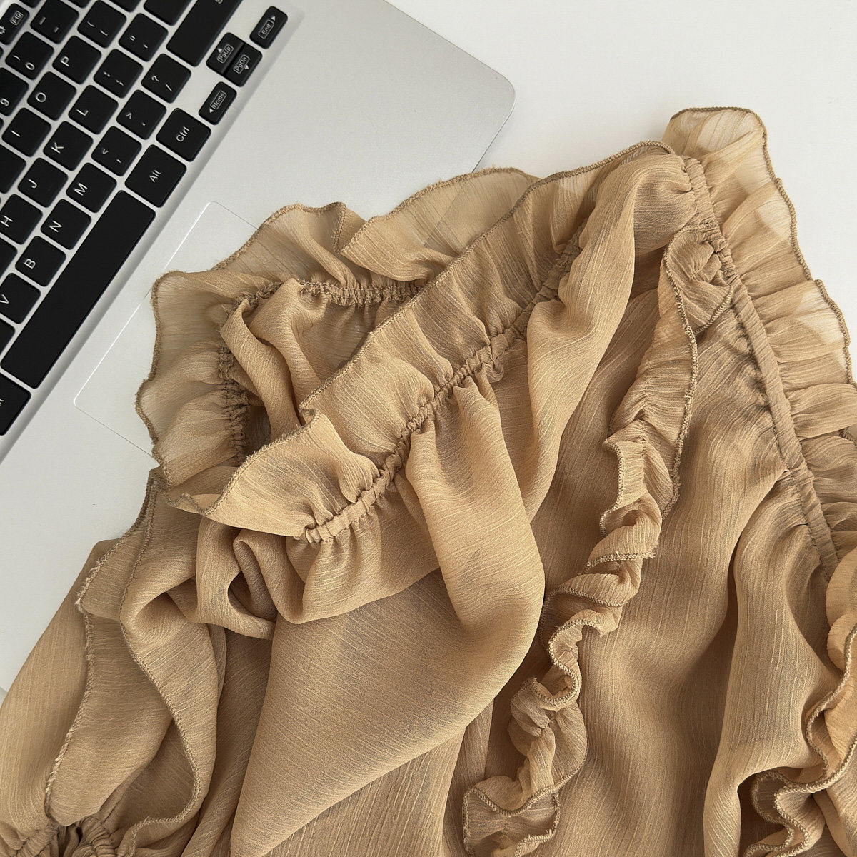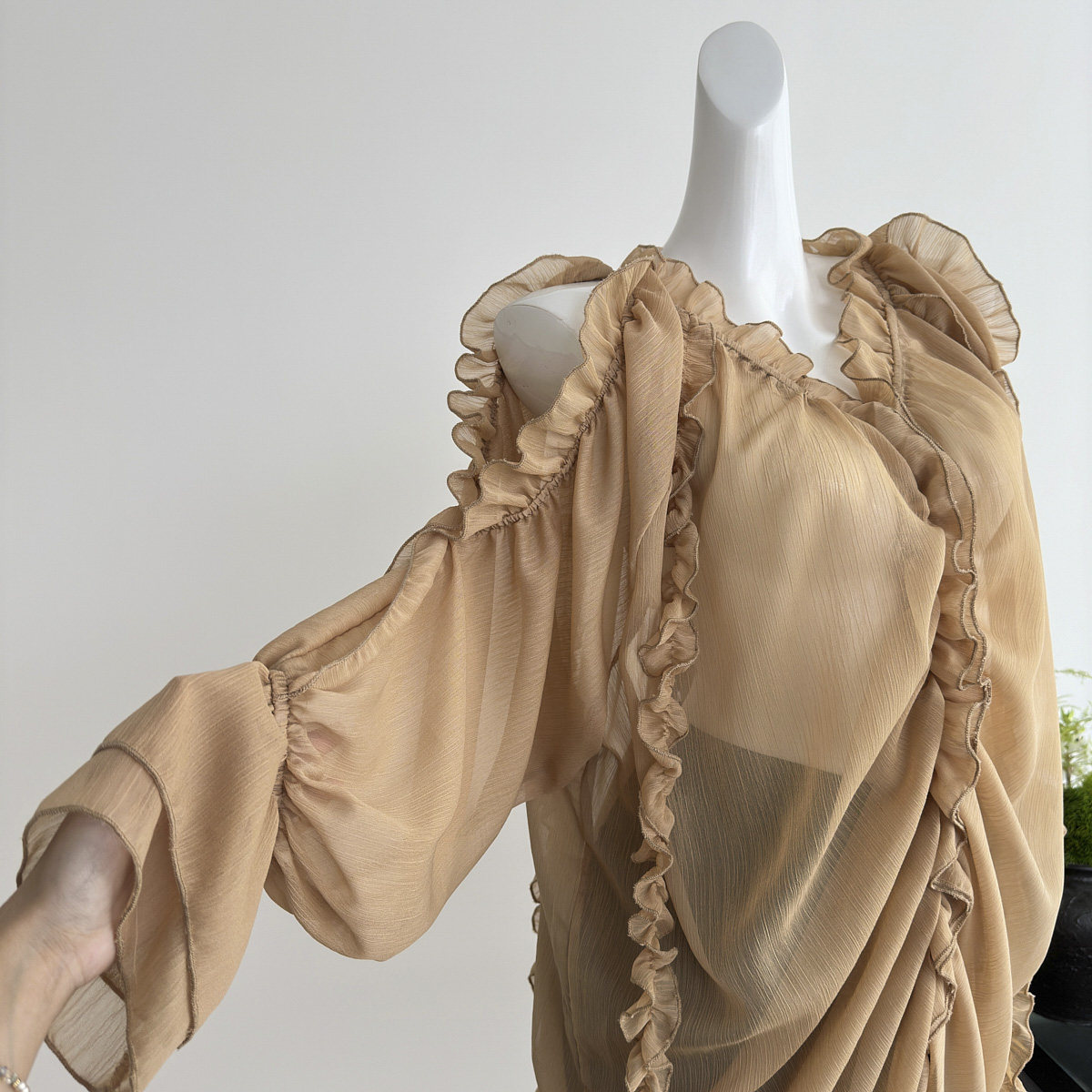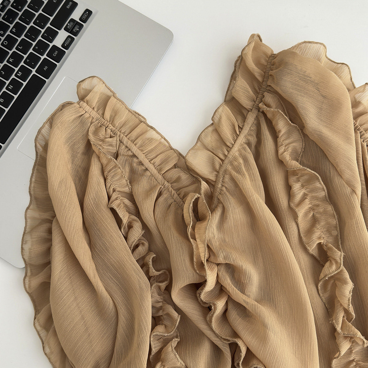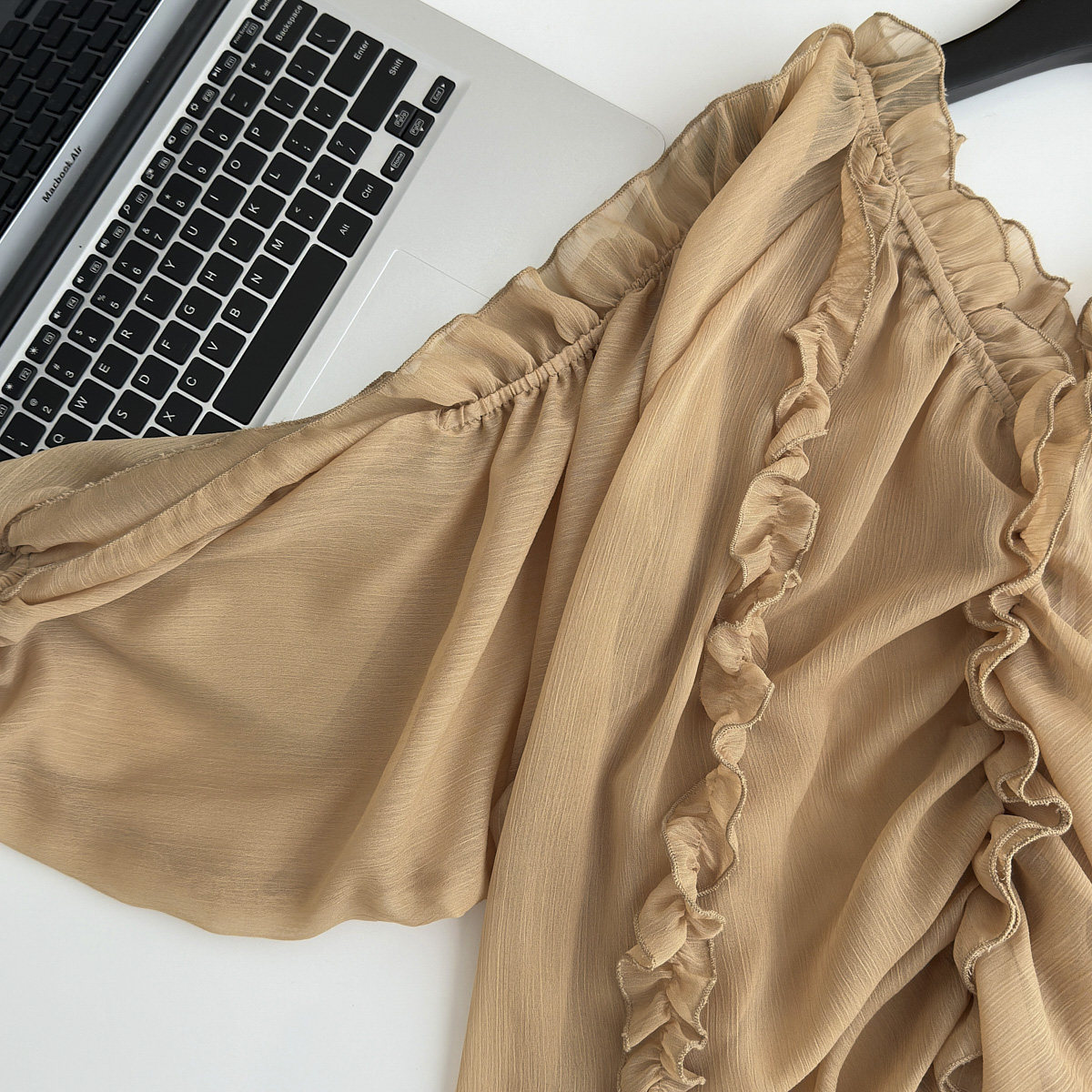 FuunJ 香氛羅曼設計感木耳邊抽褶V領長袖襯衫女慵懶寬鬆顯瘦上衣
