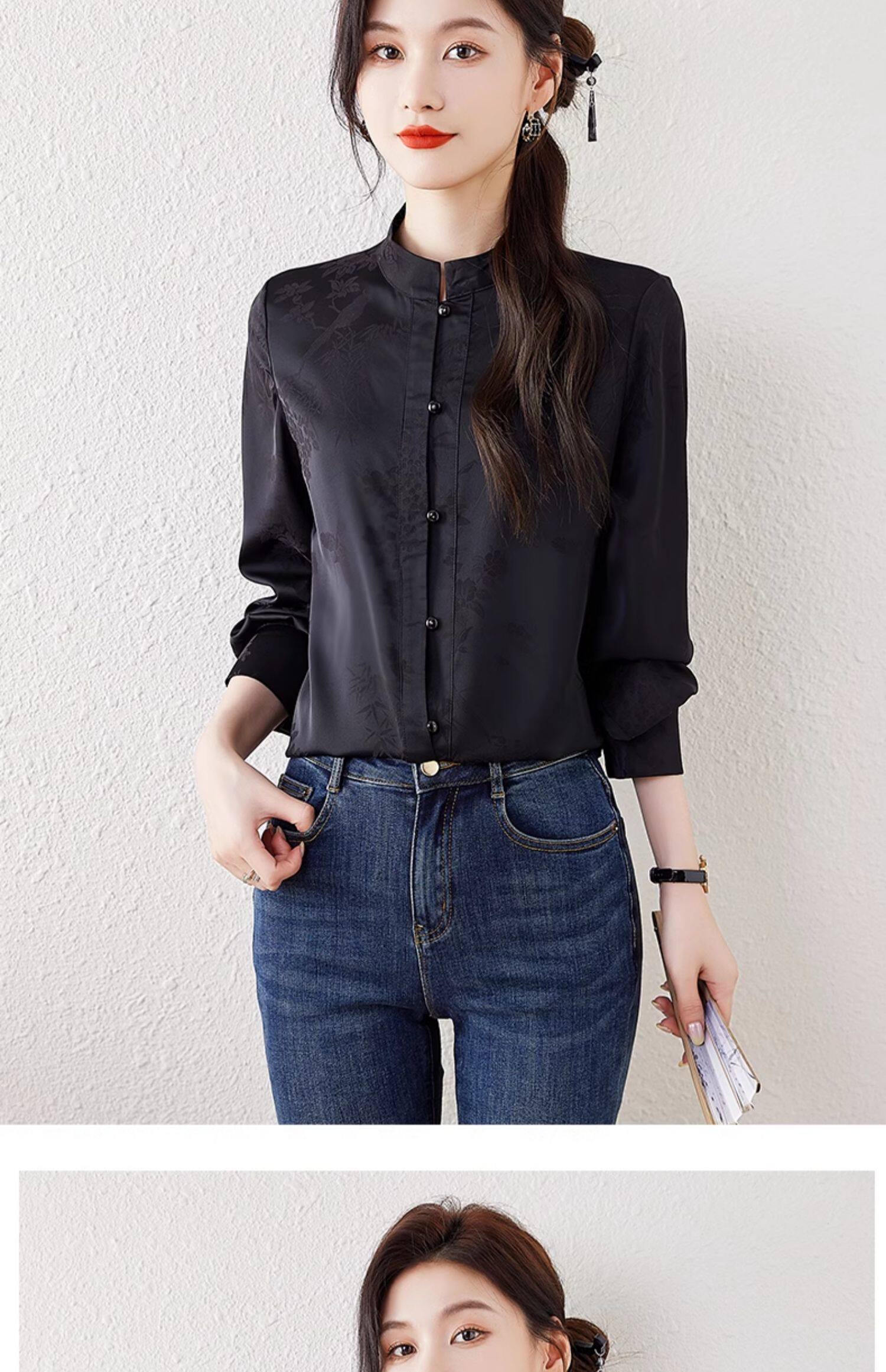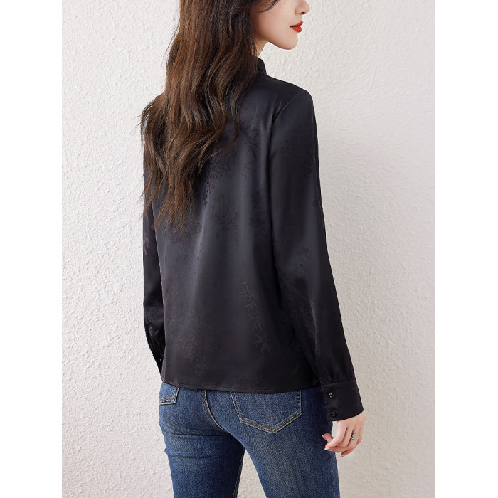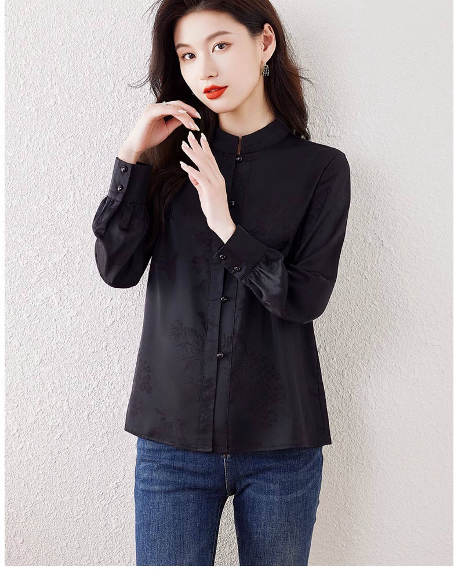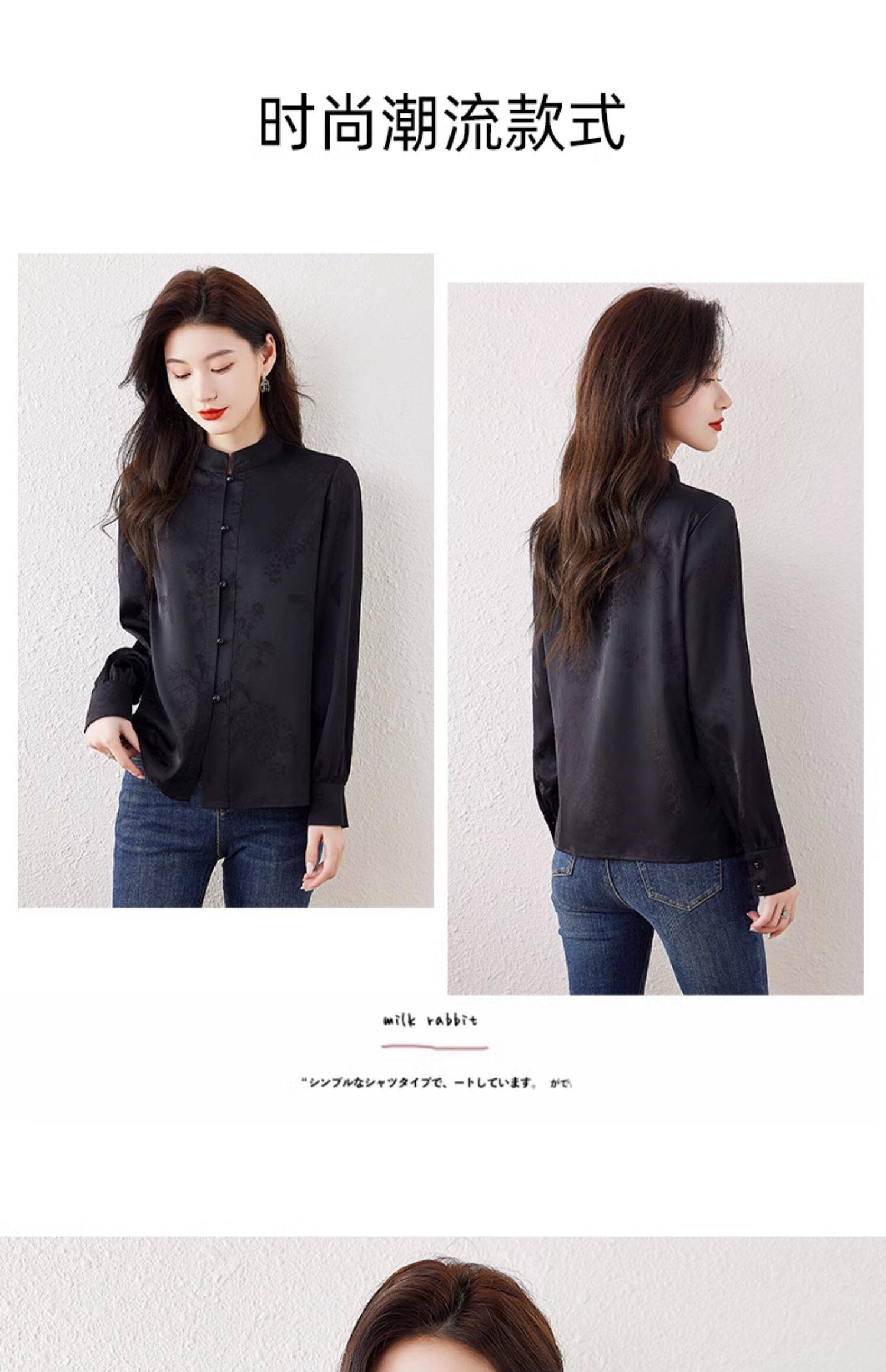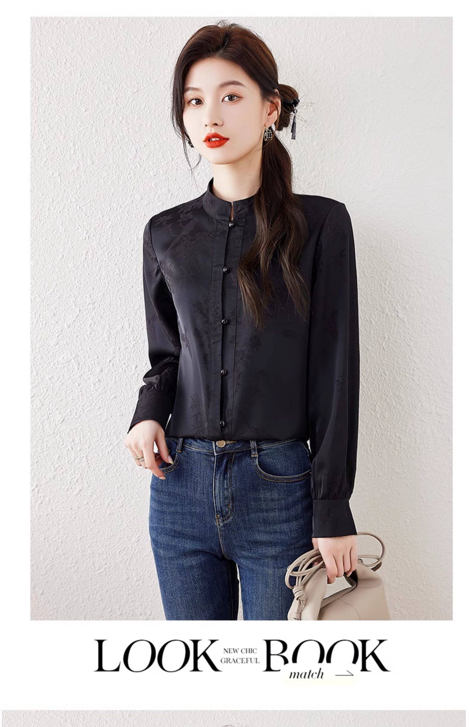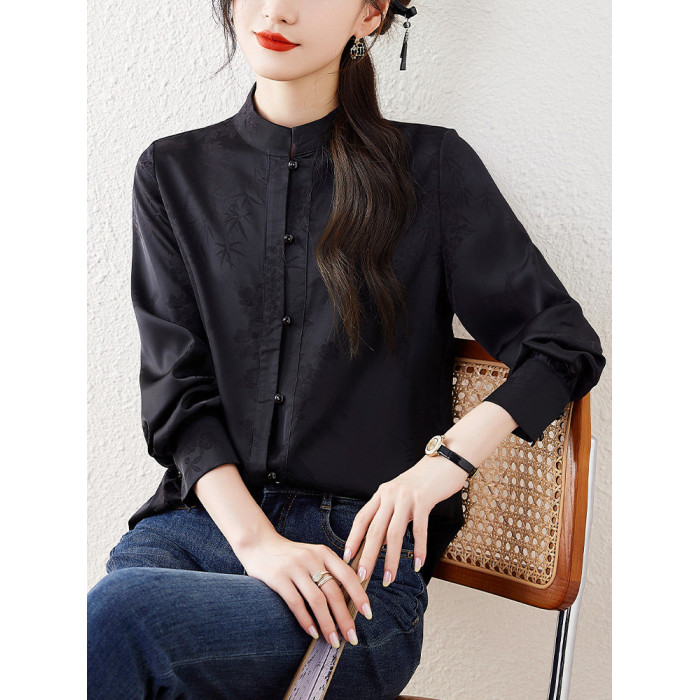 新中式國風長袖襯衫女士春裝新款復古氣質立領襯衣高級感緞面上衣