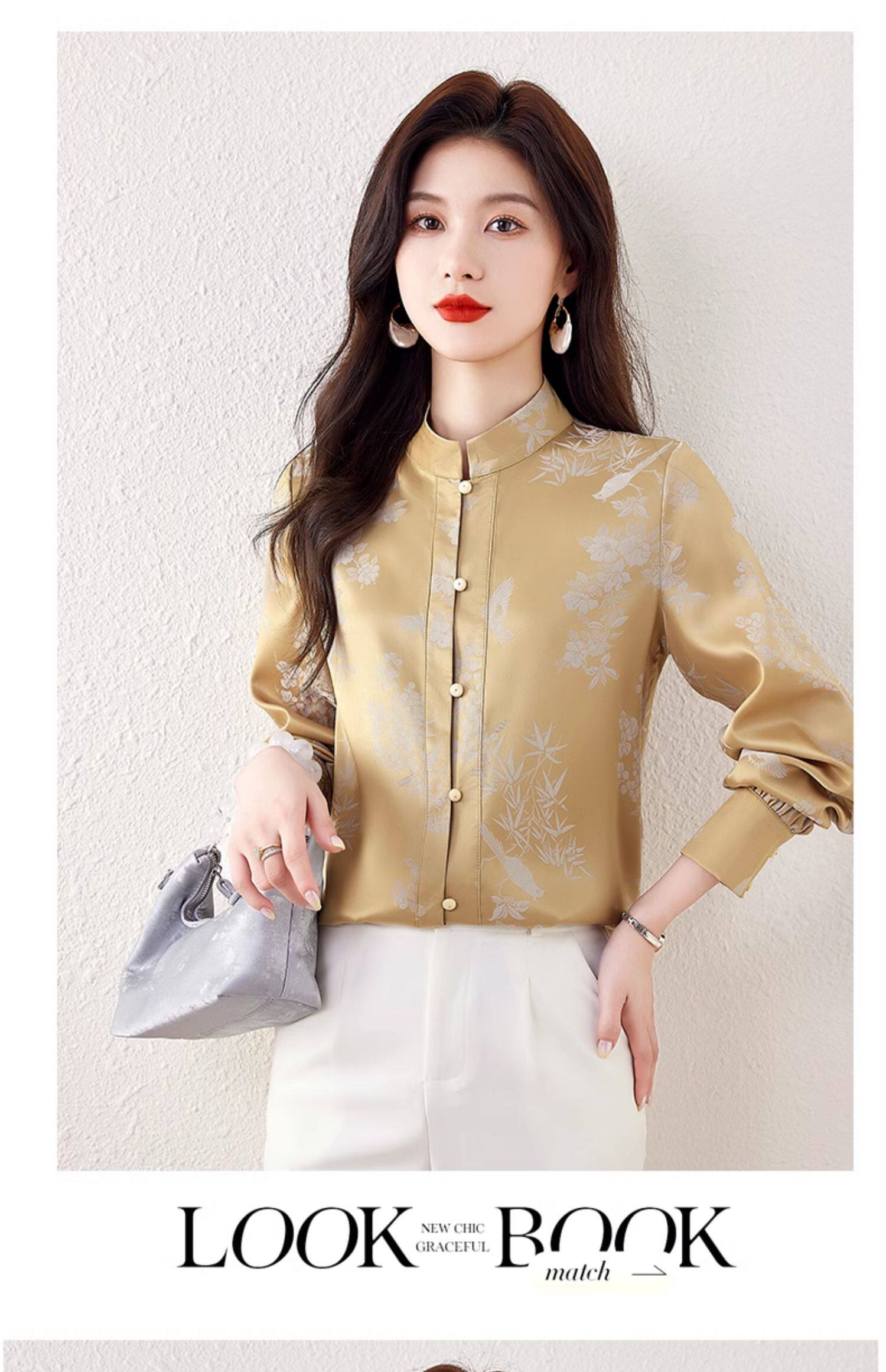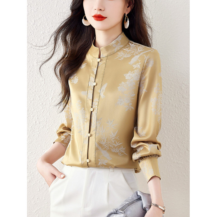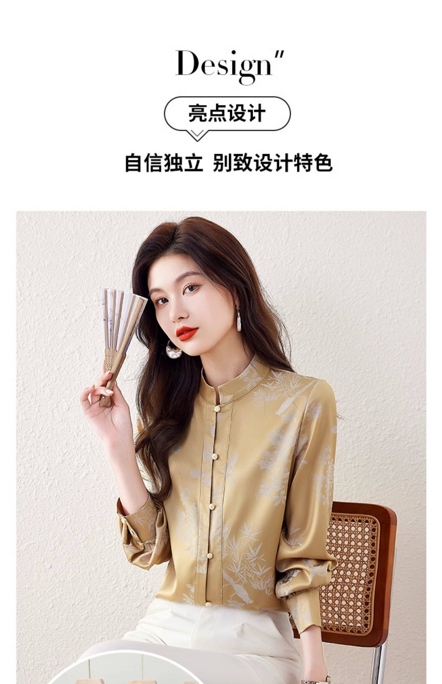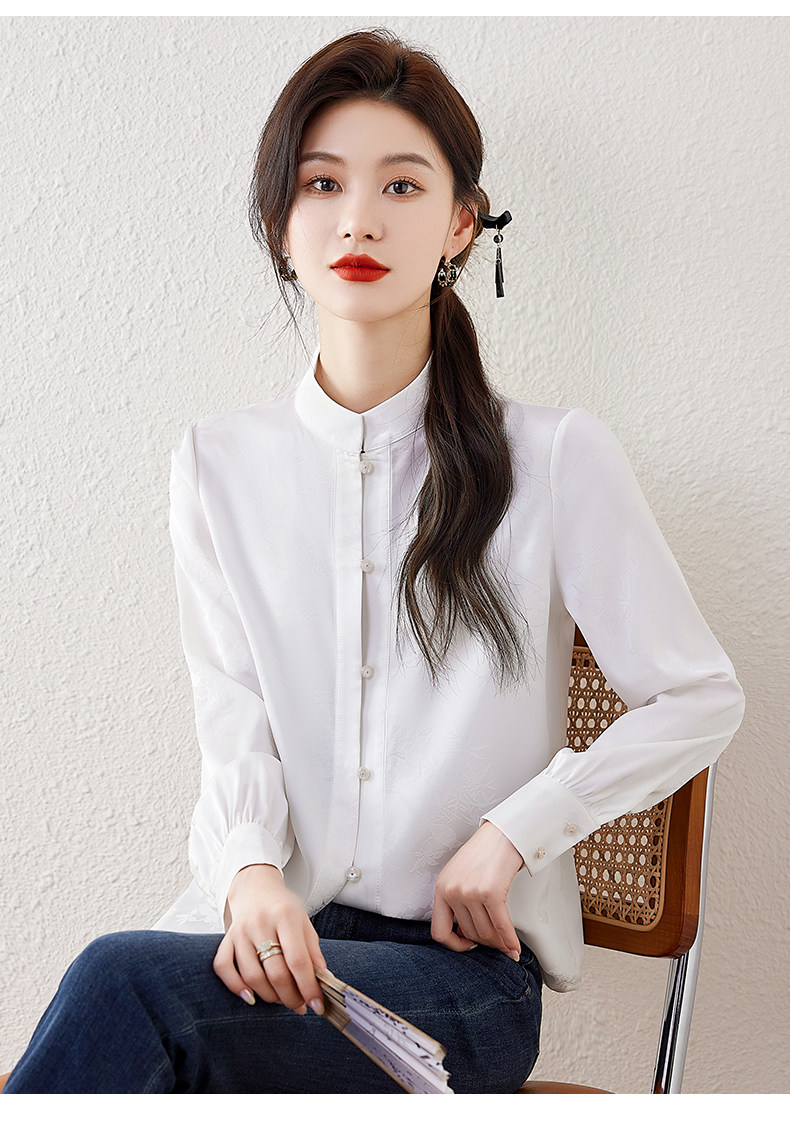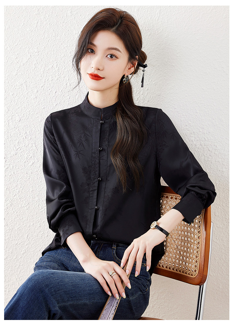 新中式國風長袖襯衫女士春裝新款復古氣質立領襯衣高級感緞面上衣