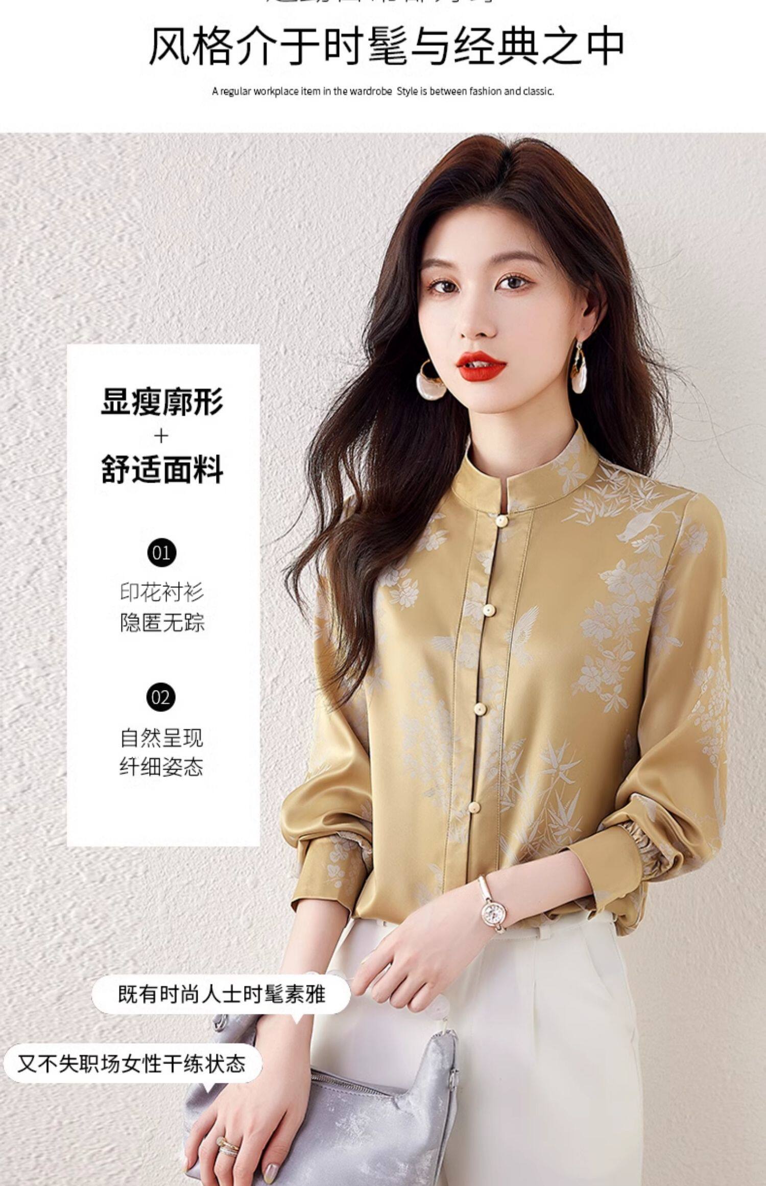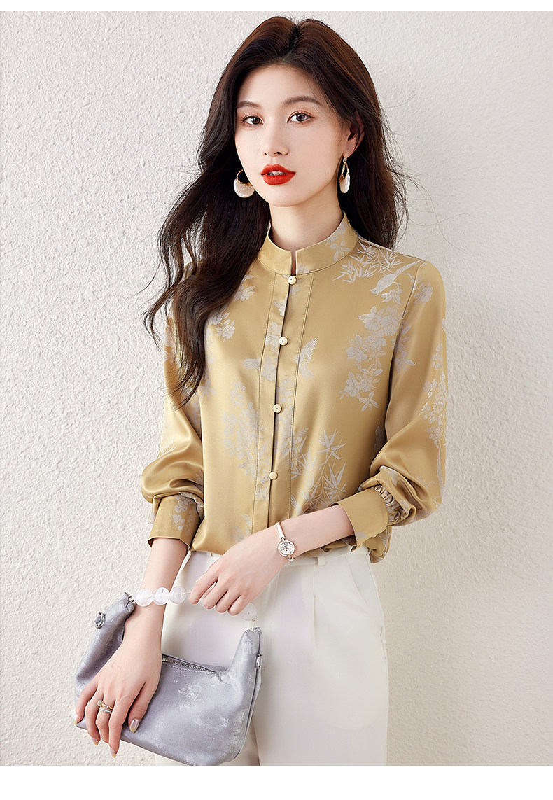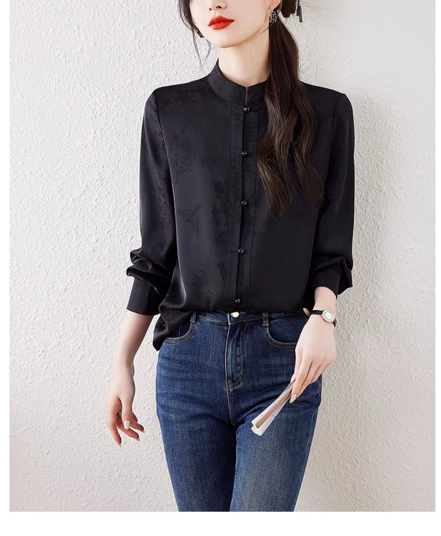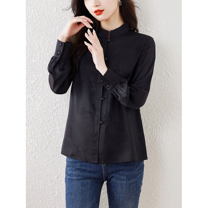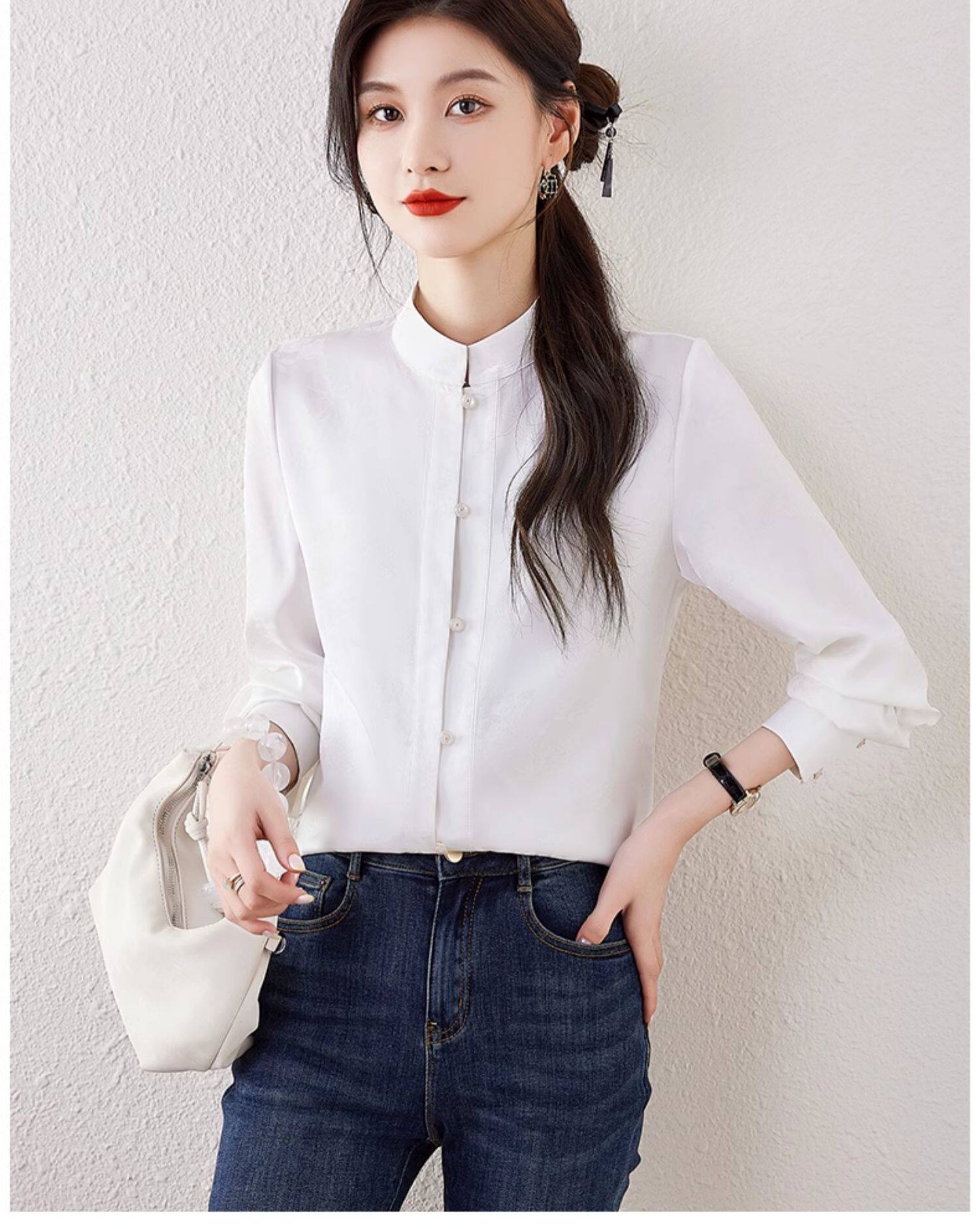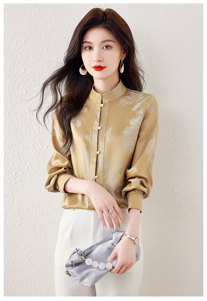 新中式國風長袖襯衫女士春裝新款復古氣質立領襯衣高級感緞面上衣