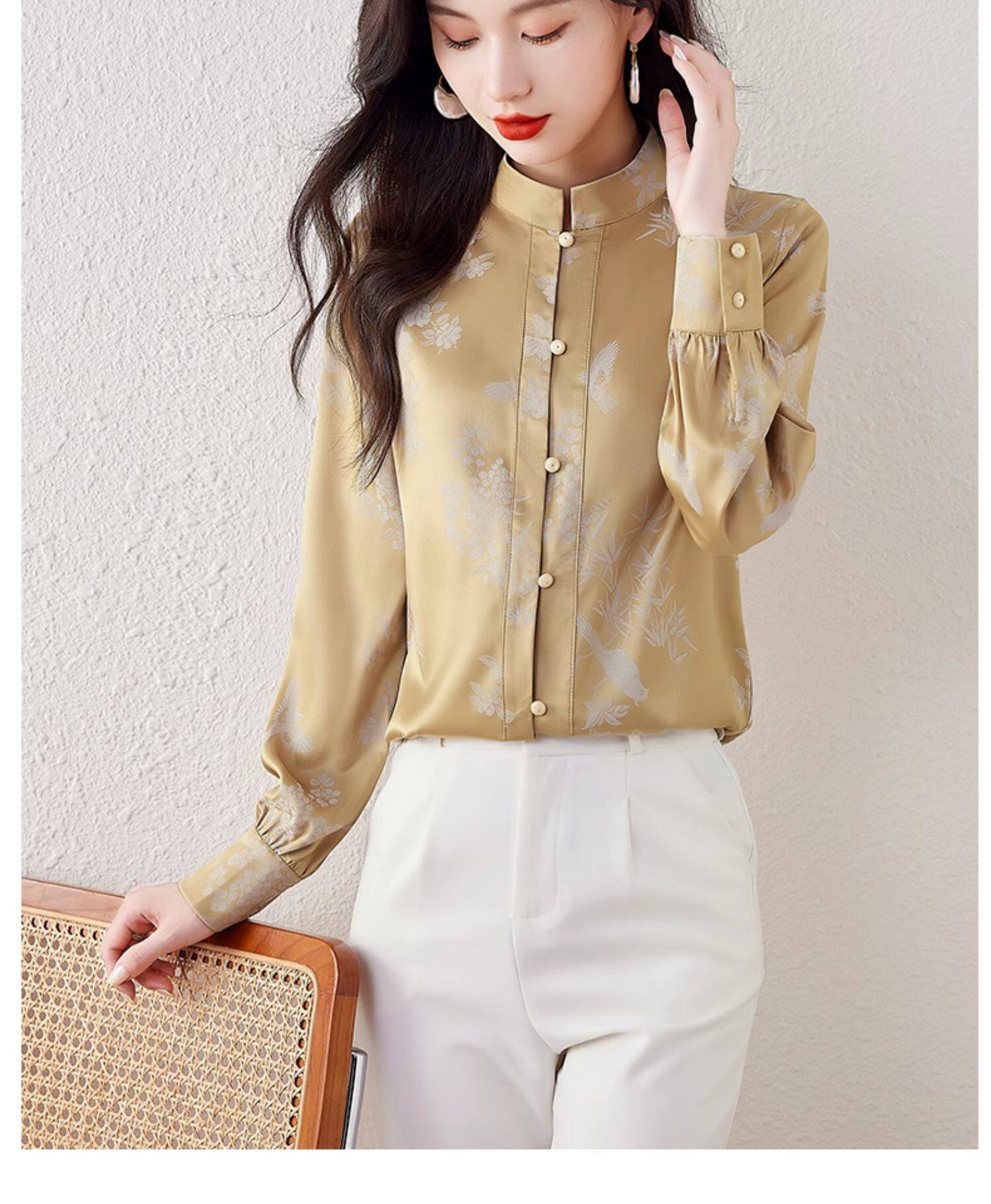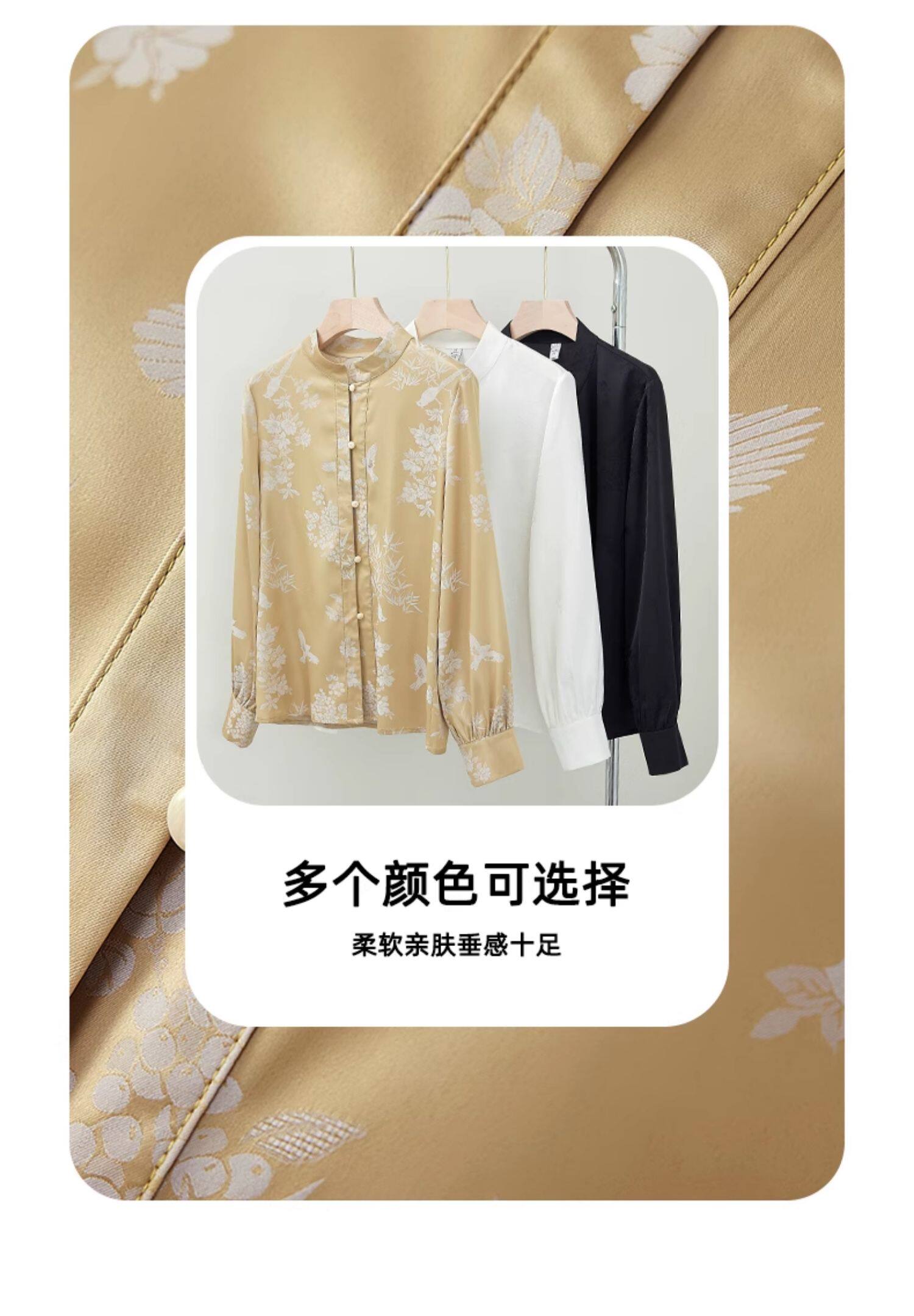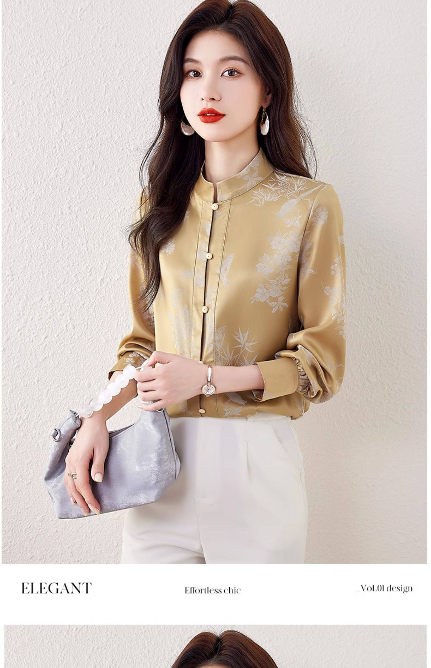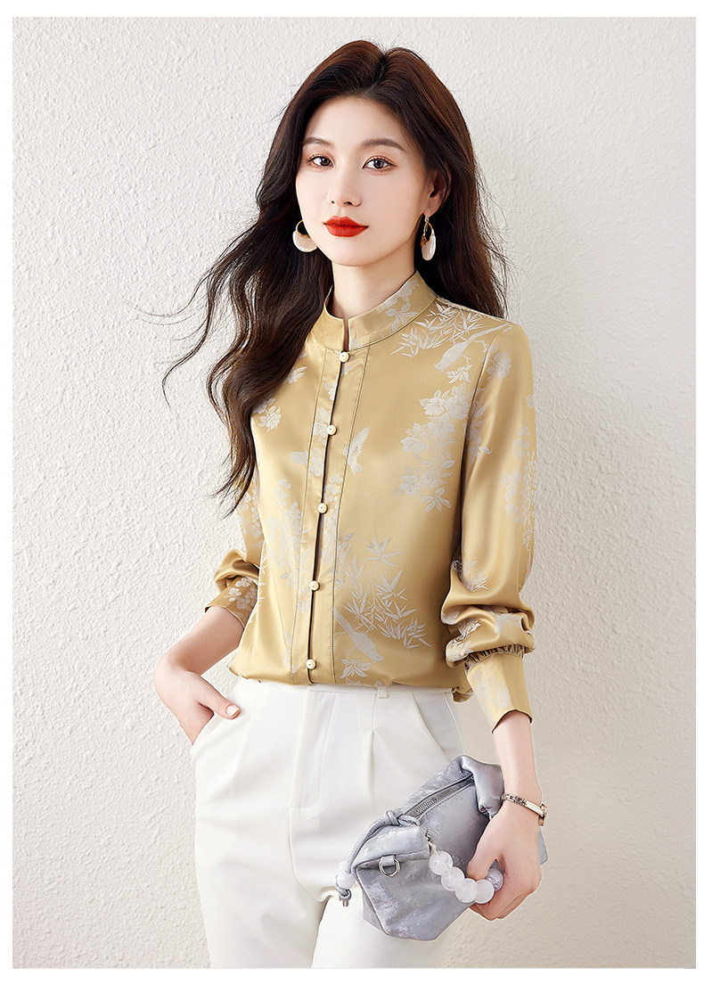 新中式國風長袖襯衫女士春裝新款復古氣質立領襯衣高級感緞面上衣