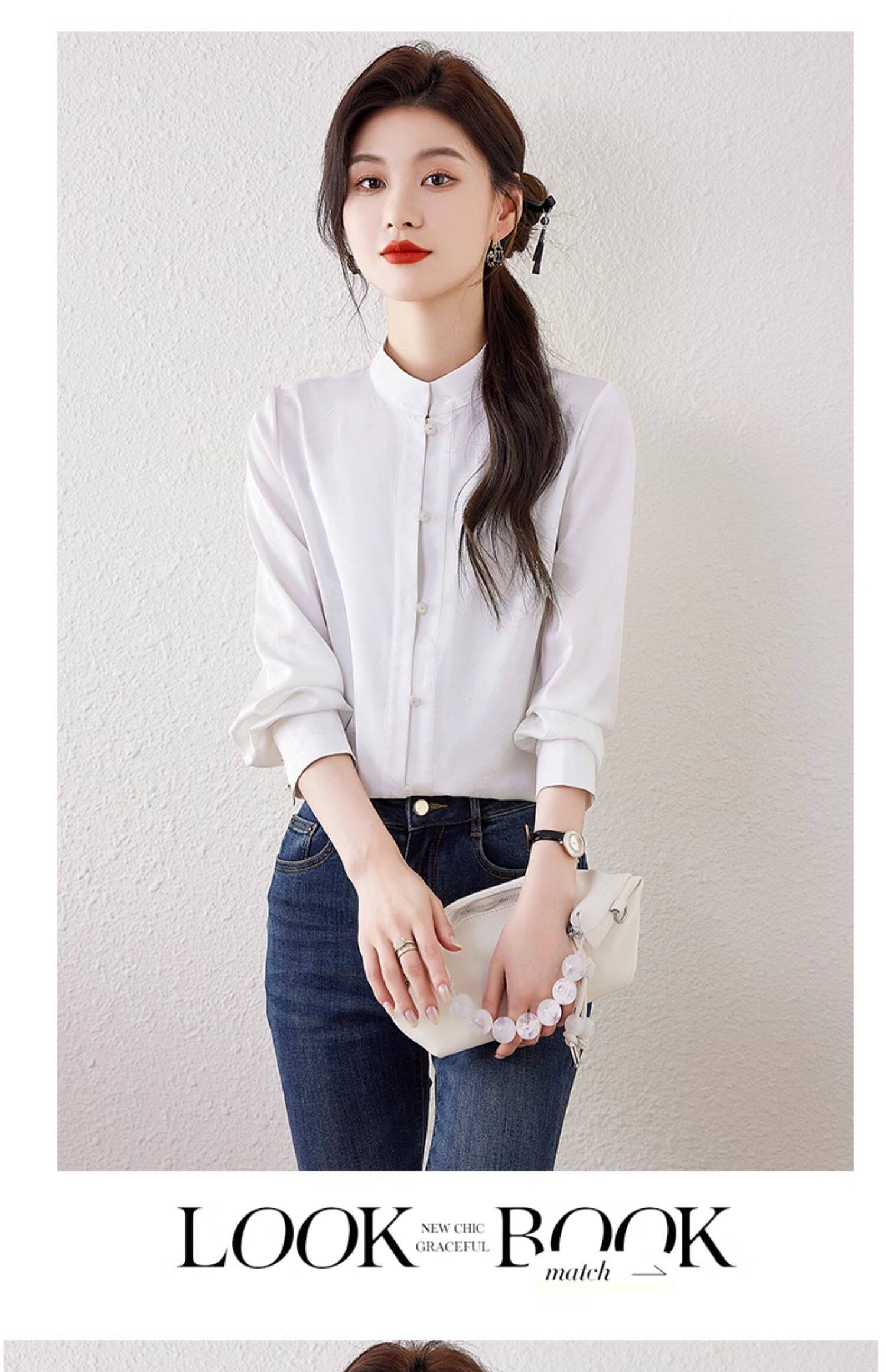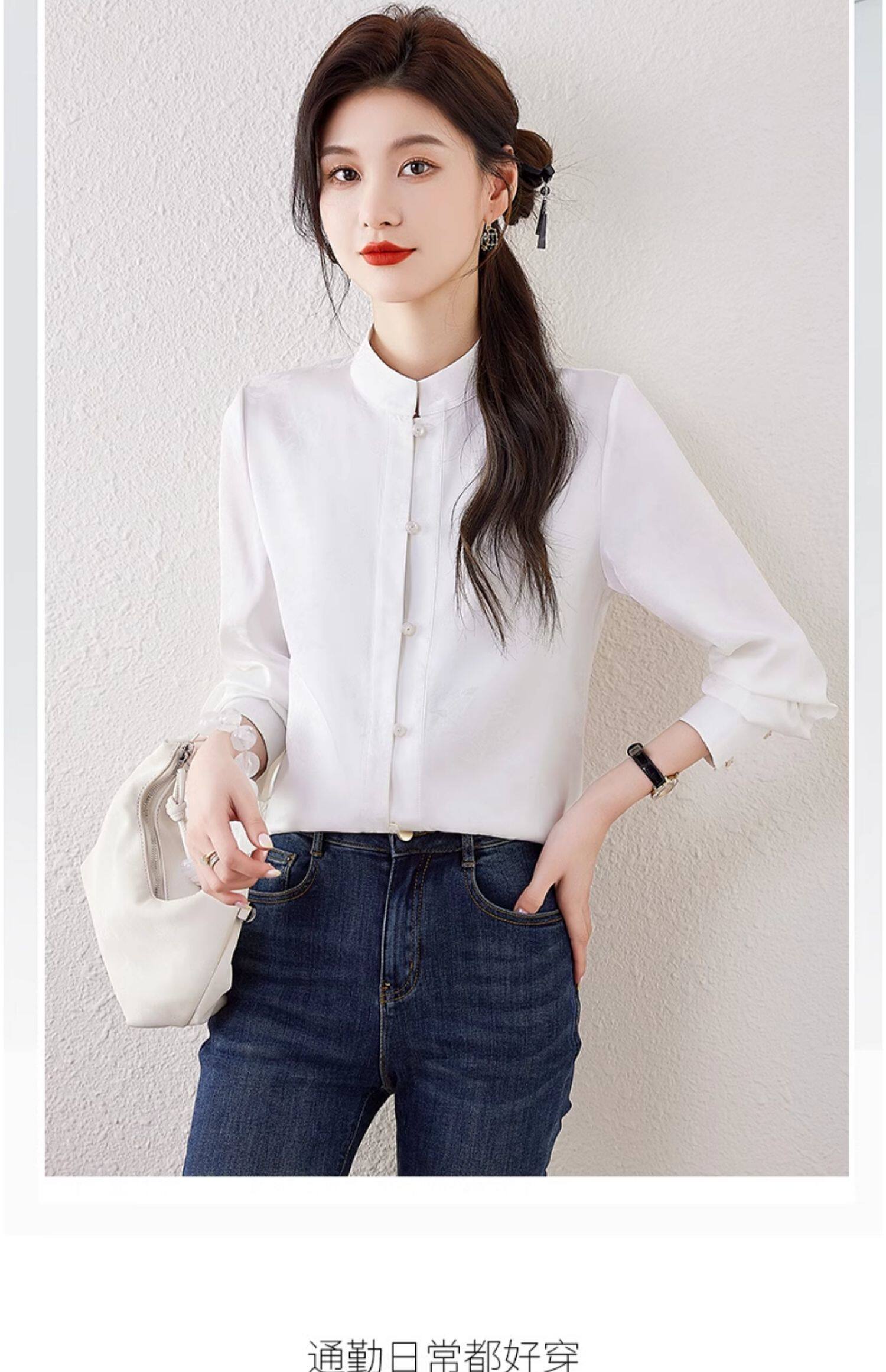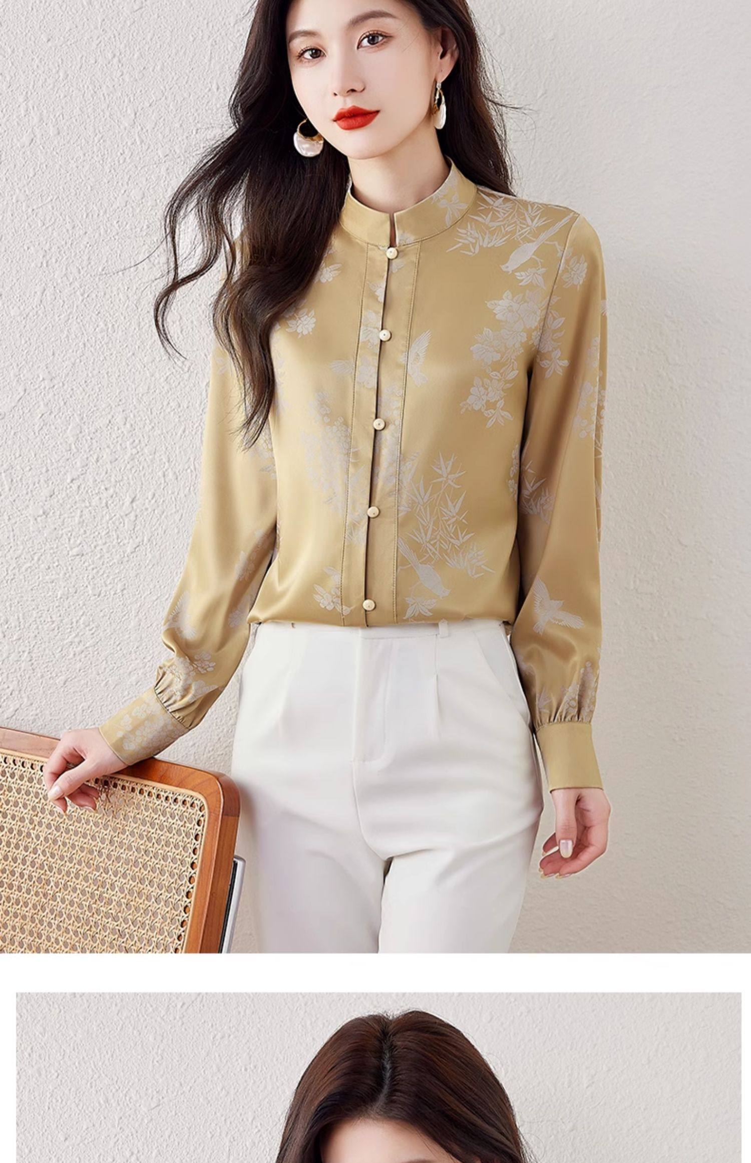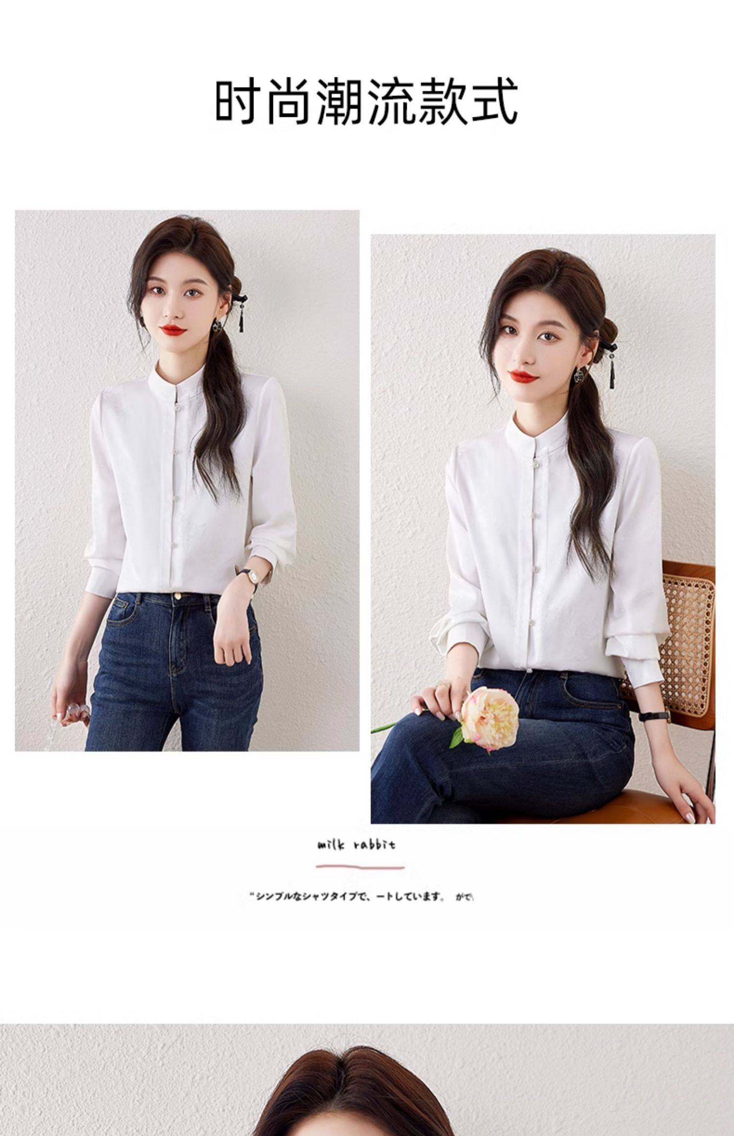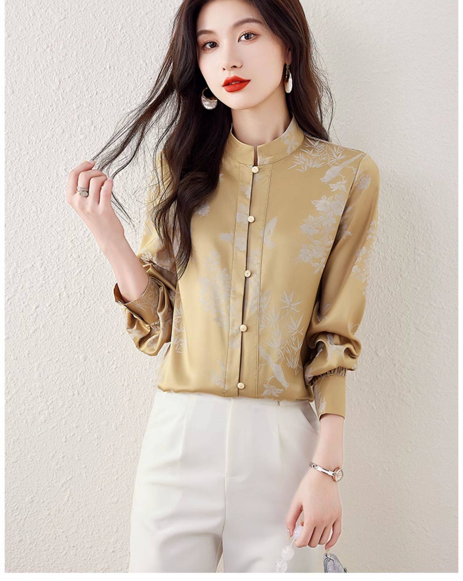 新中式國風長袖襯衫女士春裝新款復古氣質立領襯衣高級感緞面上衣