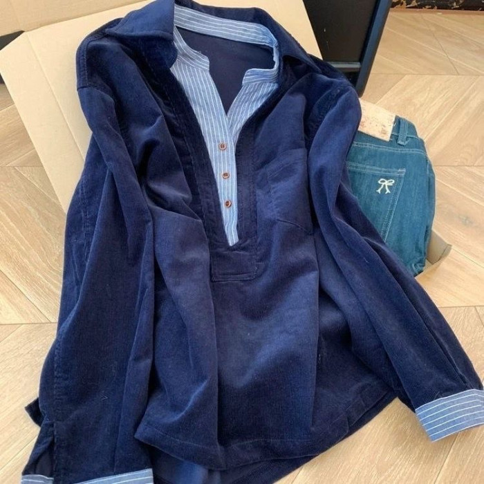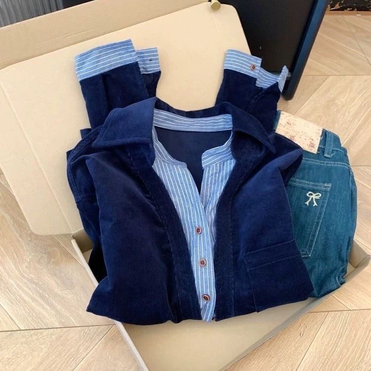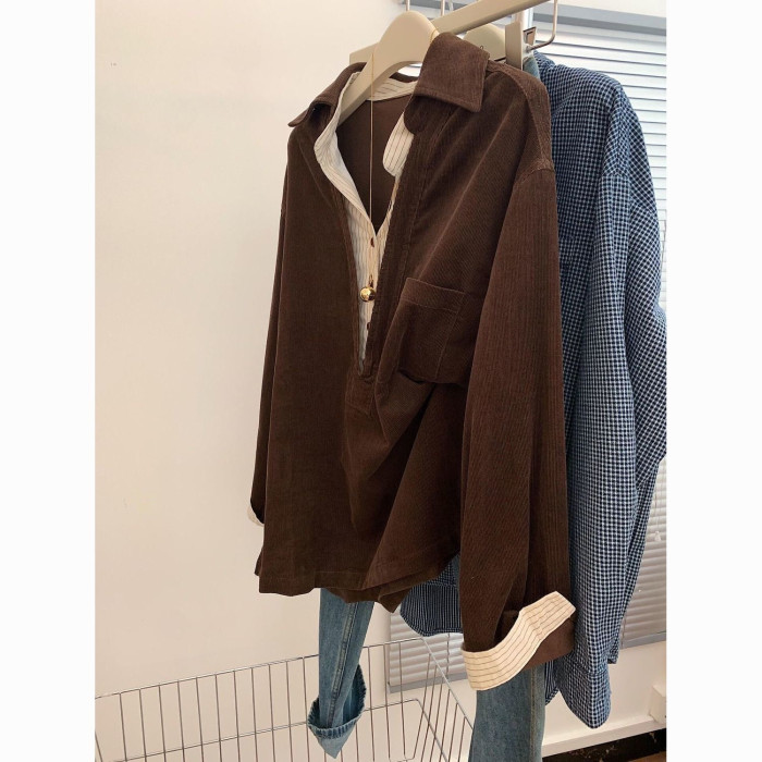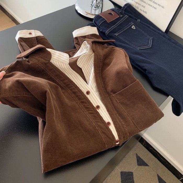 咖色繙領燈芯絨中長款假兩件條紋拼接襯衫女士設計感小衆寬鬆上衣