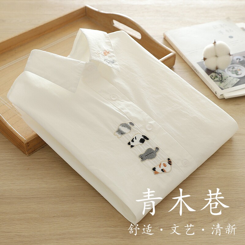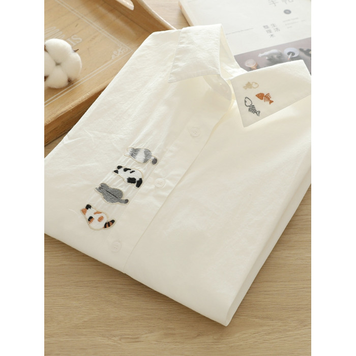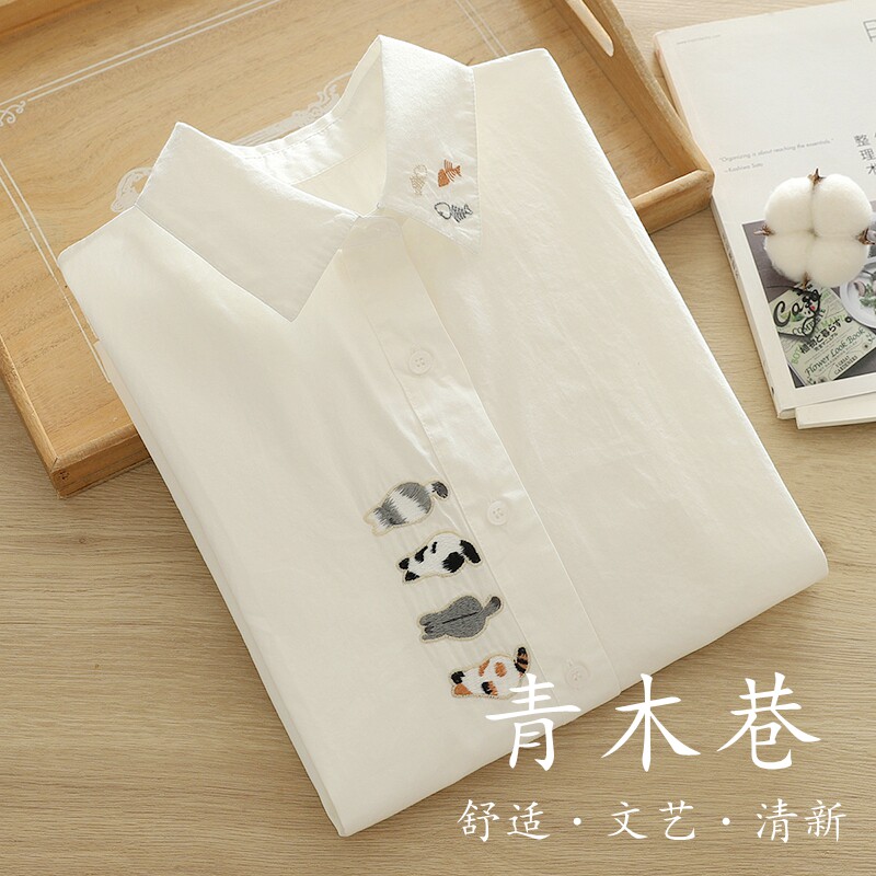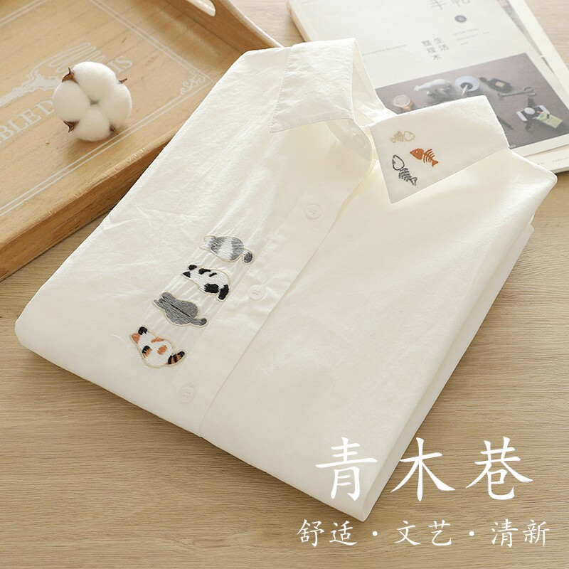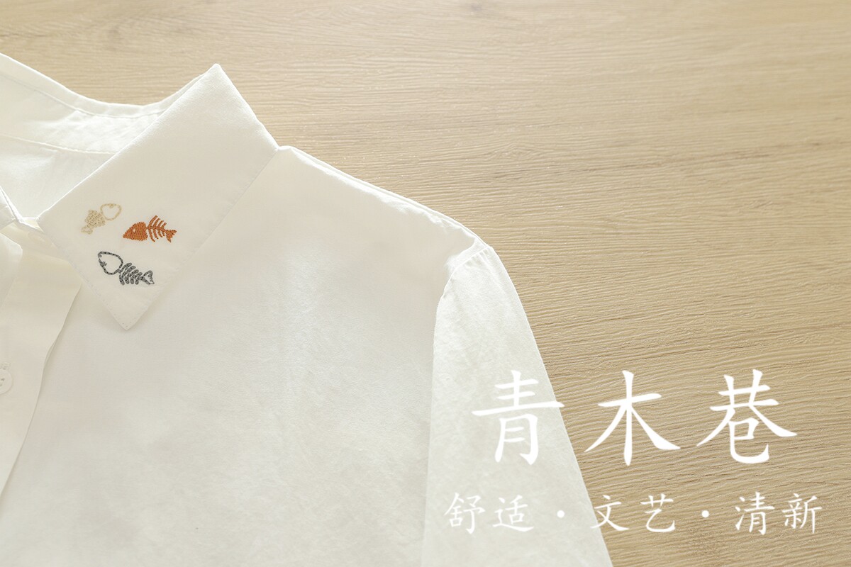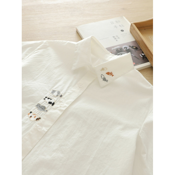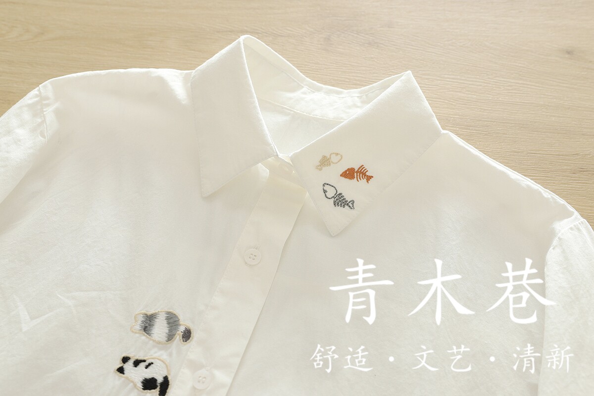 卡通刺綉貓咪小魚寬鬆純棉文藝小清新正肩白襯衫女長袖大碼學生潮
