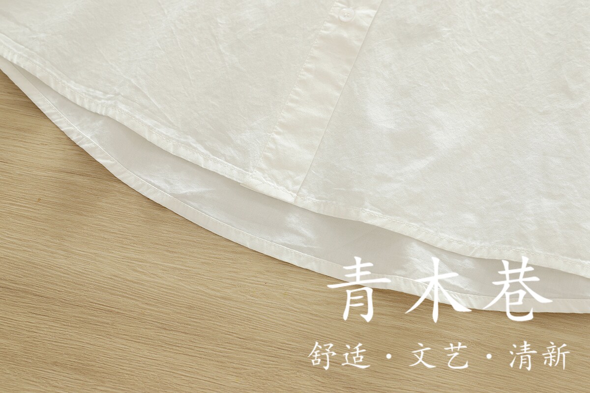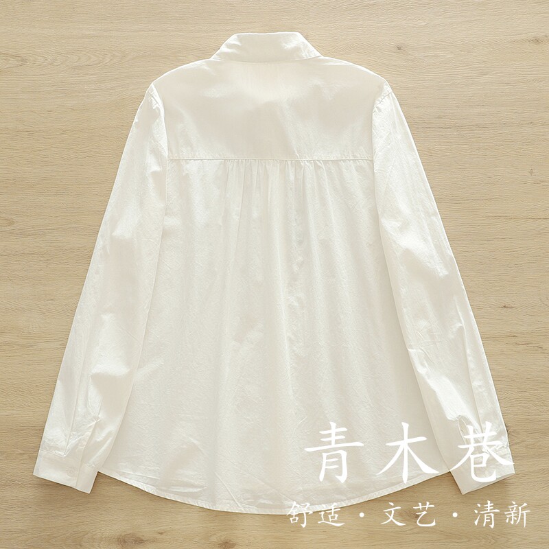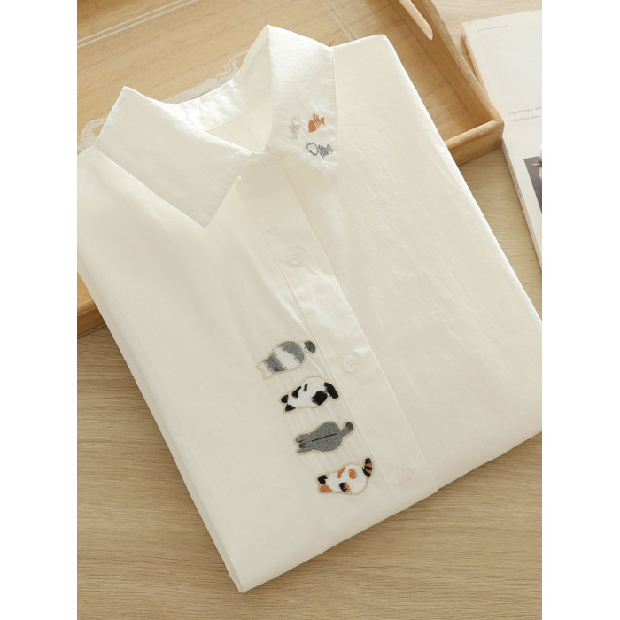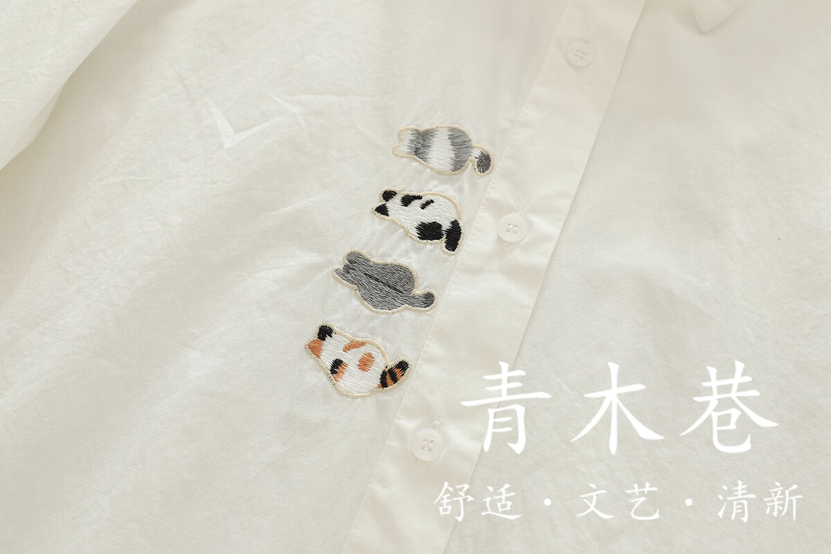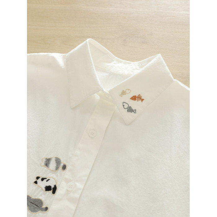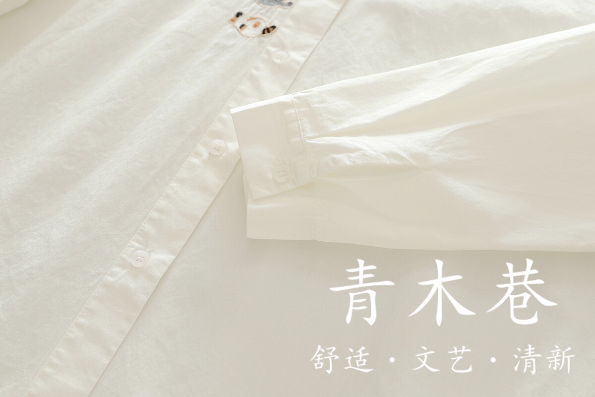 卡通刺綉貓咪小魚寬鬆純棉文藝小清新正肩白襯衫女長袖大碼學生潮